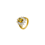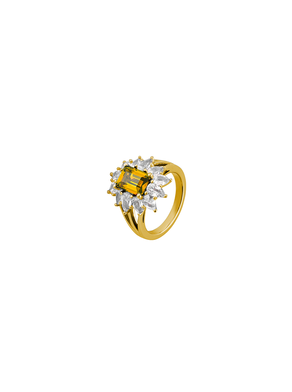 2.80 carats of pear-shaped lab-grown white sapphires or diamonds surround an 1.75 carat lab-grown yellow sapphire on the Benson Ring.