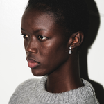 The Delphine Drop Earrings feature a 3.10 carat pear shaped lab-grown white sapphire hanging from a 0.75 carat white sapphire oval stud.