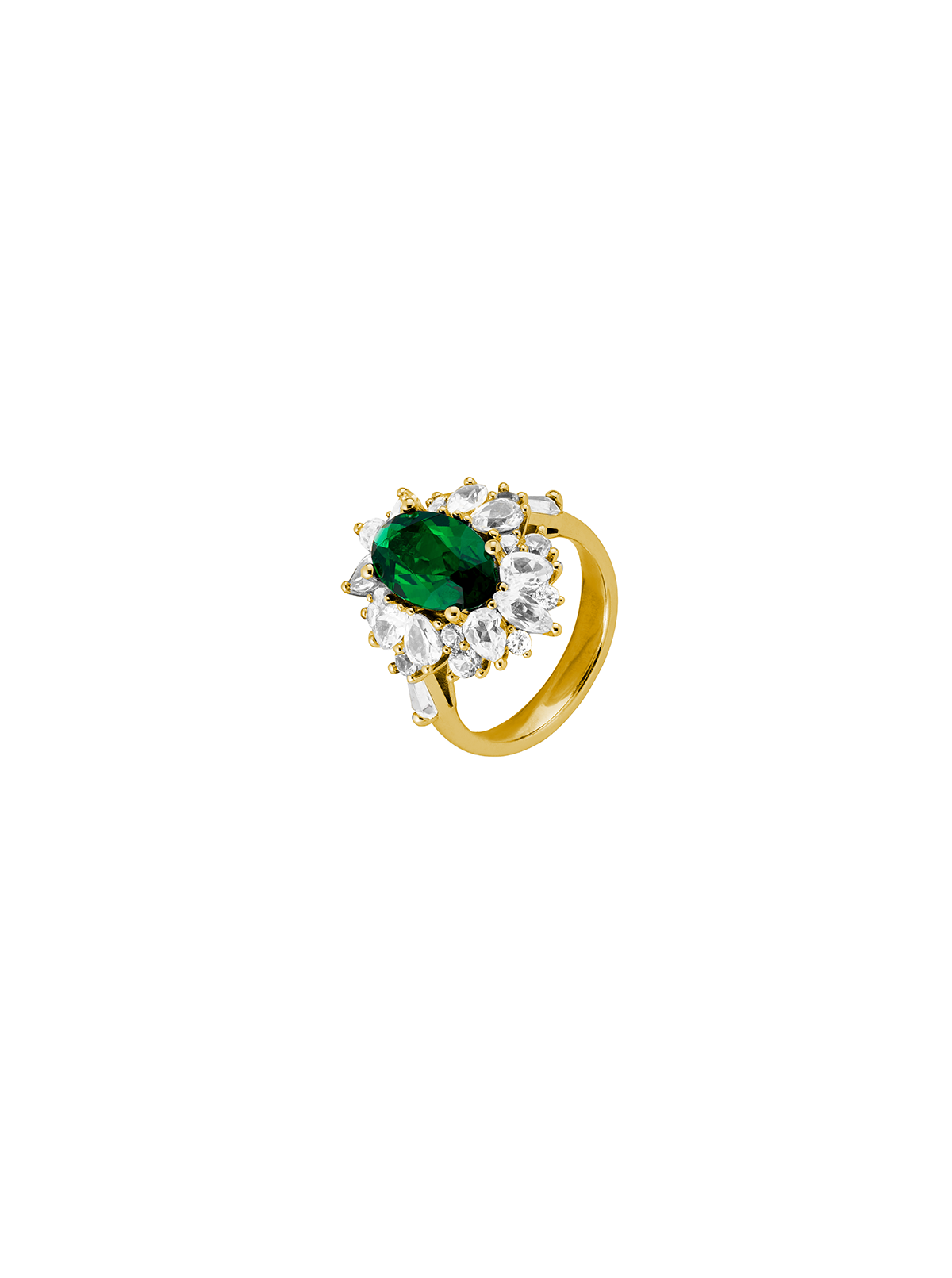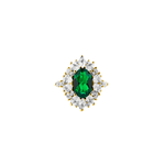 A miniature version of the Houghton Cocktail Ring, the Houghton Pinky Ring features a 3.50 carat oval cut emerald stone surrounded by a halo of marquis and pear shaped lab-grown sapphires or diamonds flanked by baguettes, totaling 2.70 carats.
