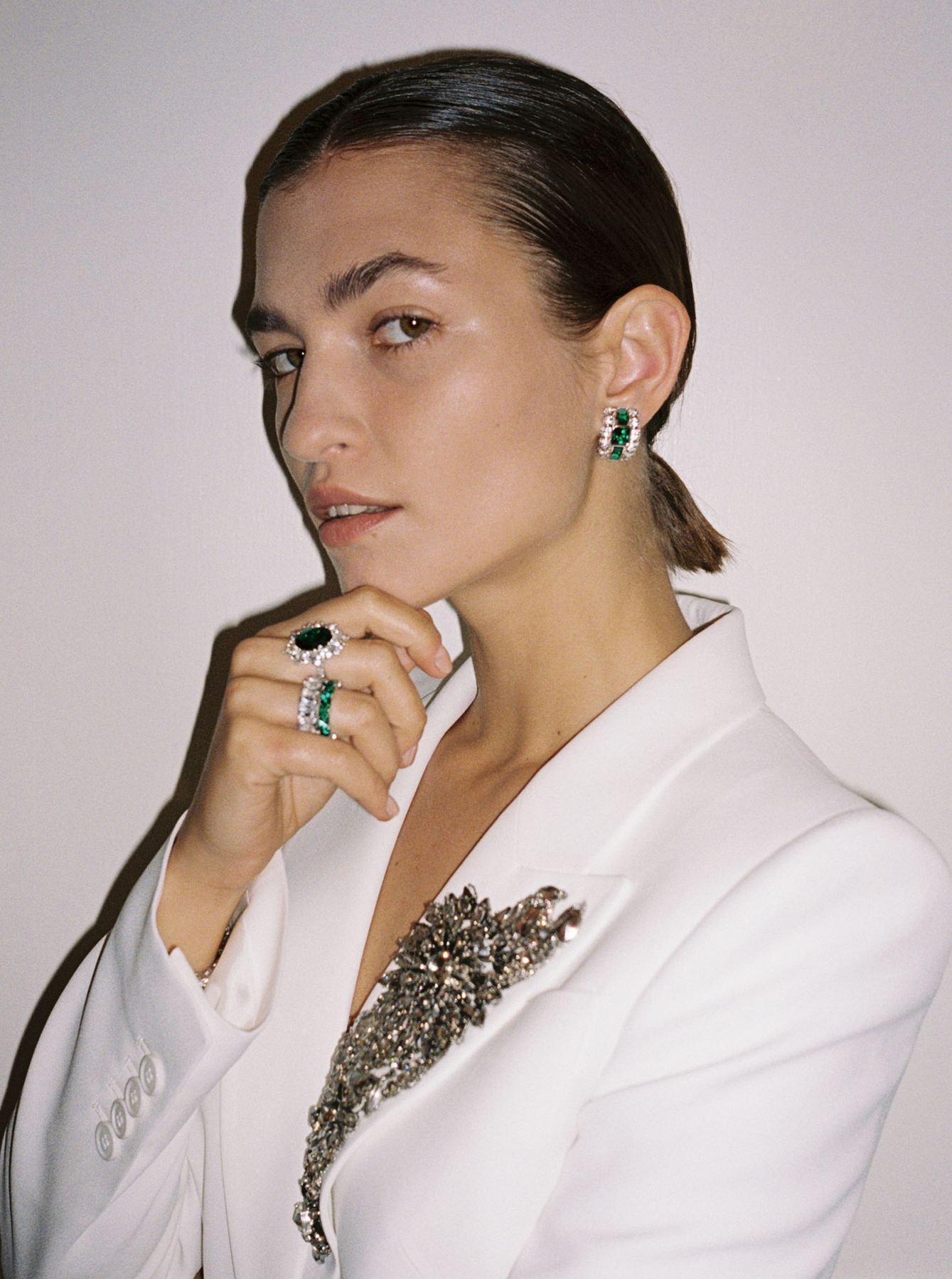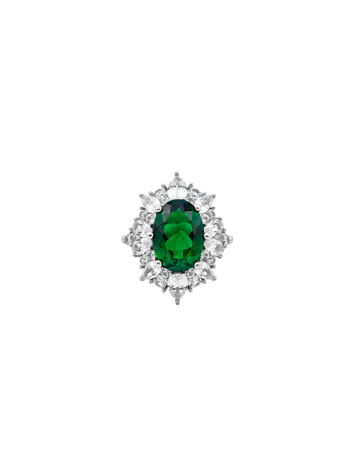 The Houghton Ring features a 5.80 carat oval shaped lab-grown emerald surrounded by a halo of pear and round white sapphires or diamonds flanked by baguette side stones, totaling 3.50 carats.
