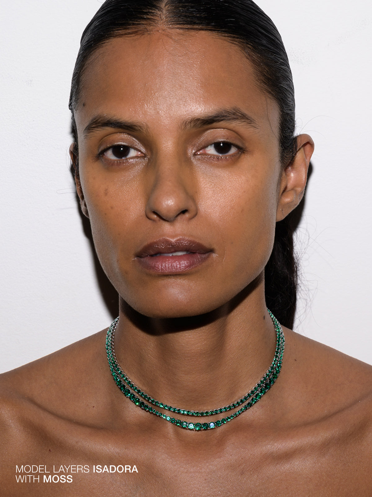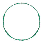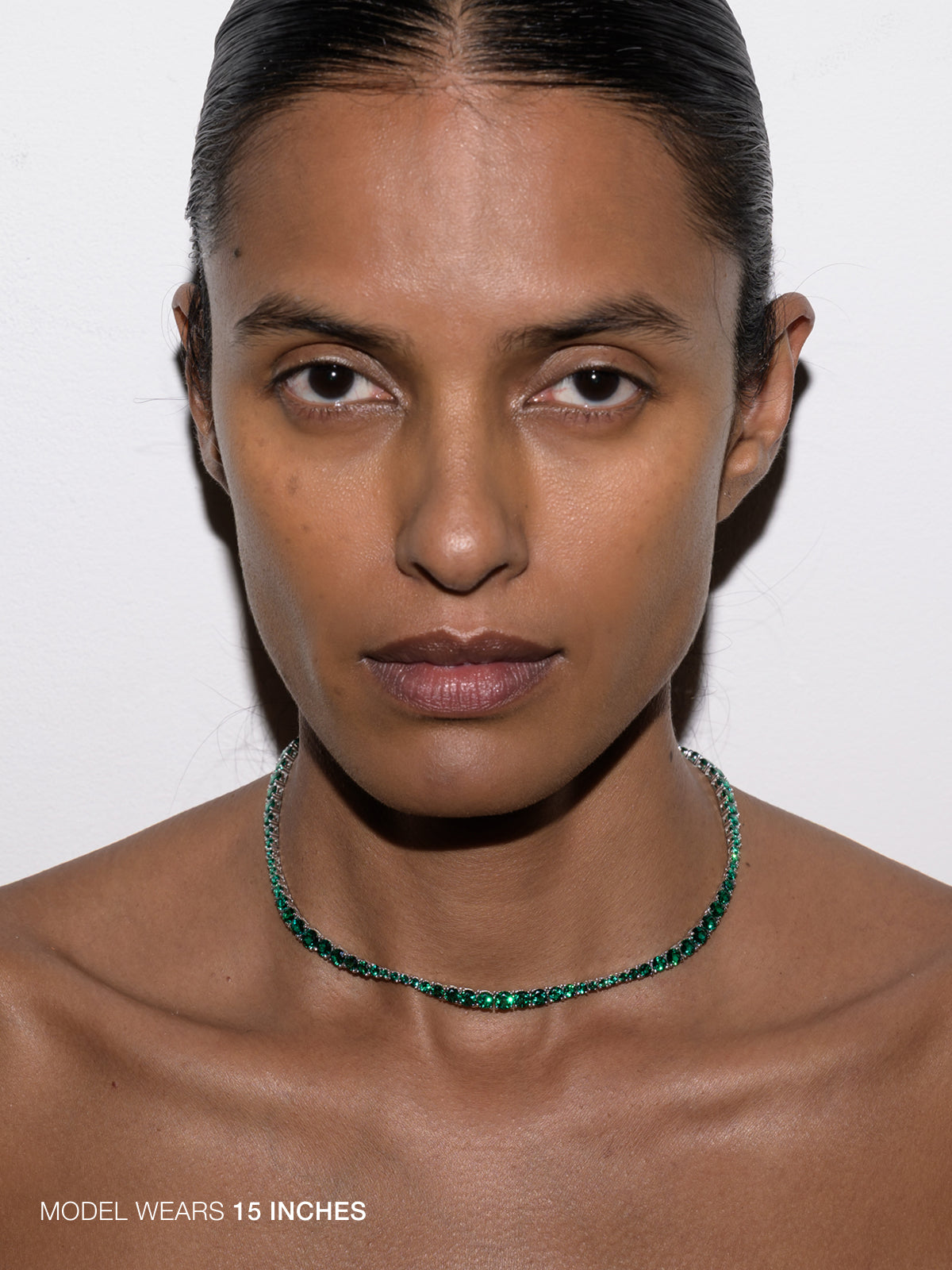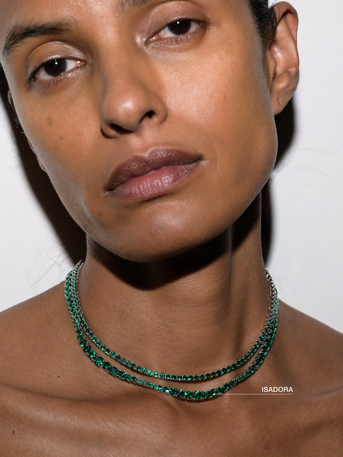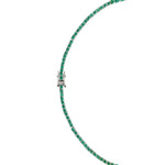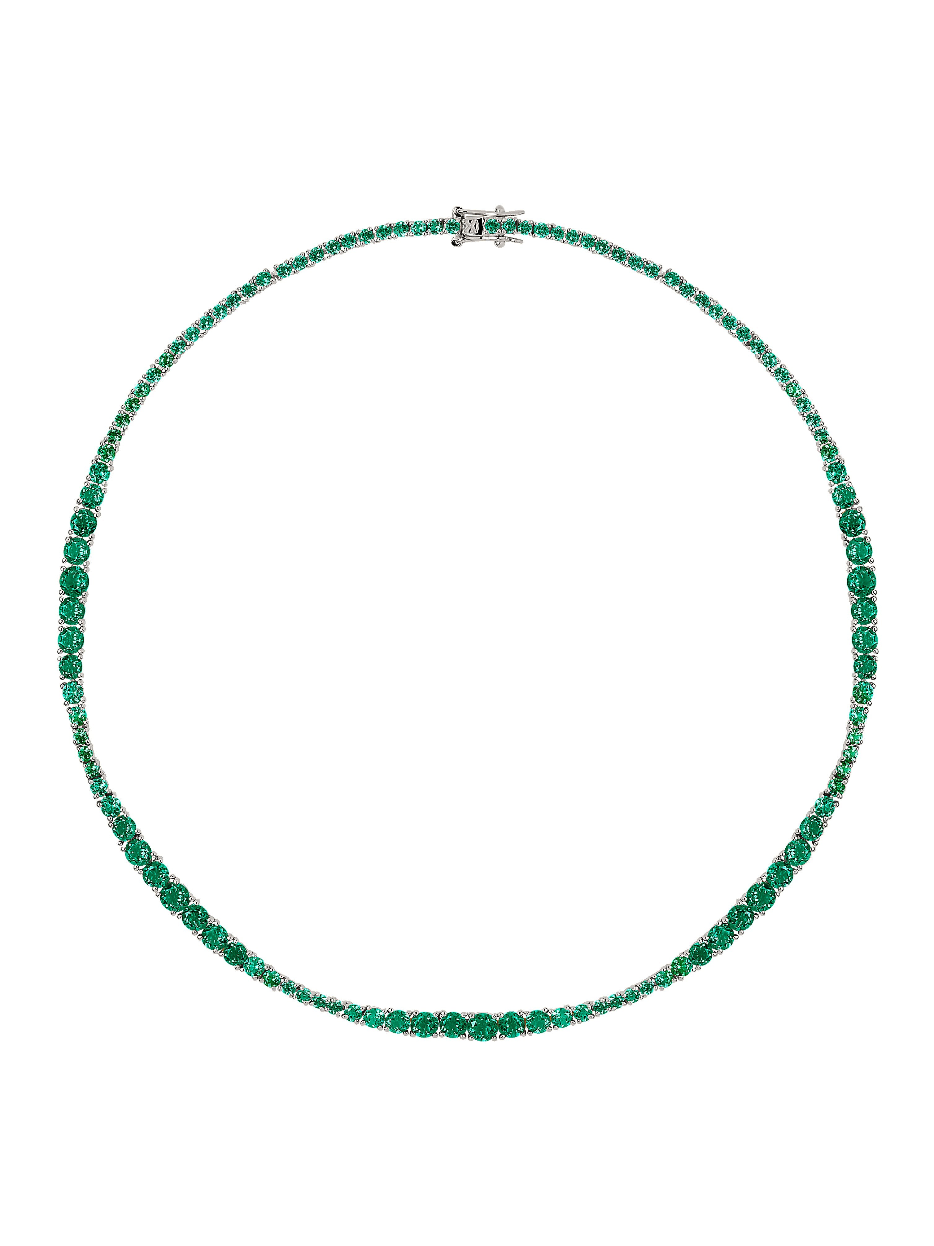 The Isadora Rivière Necklace showcases an elegant graduating silhouette of lab-grown emerald gemstones, each securely set in a classic four-prong sterling silver setting. This occasion tennis necklace is finished with a secure box clasp and reinforced with double safety hooks for added security.