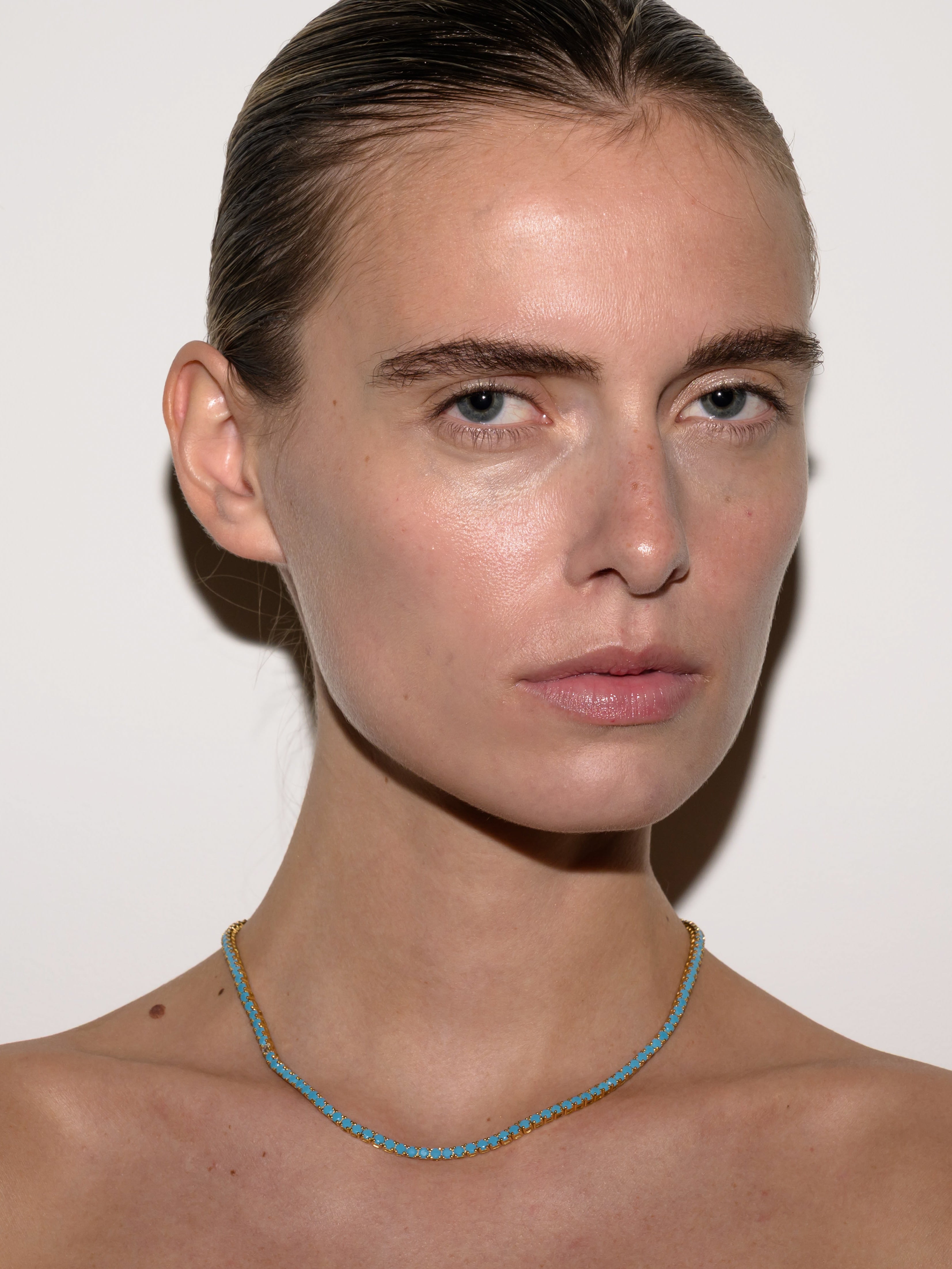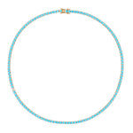 A best-selling Rivière, the Moss Necklace is updated for the season in 3MM nano turquoise stones with a single lab diamond in a classic 4-prong setting of 18-karat gold vermeil. Clasped securely with double safety hooks. Designed to layer all summer long.