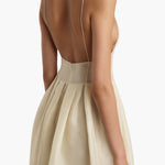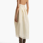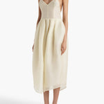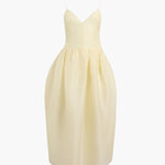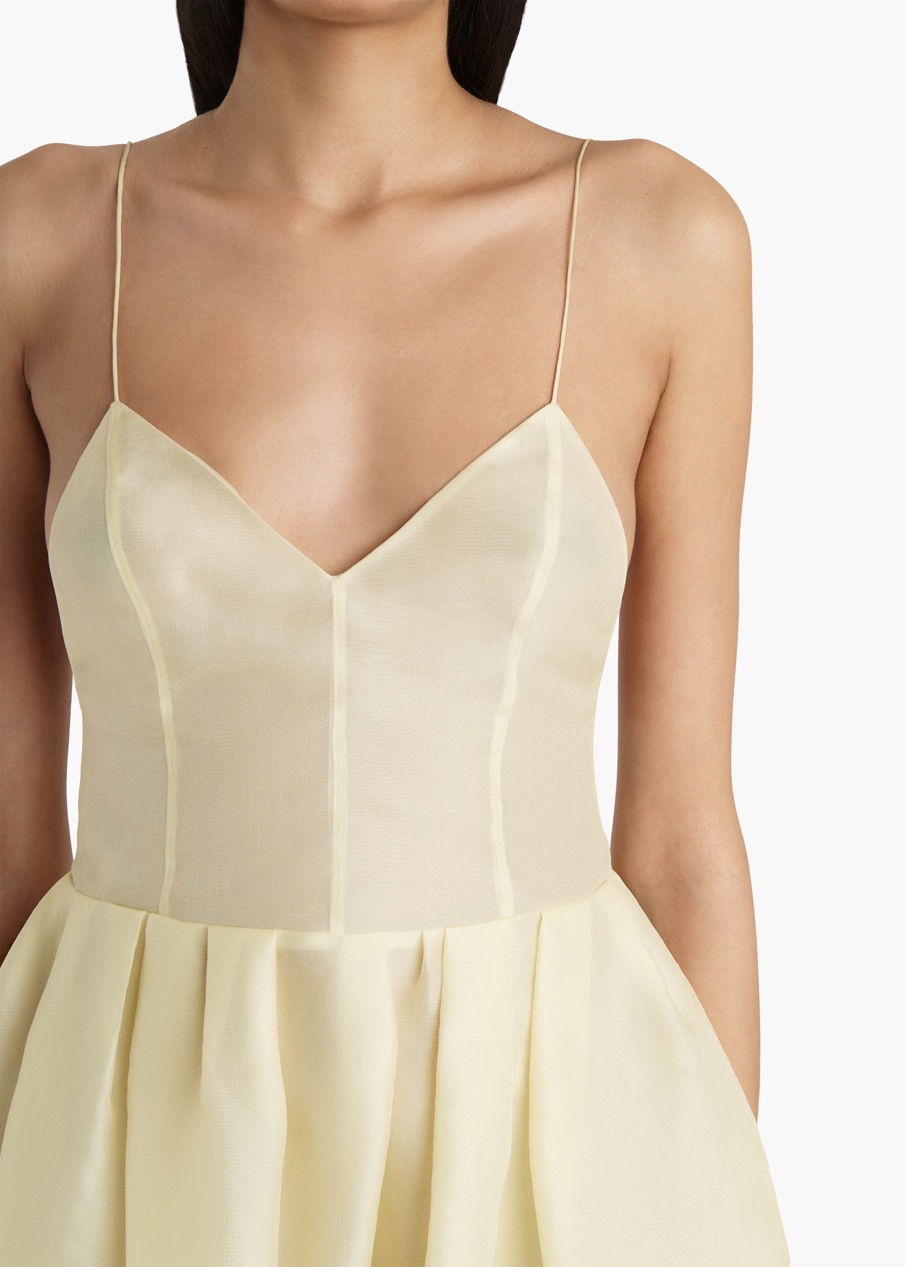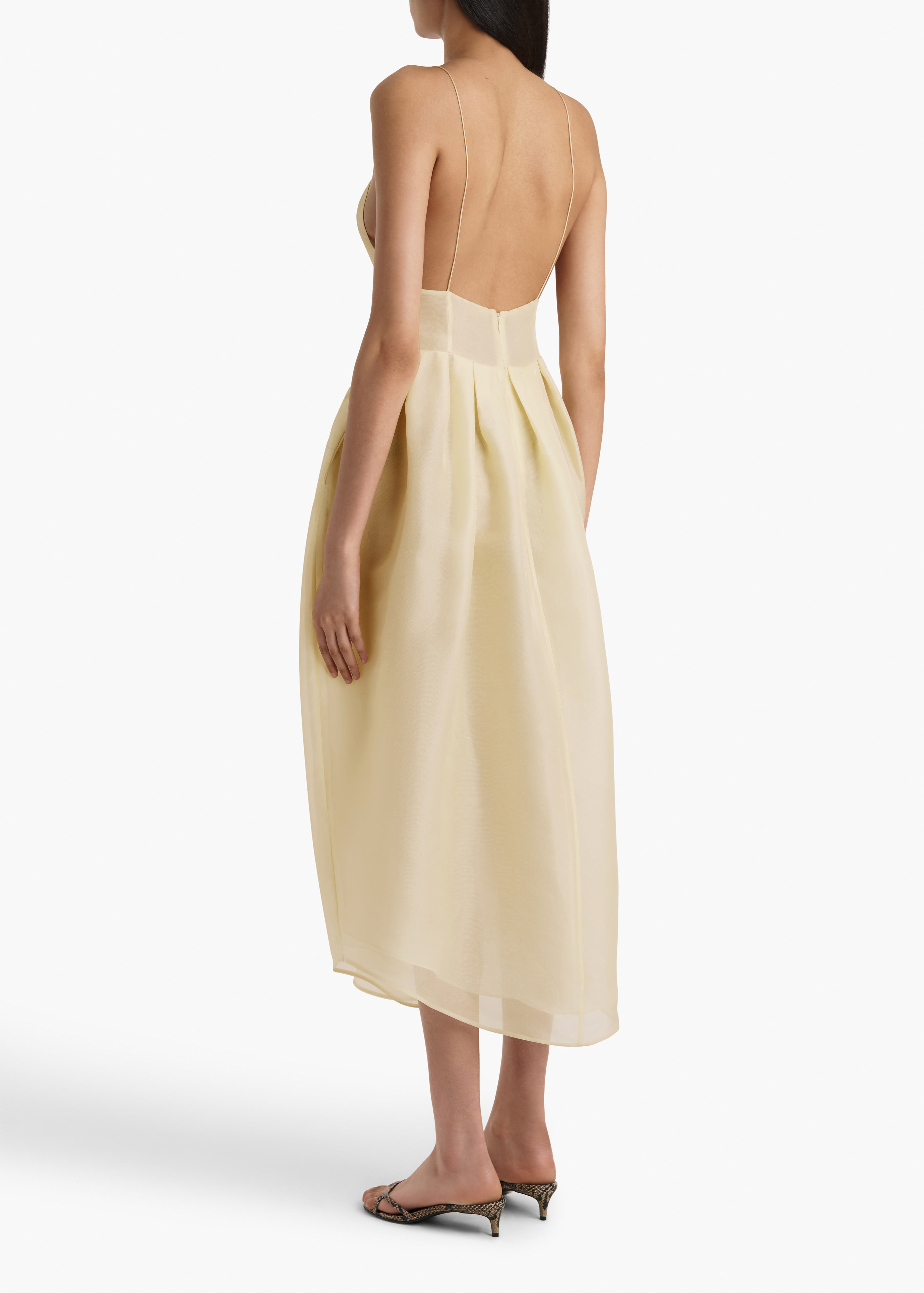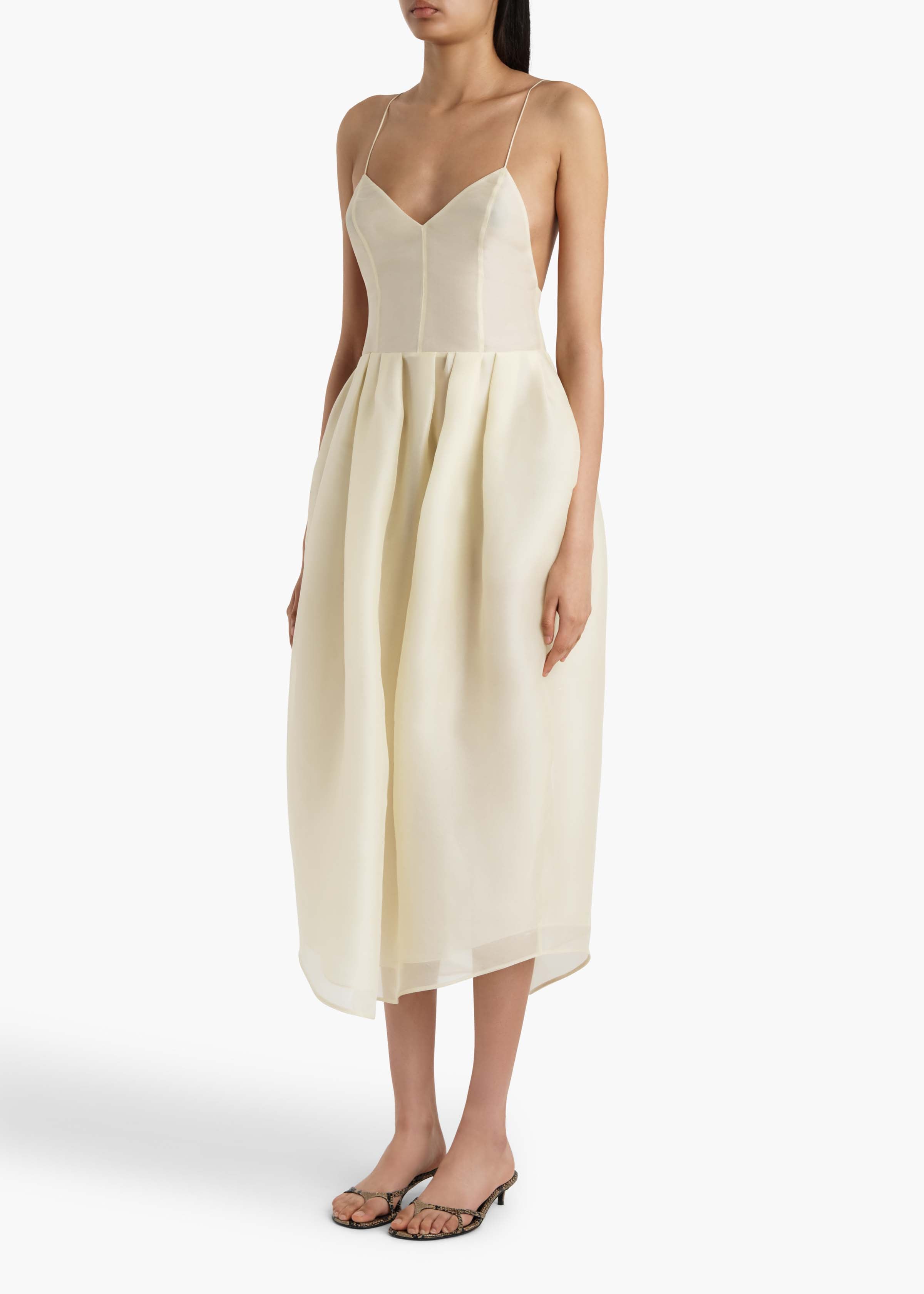 A sculptural dress that gains its lightness and rounded quality from naturally slubbed silk shantung organza. Camisole-style bodice suspended from delicate straps. Elongated bubble hem framed by soft pleats and gently rounded hem. In-seam side pockets. Concealed zipper at low back.