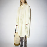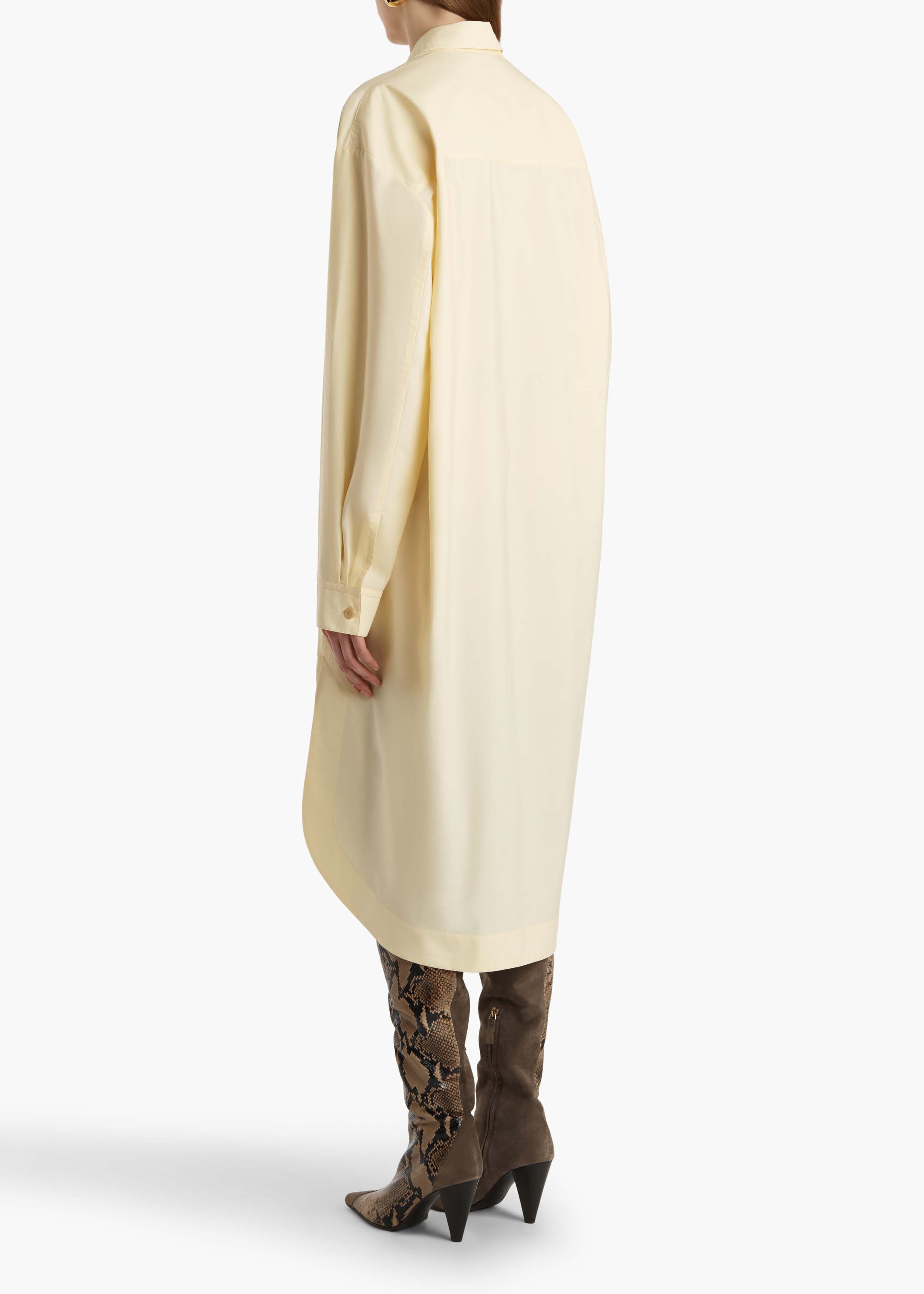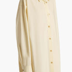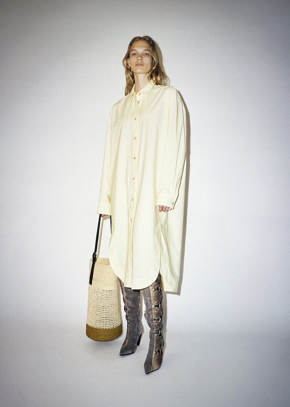 A softened silhouette inspired by men’s shirting. Curved back creates a cocoon shape that is enhanced by dropped shoulder seams and an exaggerated shirttail hem with side slits. Back yoke and single-button cuffs.