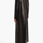 A long and lean trench inspired by military uniforms. Double-breasted silhouette tailored in buttery yet exceptionally lightweight lambskin. Refined by pintucking and precise topstitching throughout. With epaulets, side pockets, tonal buttons, and back slit. Lined in silky cupro twill.