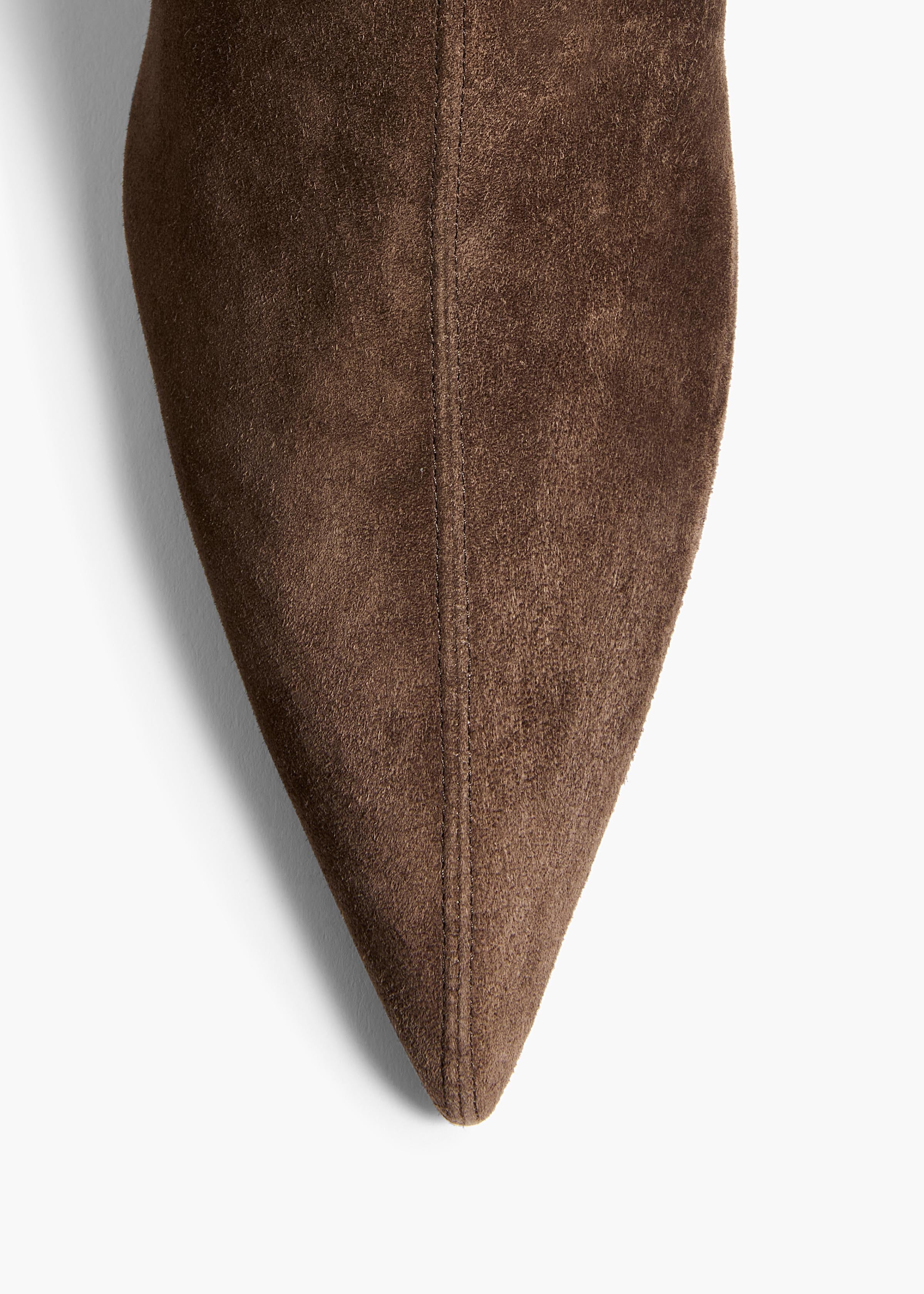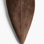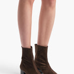 A pointed-toe ankle boot refined to its essence for pull-on ease in velvety suede. With leather sole, block heel, and gold-toned staple details at outsole.
