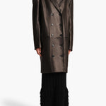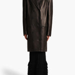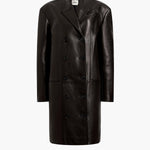 An elegantly oversized coat in supple black lambskin. Double-breasted silhouette with strong shoulders, notch lapels, welt pockets, and back slit.