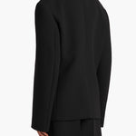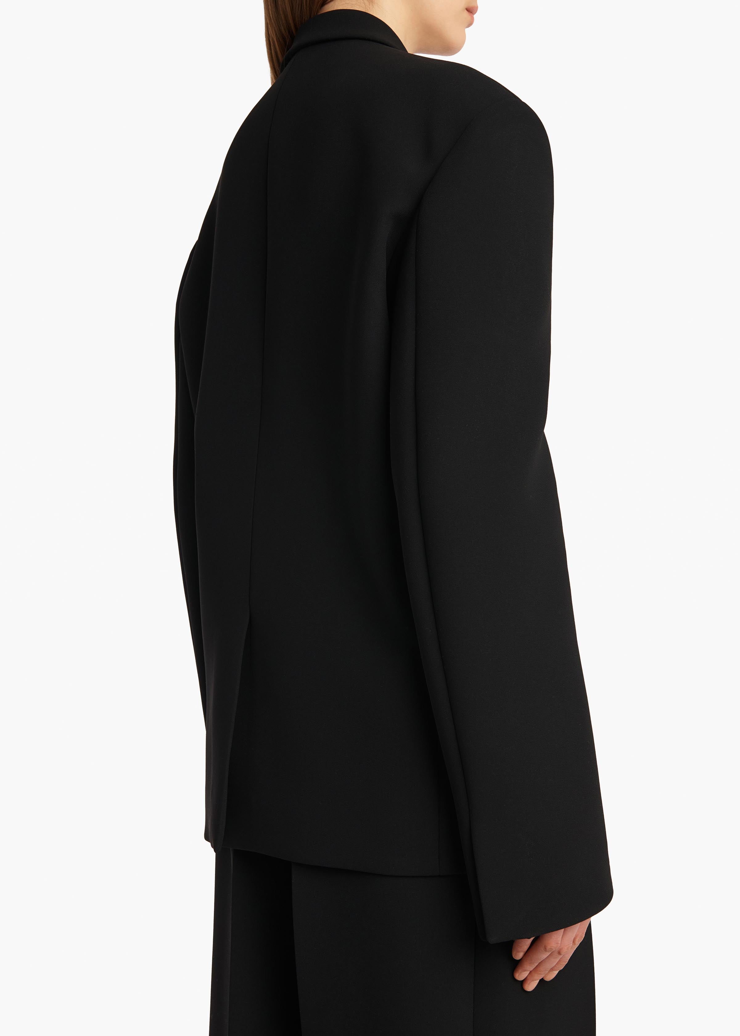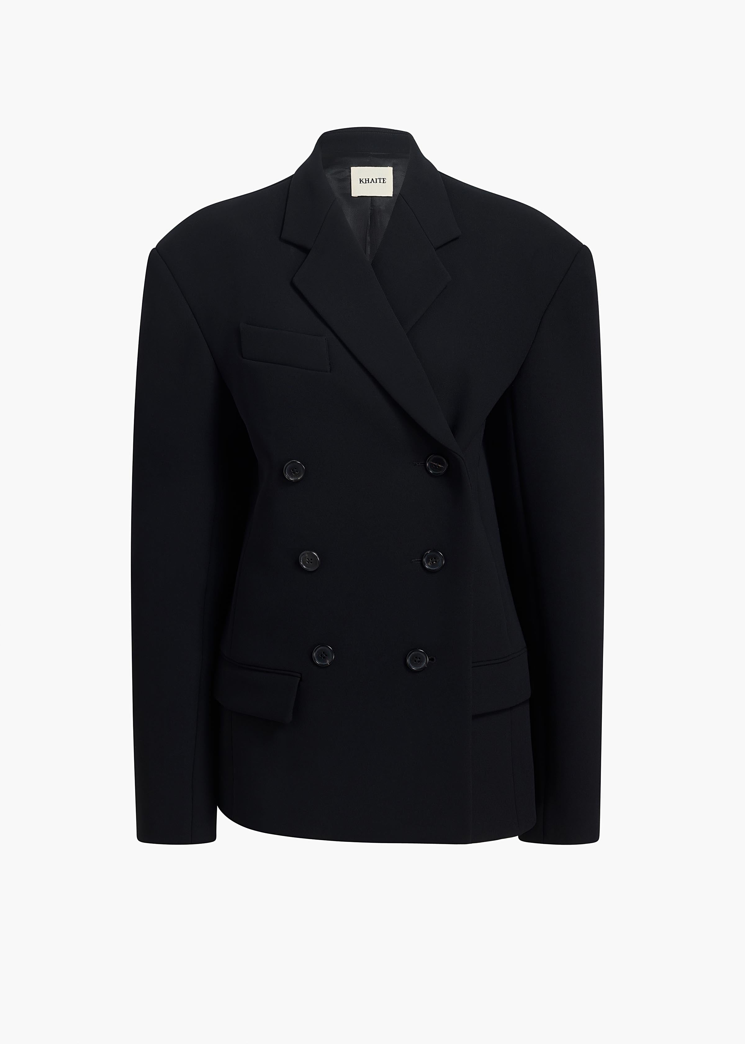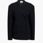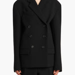 A boldly formed coat powered by strong shoulders. Double-breasted silhouette tailored in double-faced crepe, with buttons placed for ease of movement. Welt pocket at chest and low-slung flap pockets.