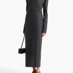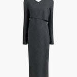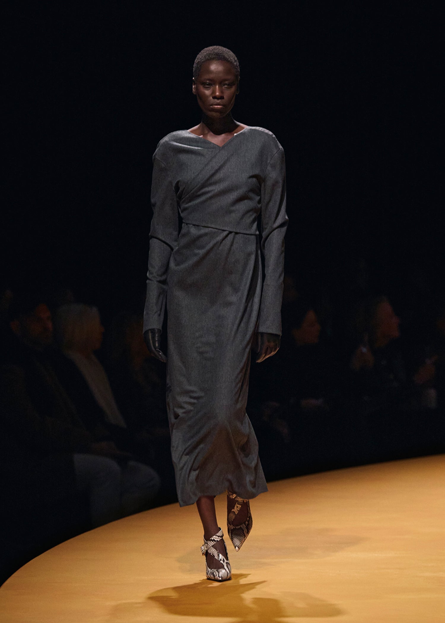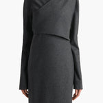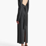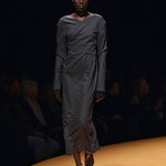 A new interpretation of the wrap dress in lightweight Italian wool-cashmere shirting selected for its beautiful drape. Drop-shoulder silhouette with higher waist. Squared lines at cleanly finished open back with tie. Back slit.
