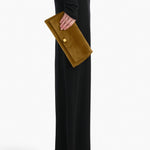 A flap-front clutch of refined lines and soft curves in velvety suede. Art Deco-inspired hardware at magnetic closure. Internal card pocket.
