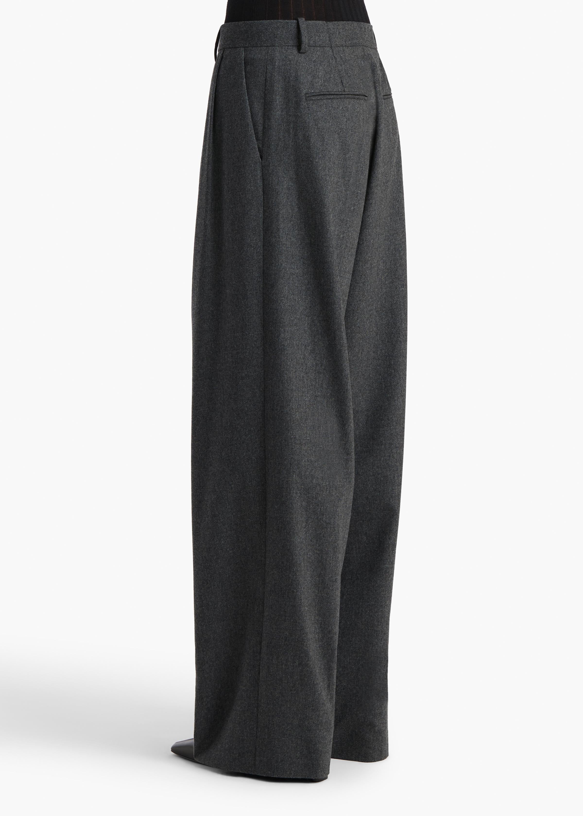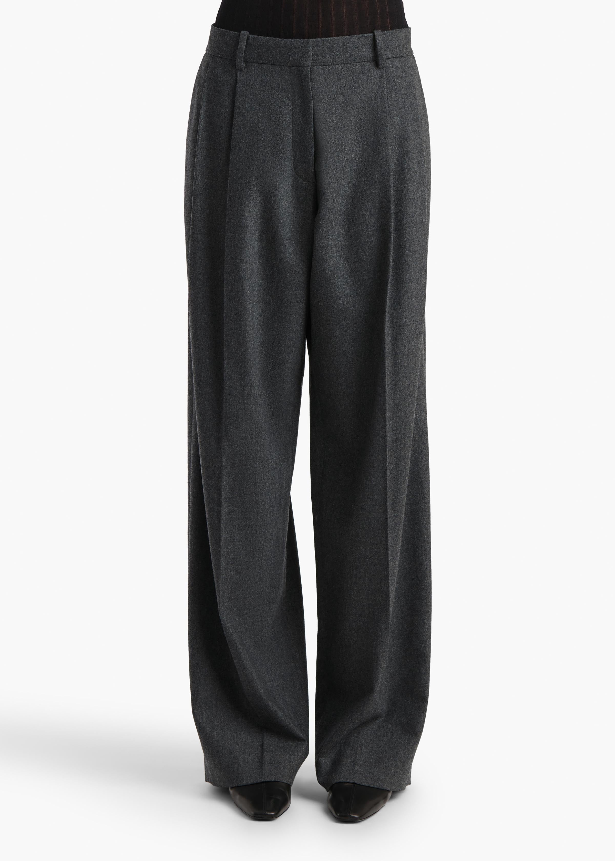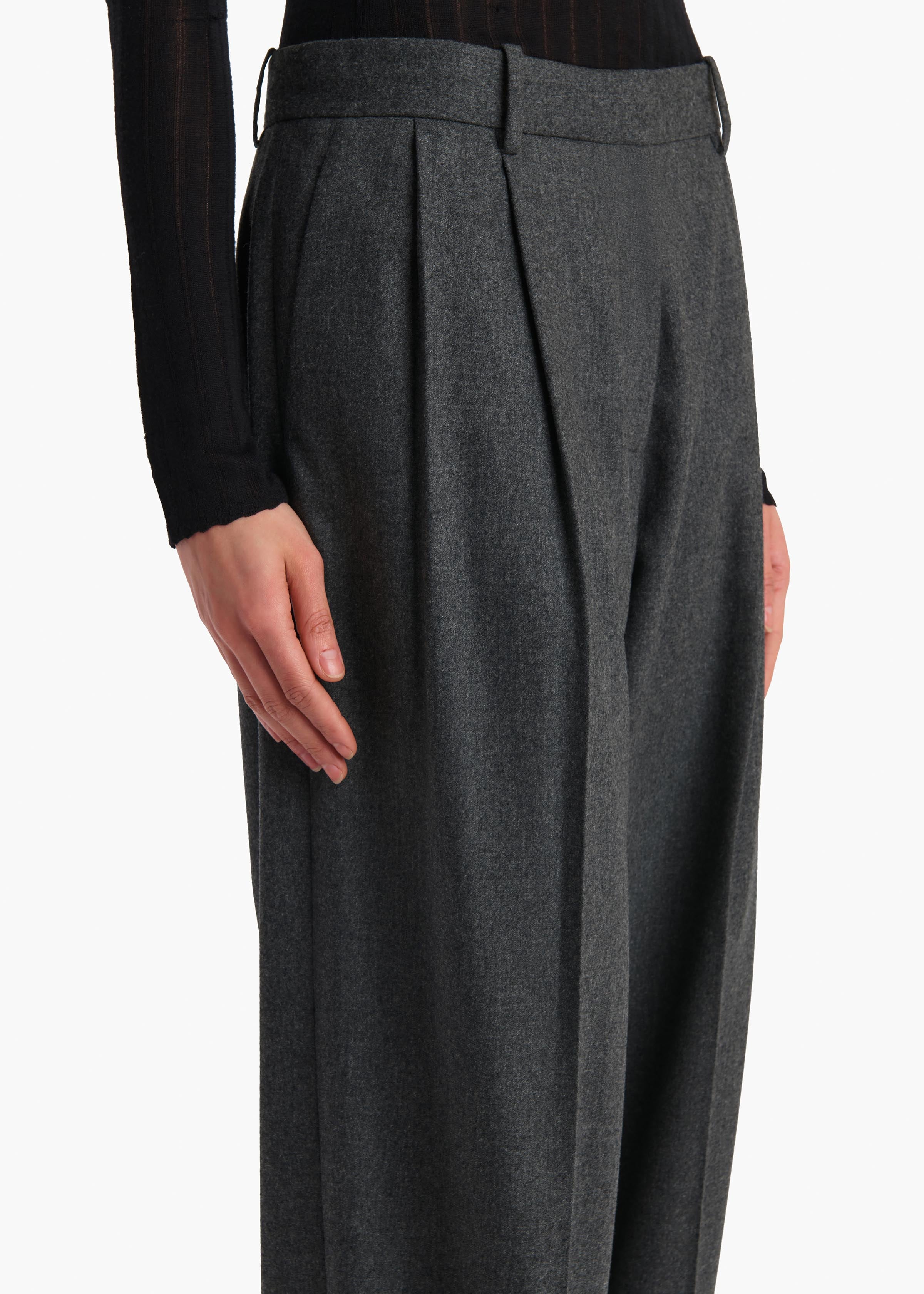 A fluid, mid-rise trouser in a lightweight blend of wool and cashmere. Paired reverse pleats are placed proximally, to preserve the clean lines. Dips slightly lower in front. With belt loops, on-seam side pockets, and back welt pockets.