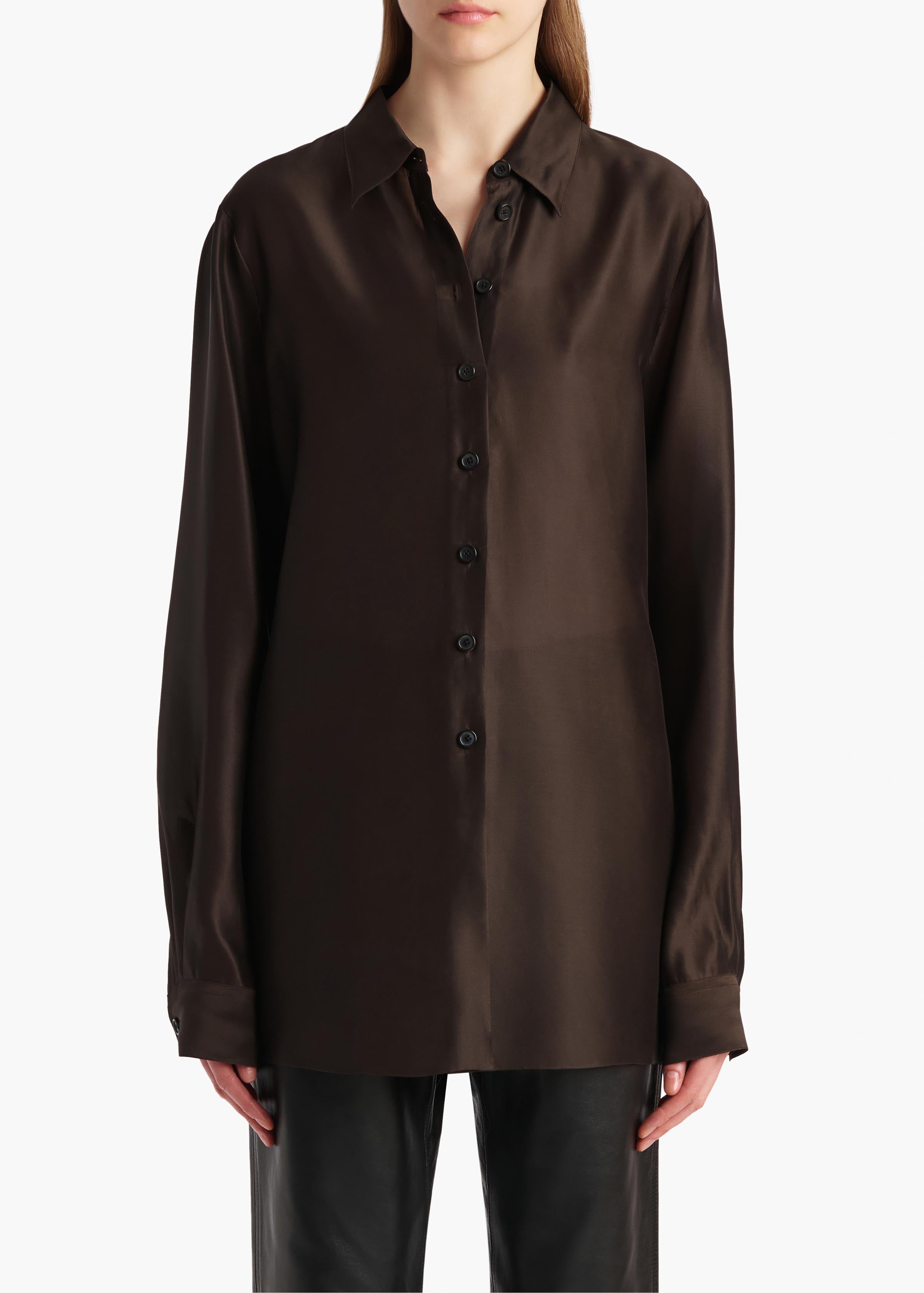 A menswear-inspired button-up designed for relaxed fit in silky Italian twill selected for its crisp character and fluid drape. Finishing touches include back yoke with box pleat and single-button cuffs.