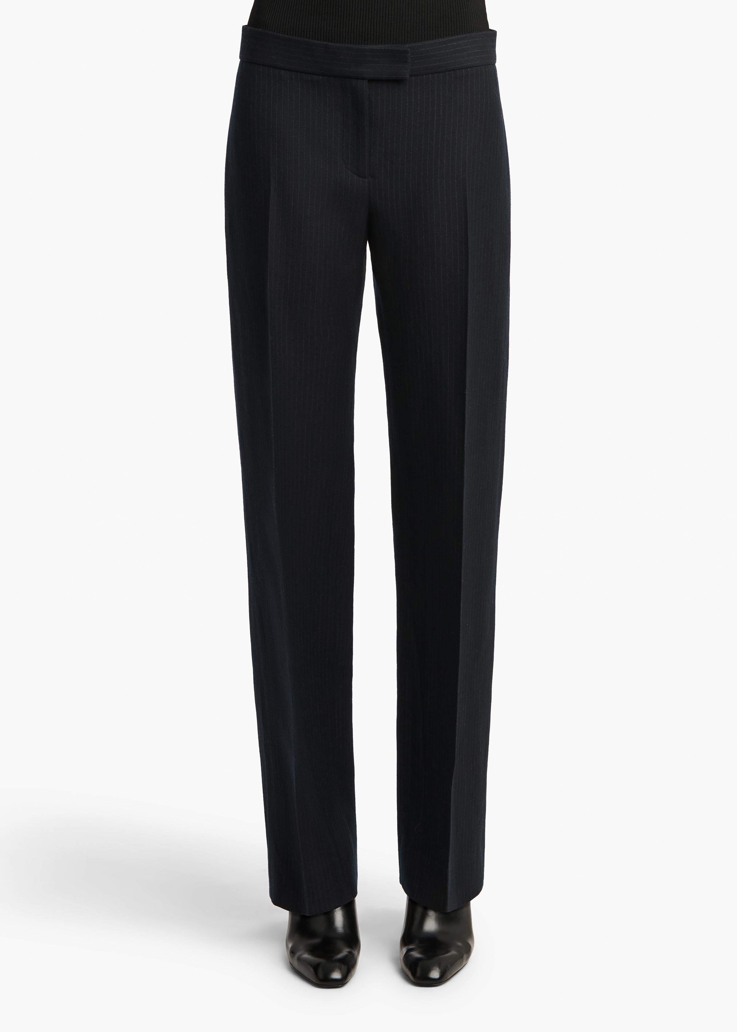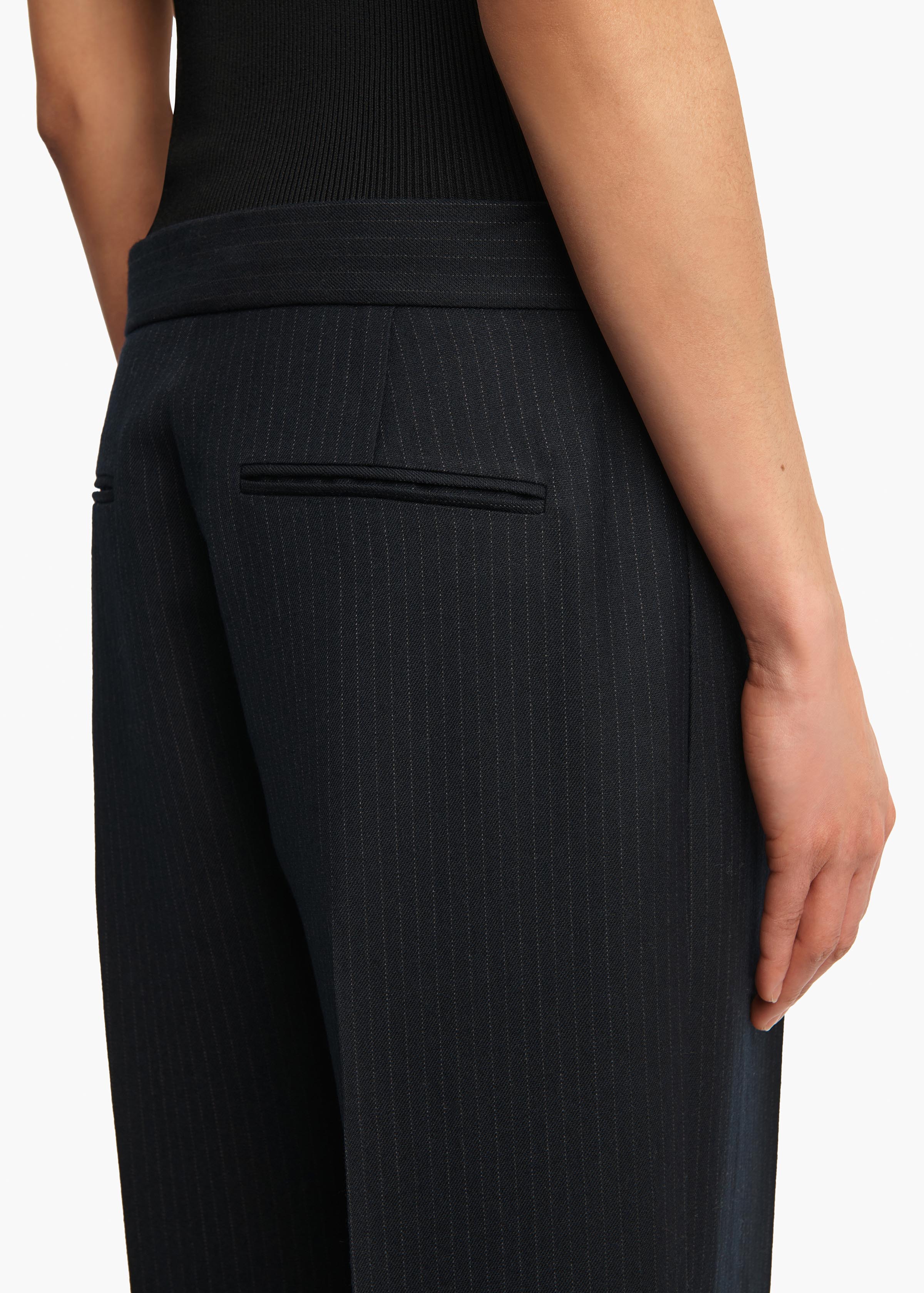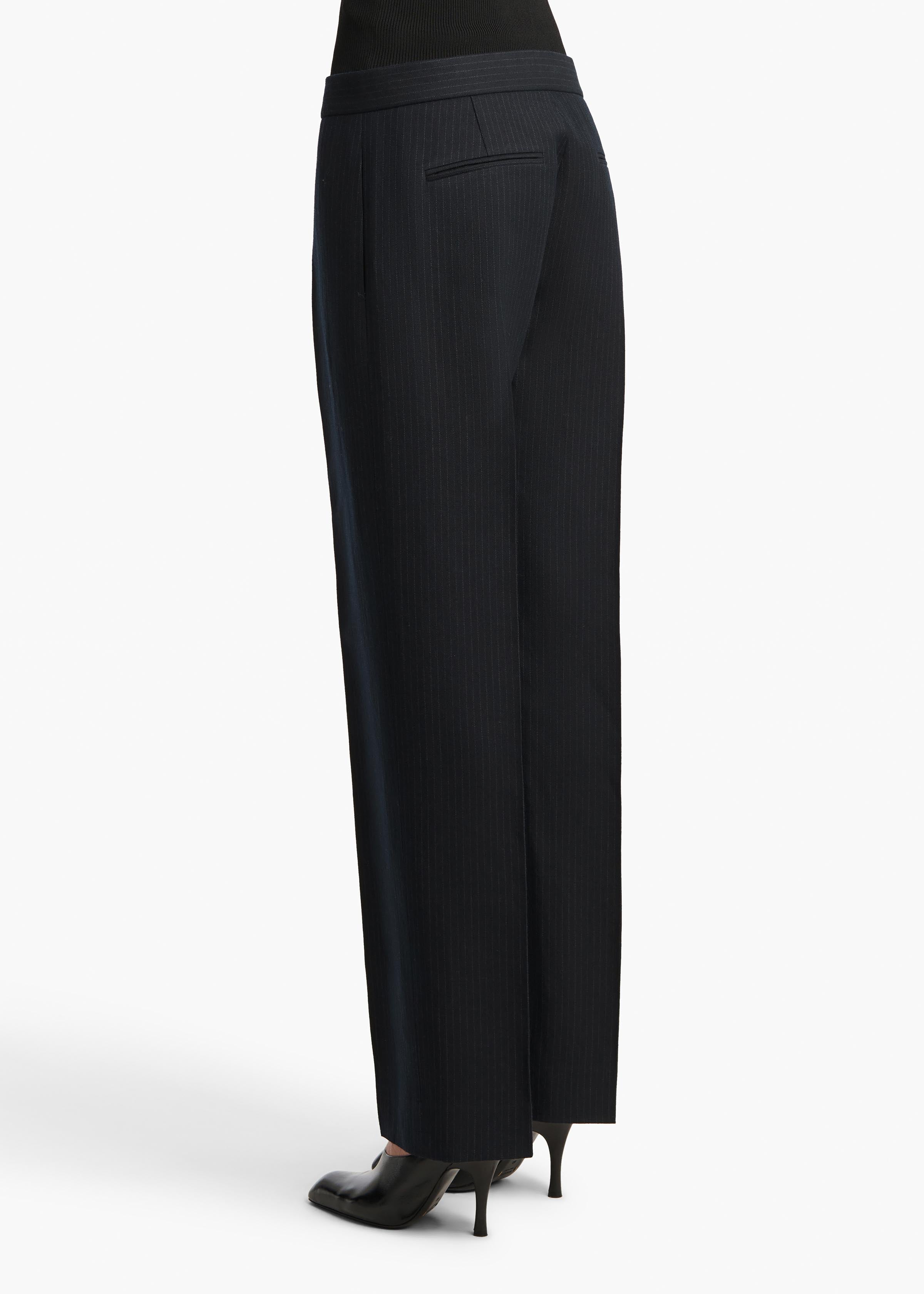 Designed to sit low on the waist in pinstriped wool suiting, this eased trouser has a slightly bowed silhouette for a subtle taper. Clean waistband, in-seam side pockets, and back welt pockets complete the refined look.
