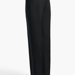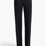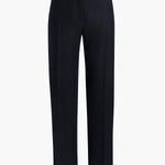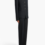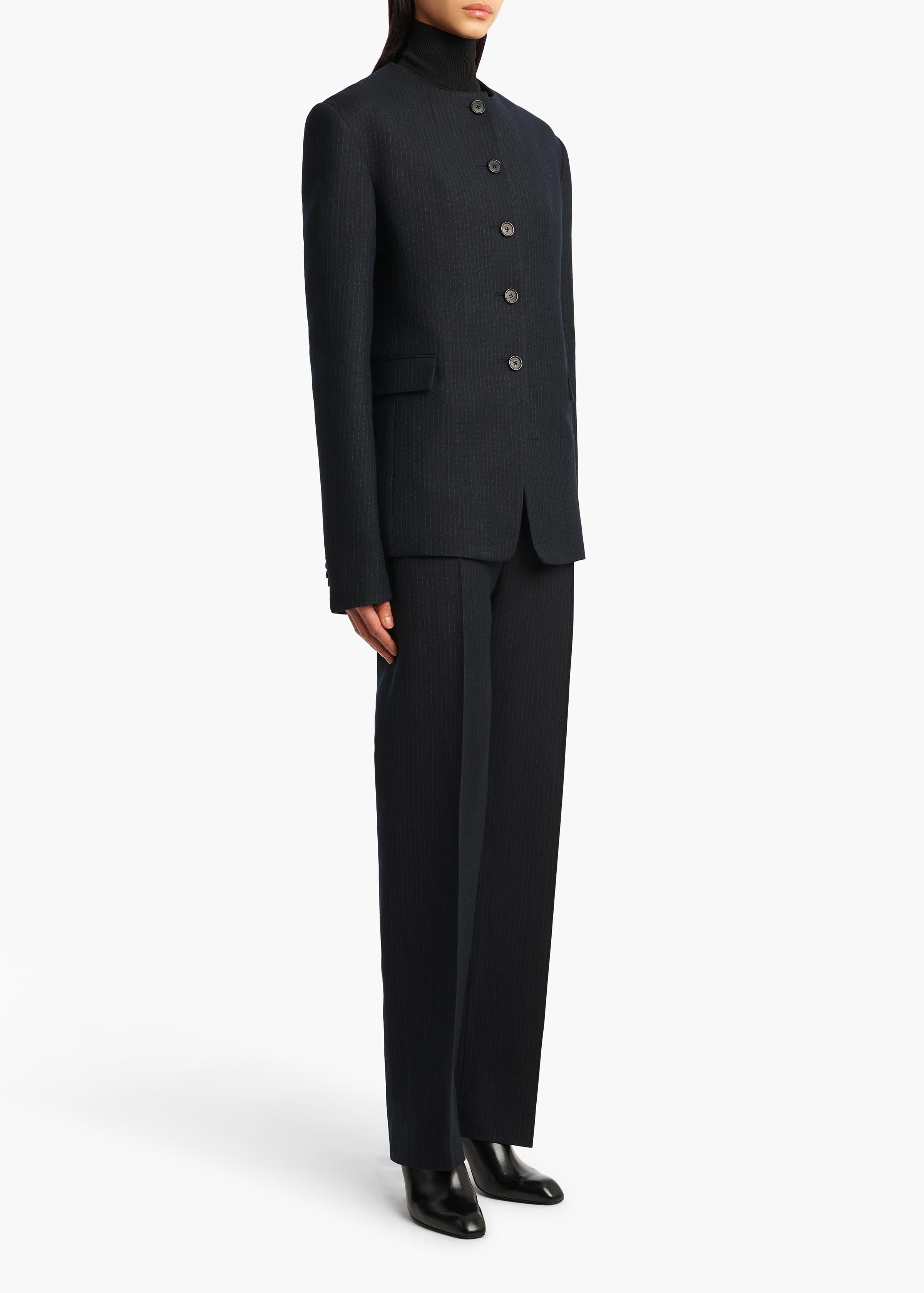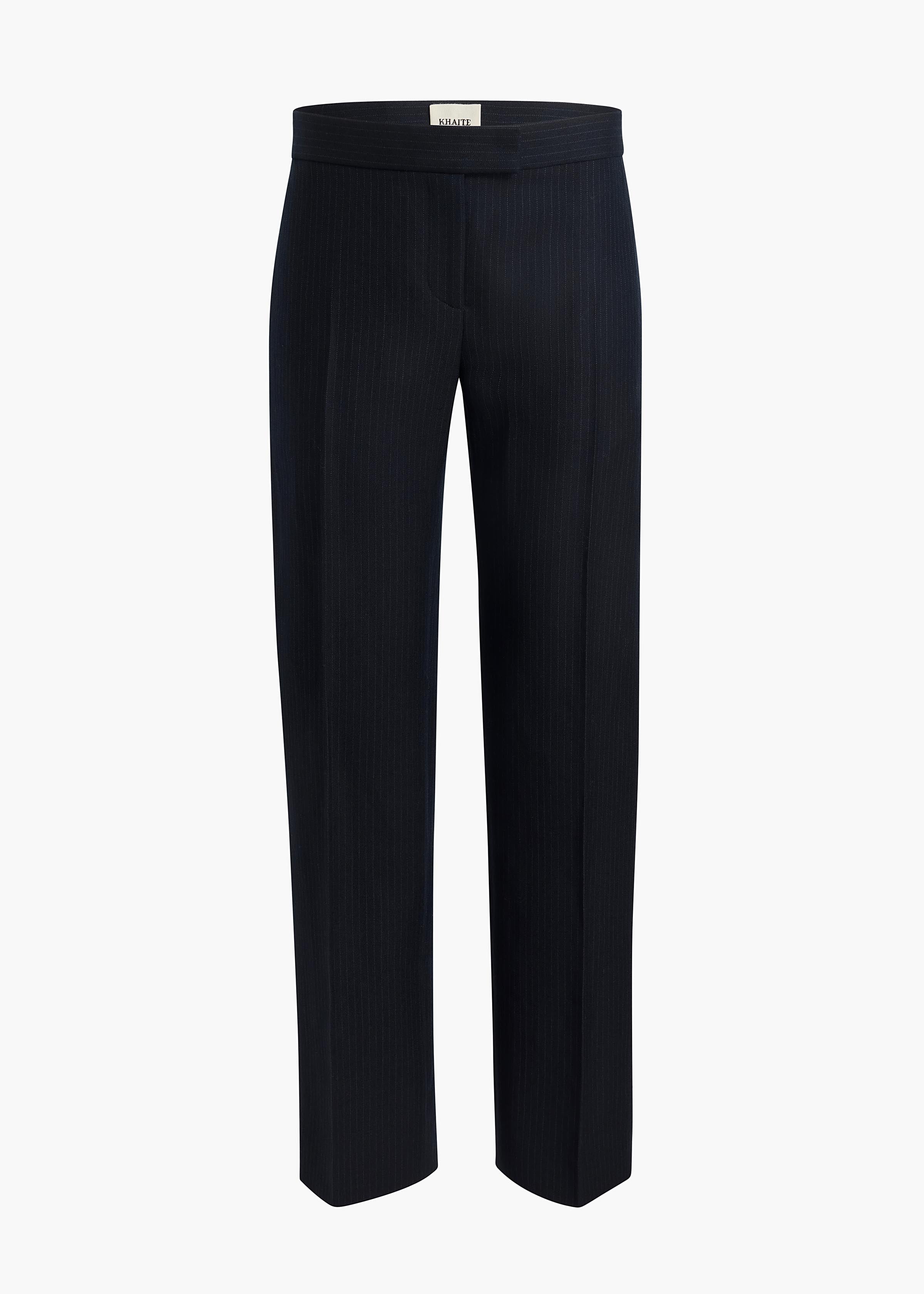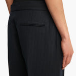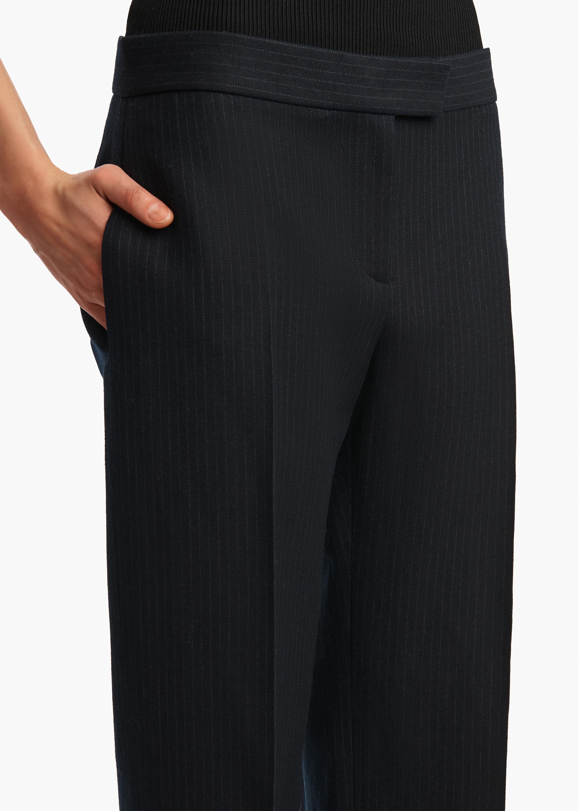 Designed to sit low on the waist in pinstriped wool suiting, this eased trouser has a slightly bowed silhouette for a subtle taper. Clean waistband, in-seam side pockets, and back welt pockets complete the refined look.