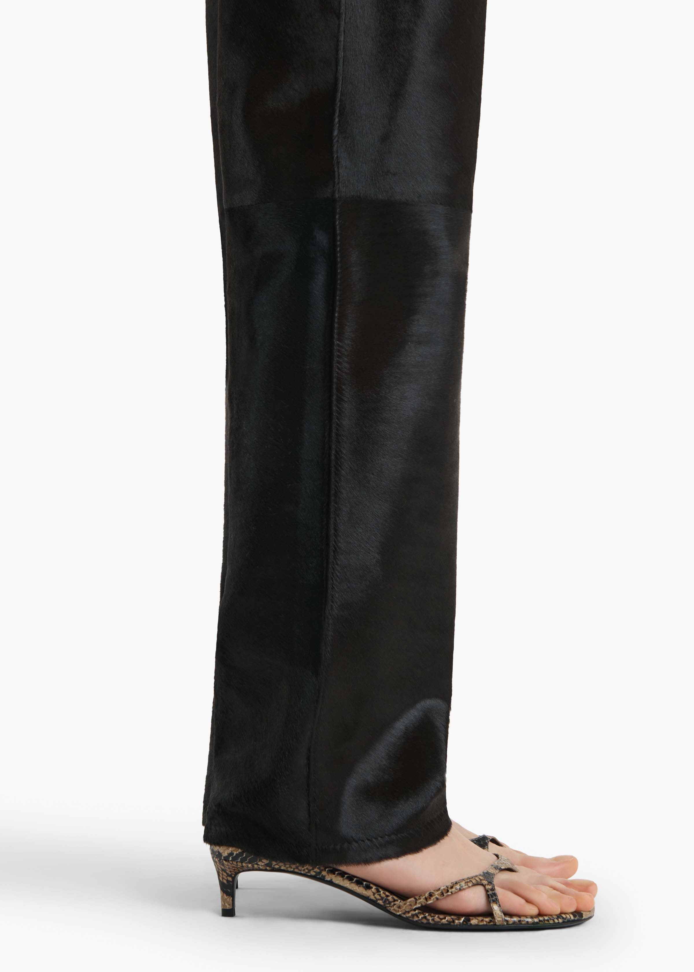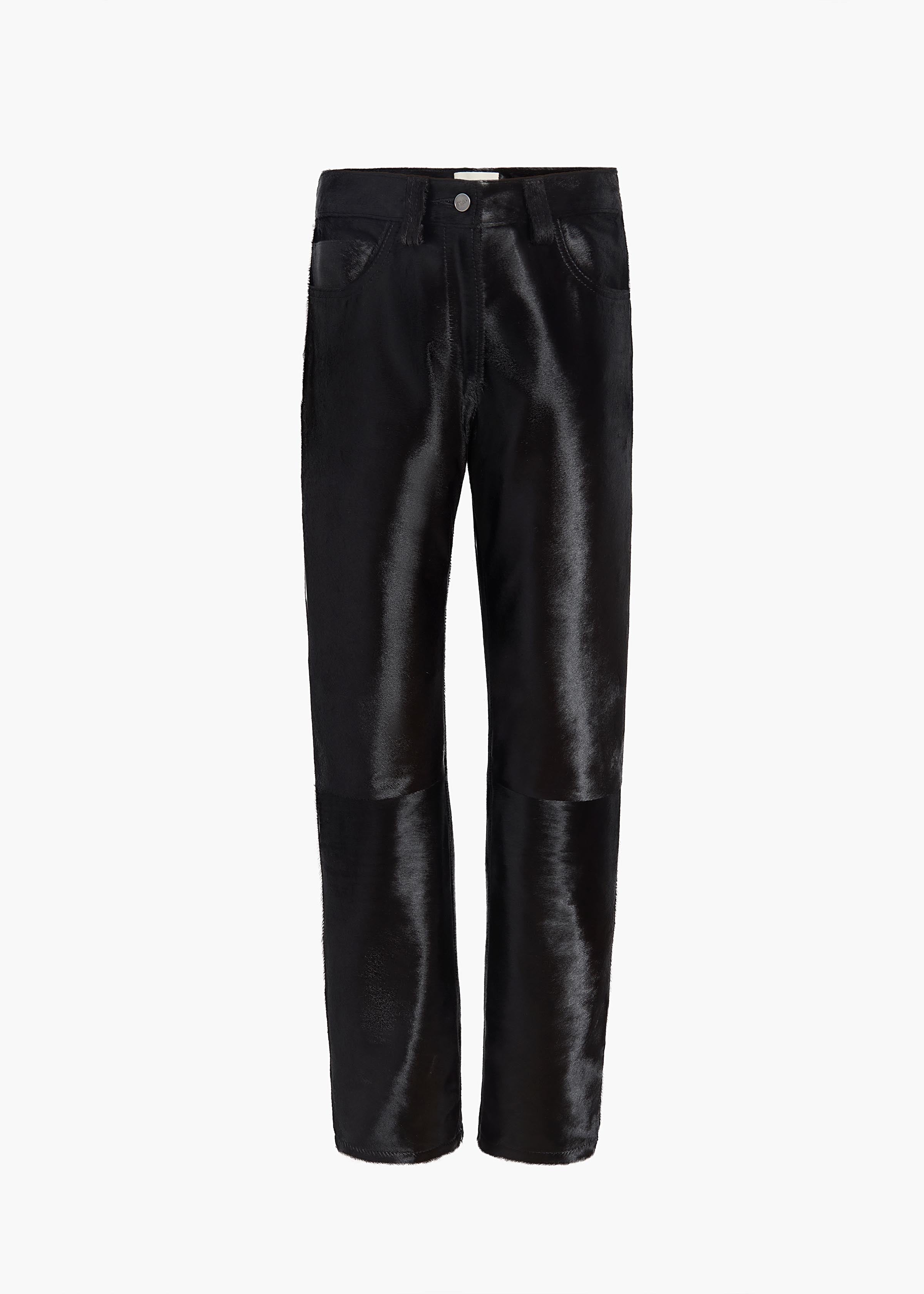 Designed for a relaxed yet tapered fit in supple hair-on calfskin, this silhouette balances a low rise with a slightly bowed leg, inspired by vintage men’s jeans. With belt loops and signature antiqued button.