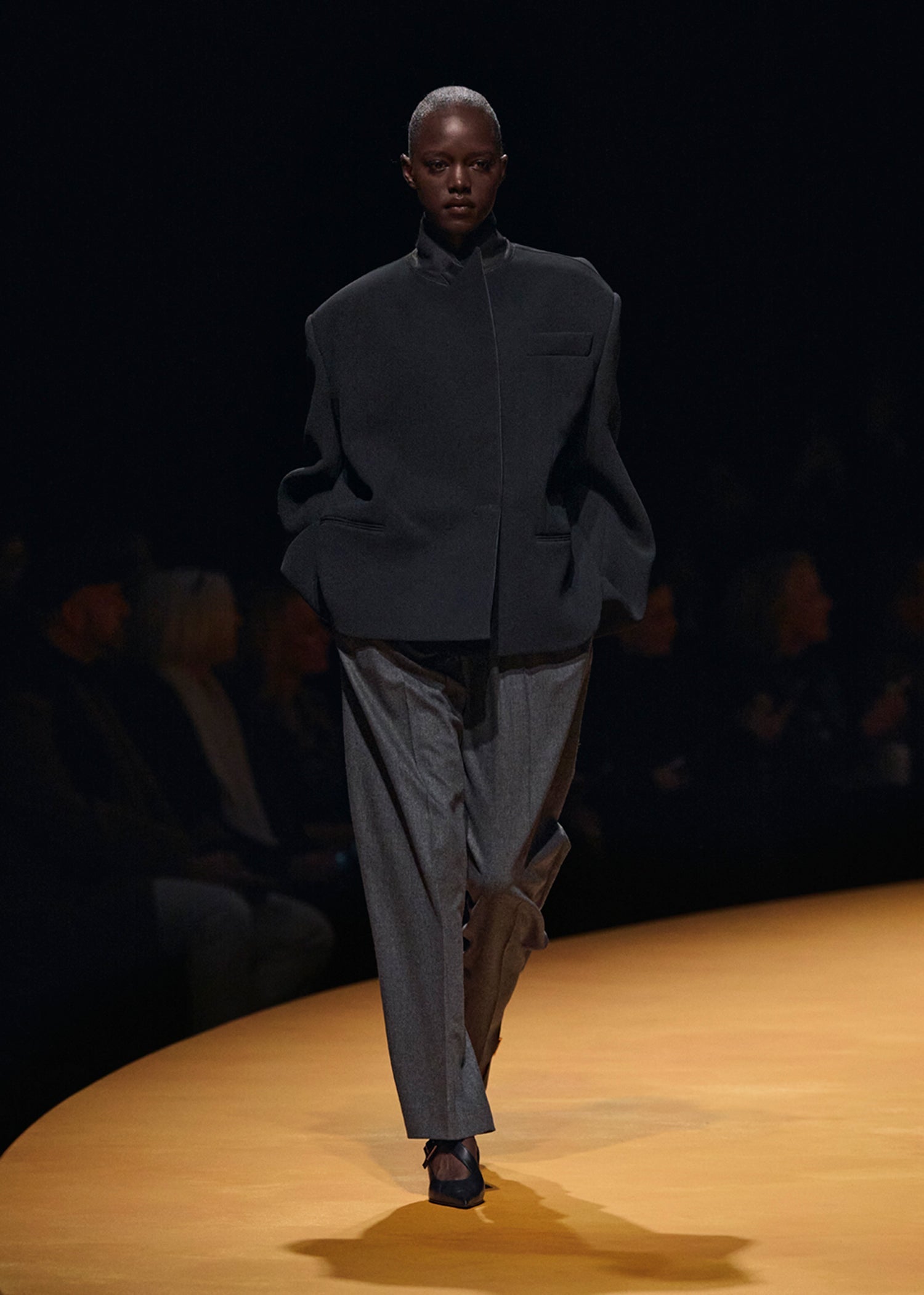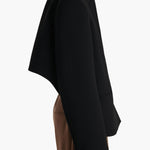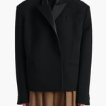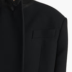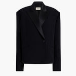 A boldly shouldered, richly textured, double-faced crepe blazer that takes cues from menswear, only to reveal a high, sculpted back. With deliberately flattened peak lapels, welt pockets, and four-button cuffs.