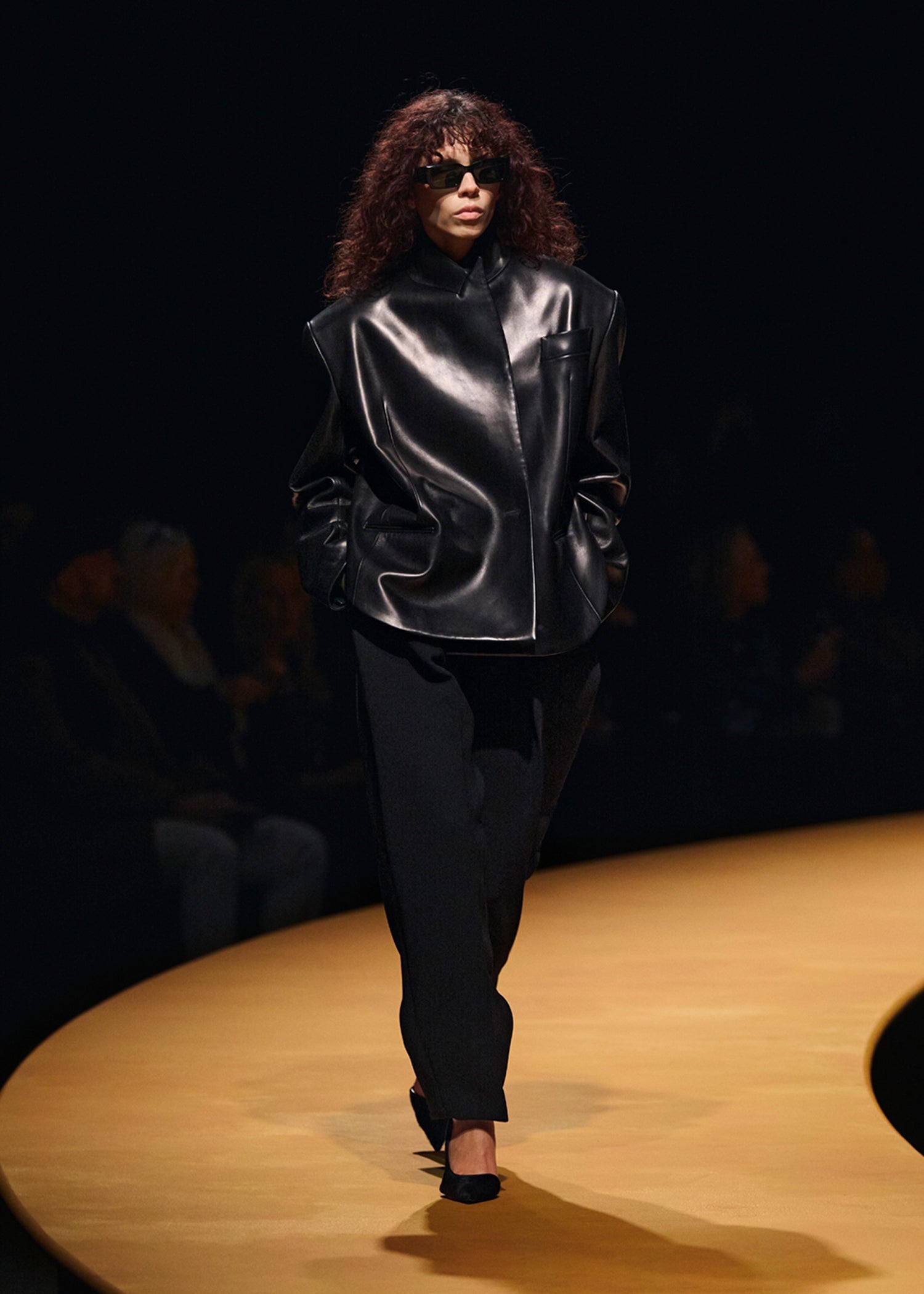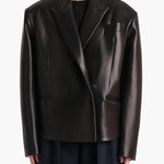 A boldly shouldered, richly textured lambskin blazer that takes cues from menswear, only to reveal a high, sculpted back. With deliberately flattened peak lapels, welt pockets, and four-button cuffs. Lined in silky cupro.