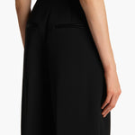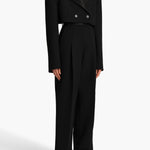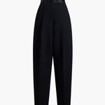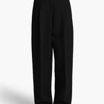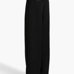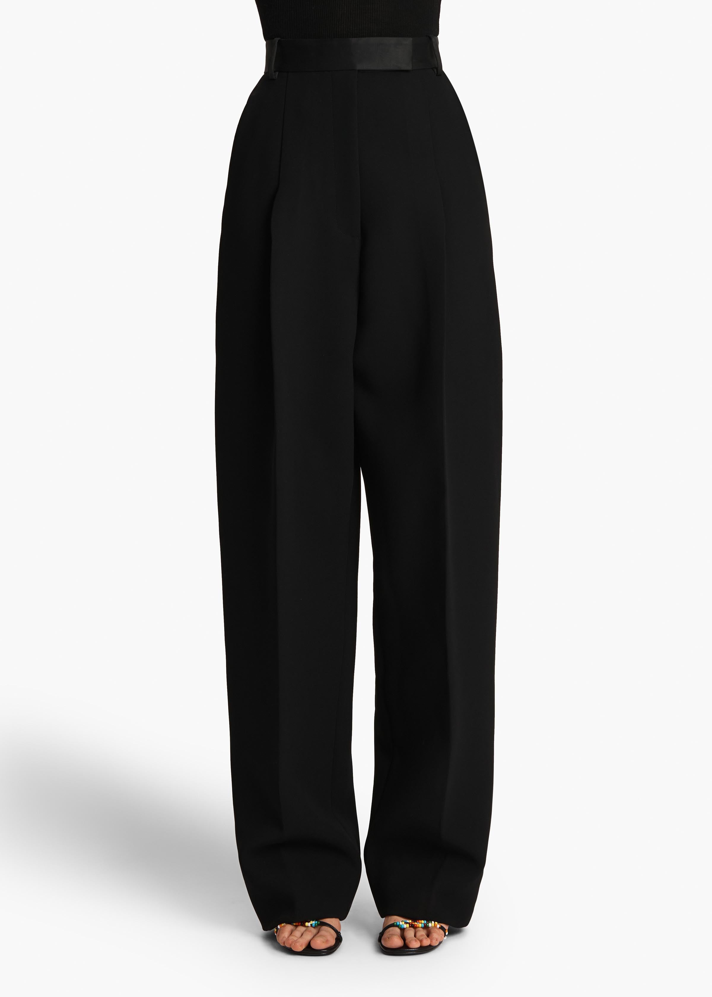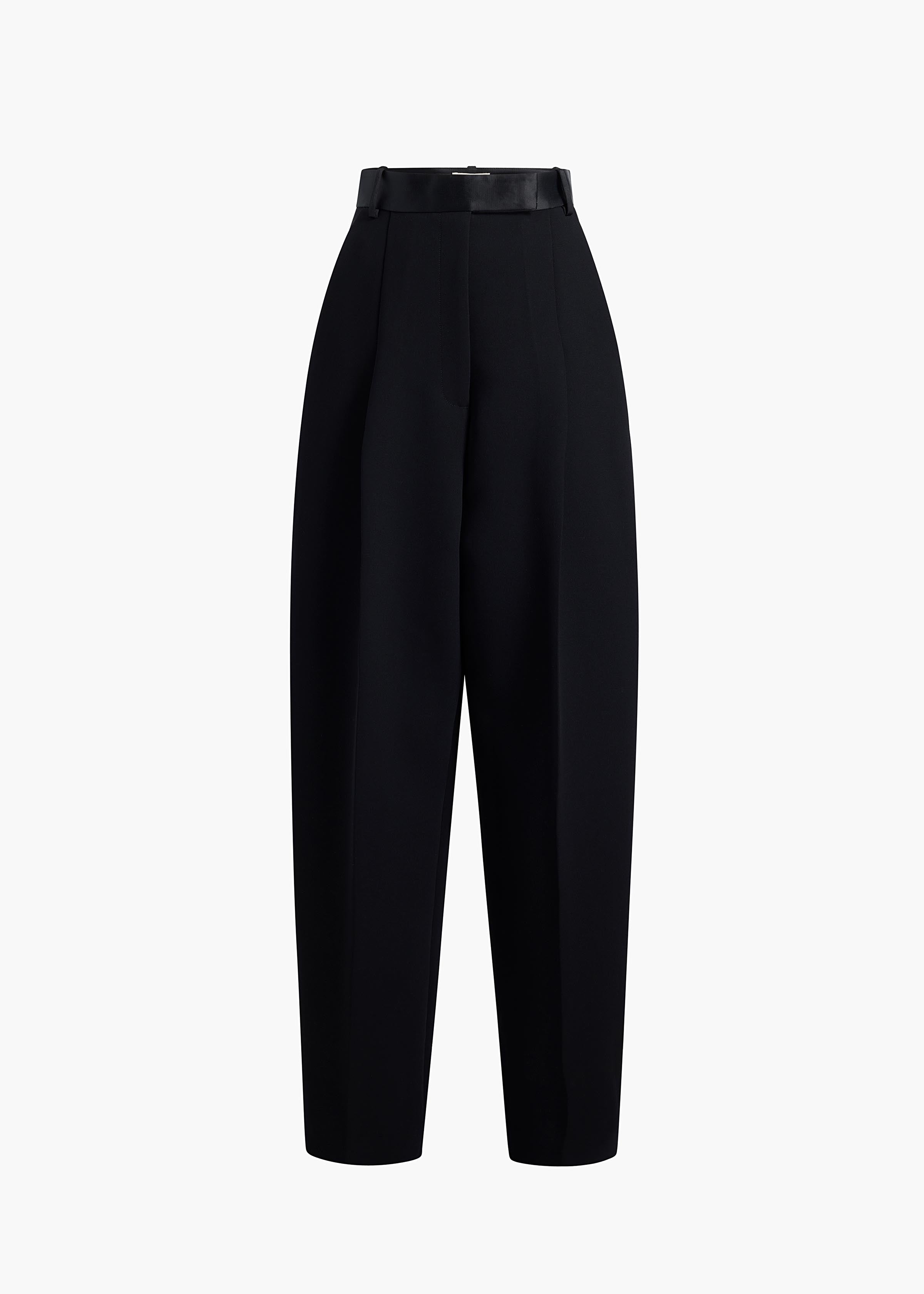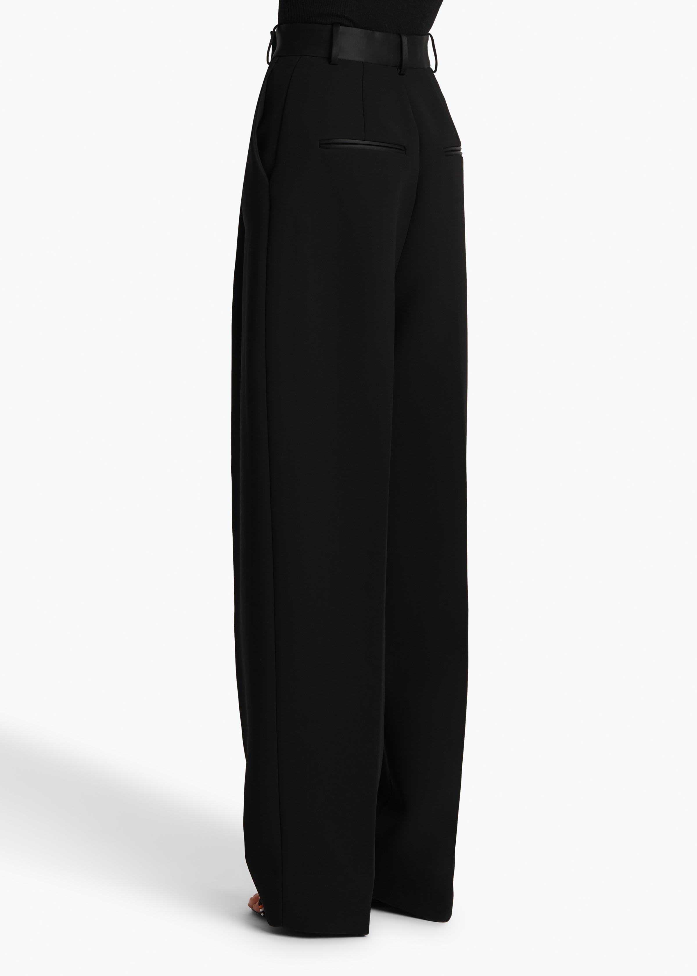 A high-waisted, pleated pant in double-faced crepe. Cummerbund-inspired satin waistband with belt loops. Inset side pockets and back welt pockets.