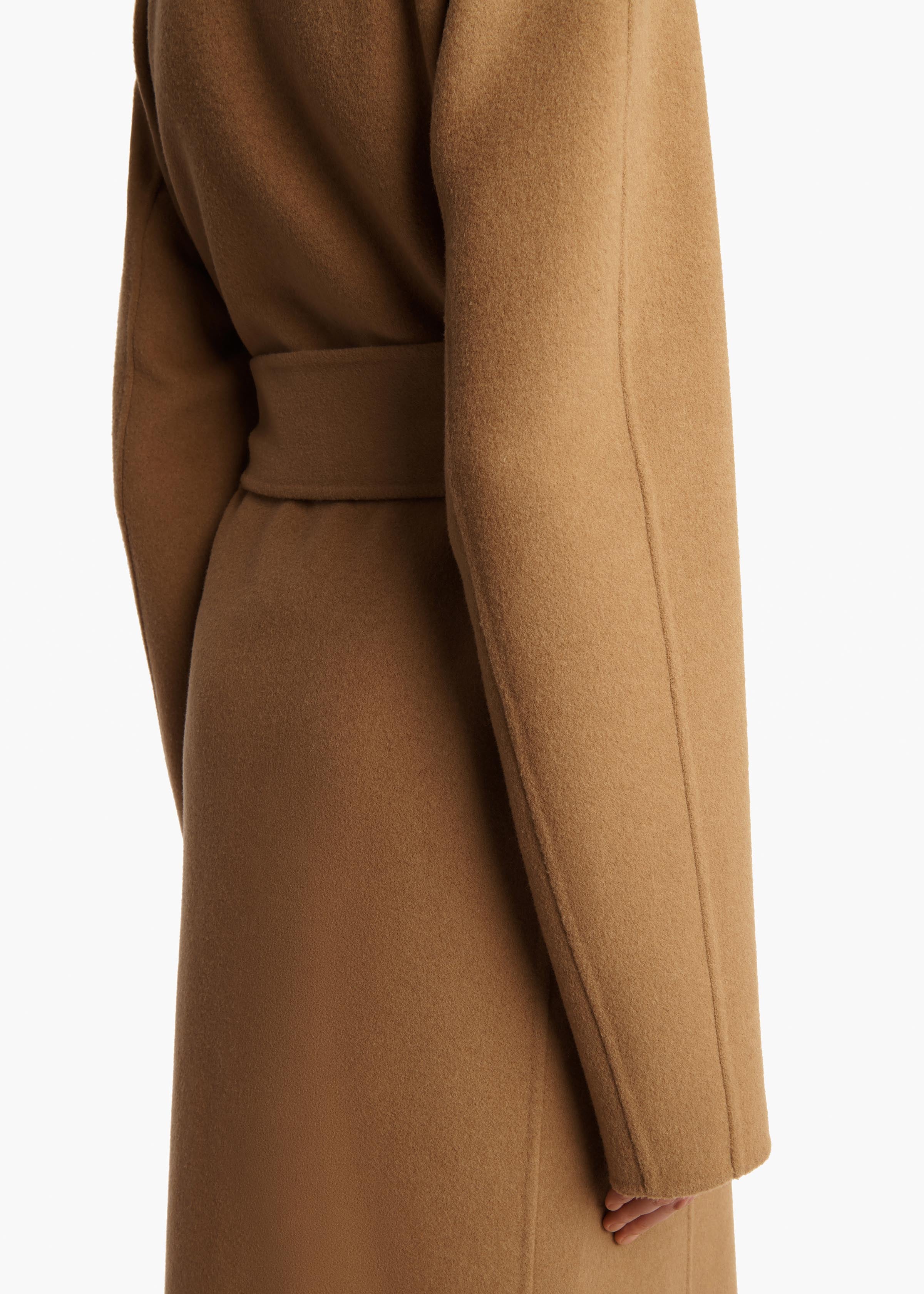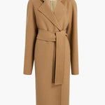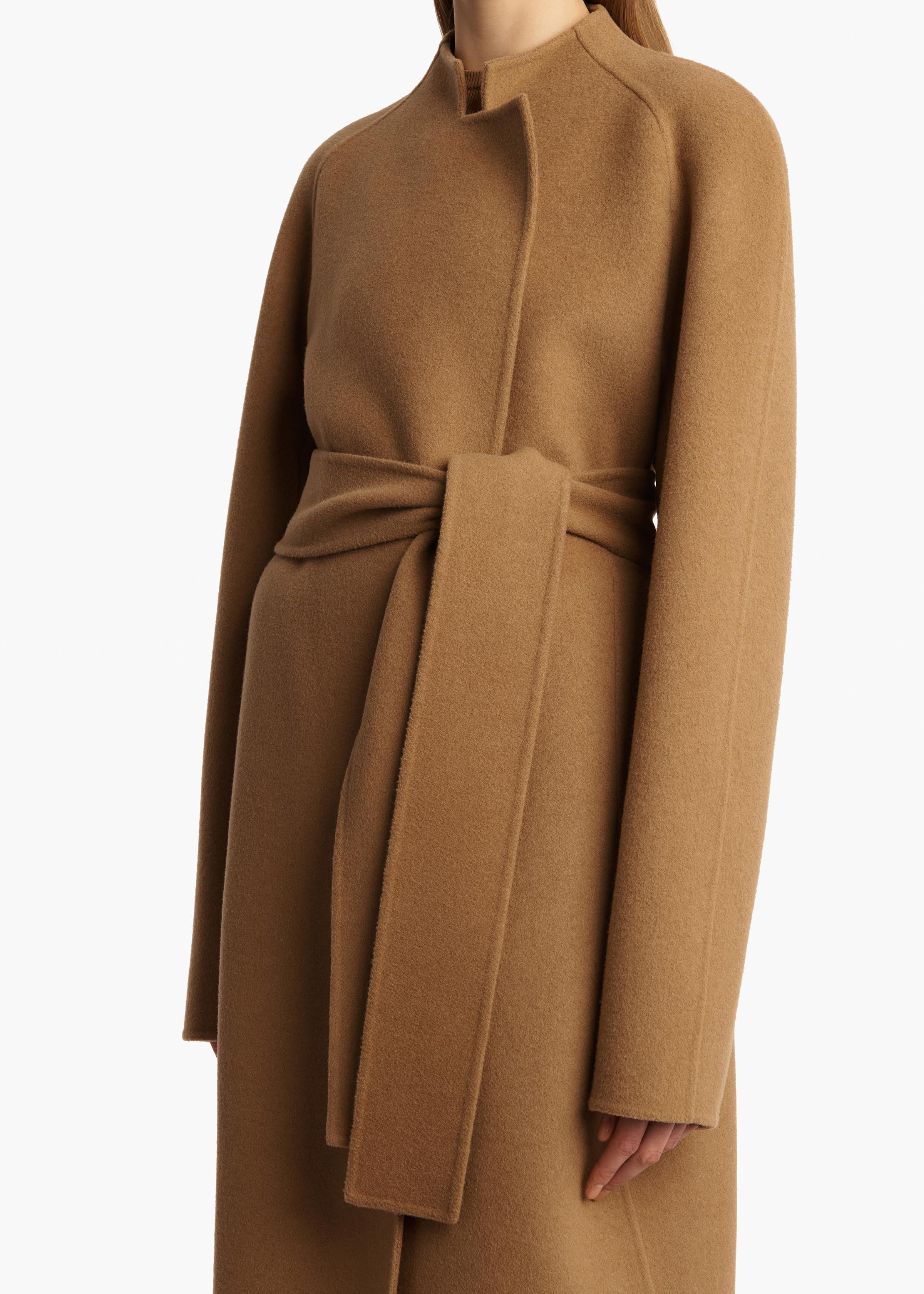 A raglan-sleeved wrap coat in luscious double-faced wool. Defined by decisive lines and strengthened by refined shoulder pads. Cinch with the wide, scarf-like sash belt or wear open.