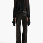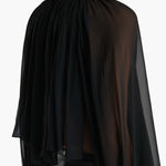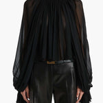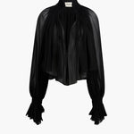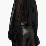 Fusing ‘90s grunge with a bohemian spirit, this fluidly formed shirt is framed by a high stand collar for a regal bearing. Cutaway silhouette animated by hand-crushed cartridge pleating, with billowing sleeves cinched at the wrist. Wear with slit neckline at front or back.