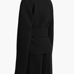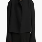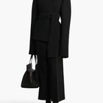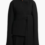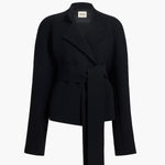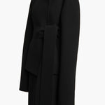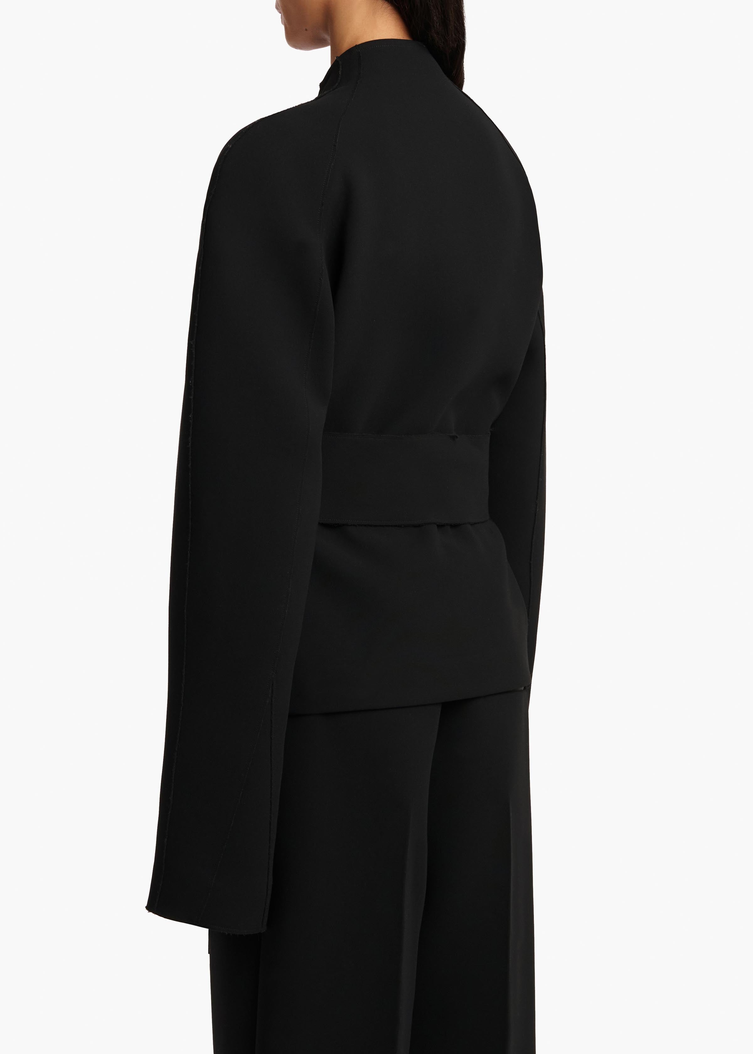 A raglan-sleeved wrap silhouette in double-faced crepe. Strengthened by decisive lines, lapped seams, and refined shoulder pads. Cinch with the wide, scarf-like sash belt or wear open.