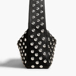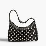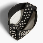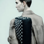A sculptural interpretation of a classic box bag. The zip-top silhouette is studded in gleaming discs. Lined in nappa leather, with slip pocket.