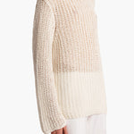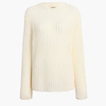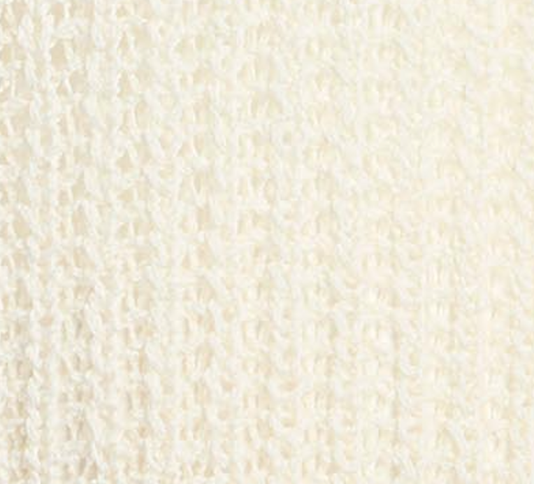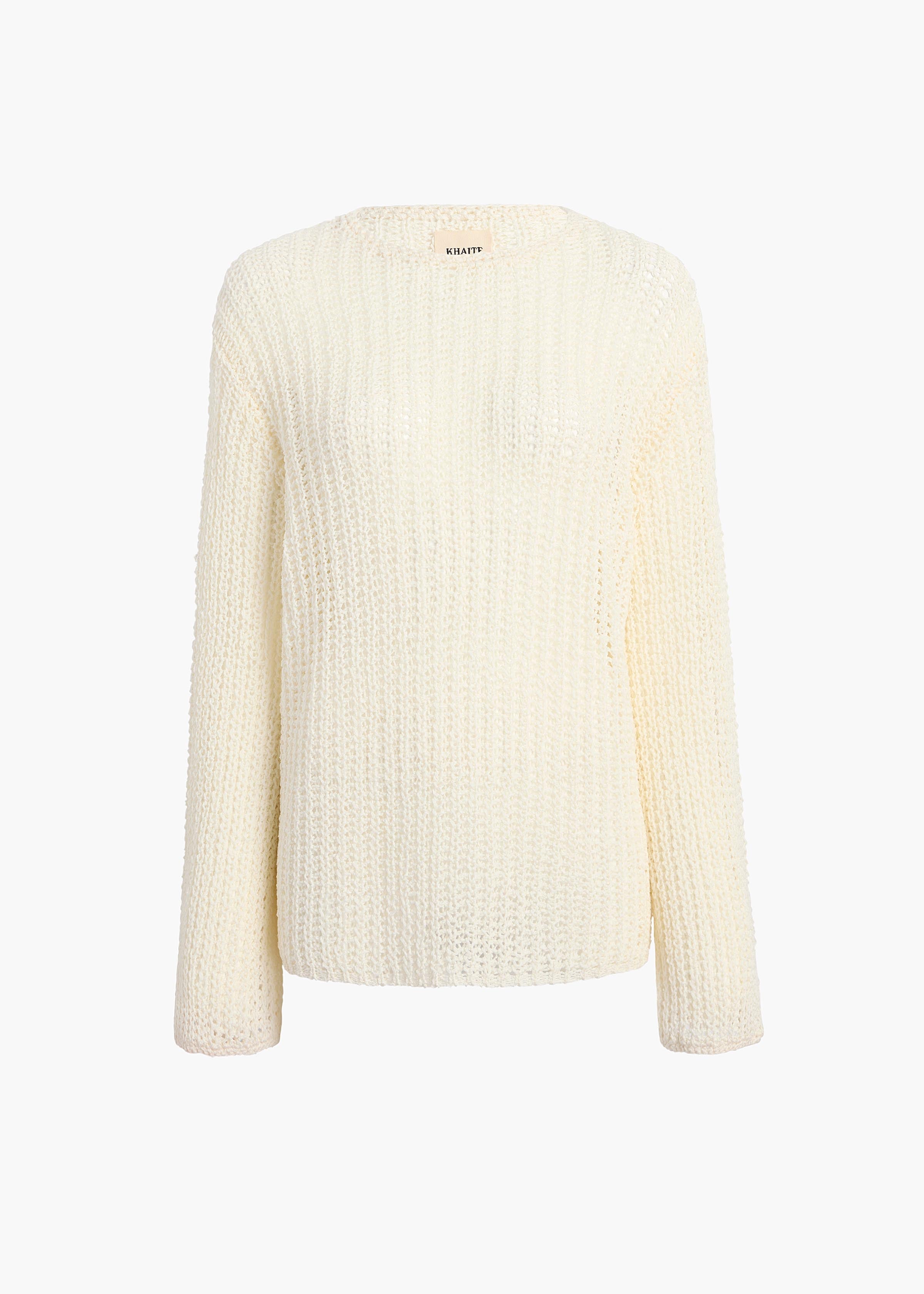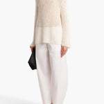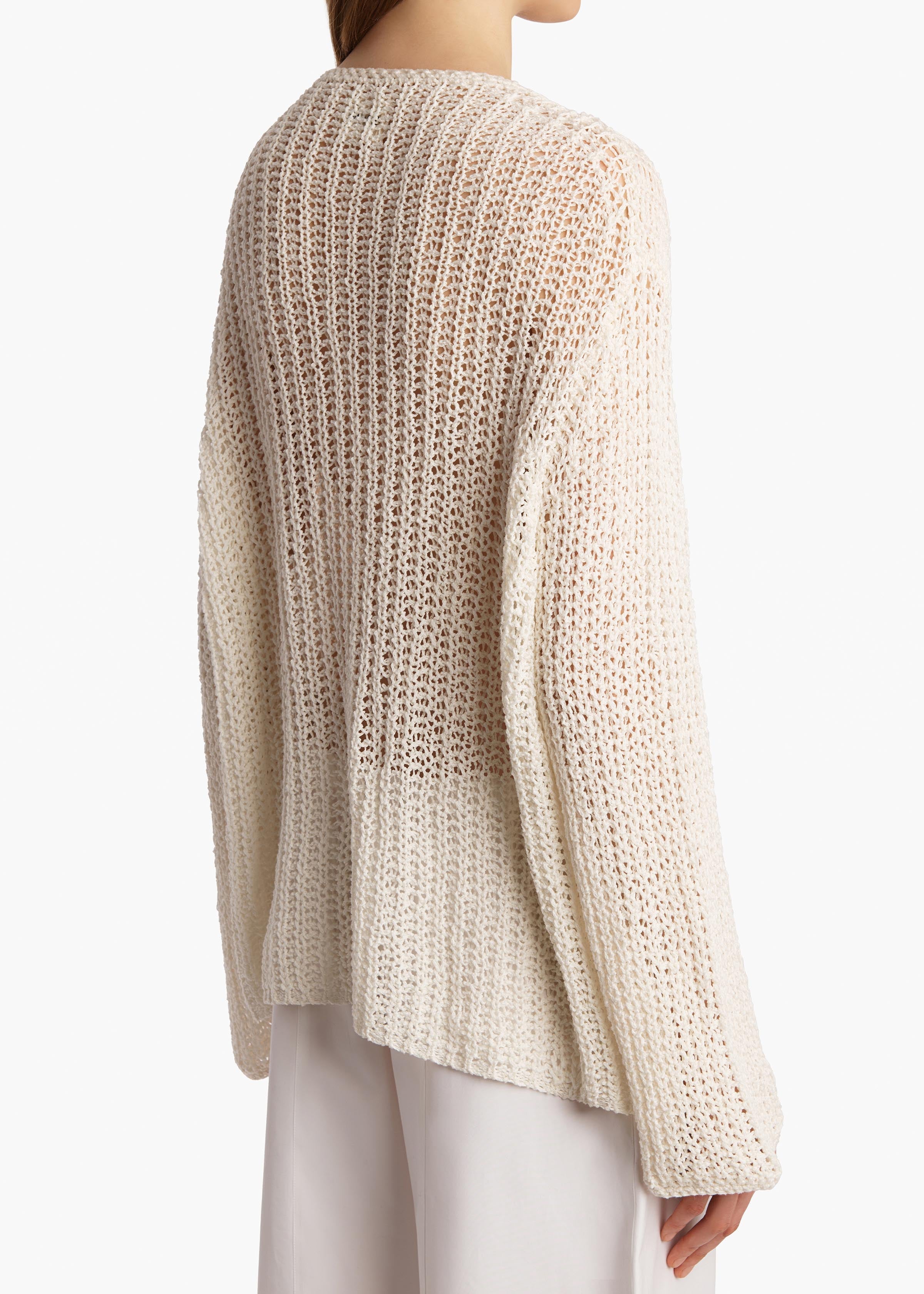 A relaxed fisherman’s-rib-knit pullover distinguished by its bouclé-like texture with a crisper character, made possible by cotton chain yarns made in Japan. Finished by hand, with crocheted trim at neckline and cuffs.