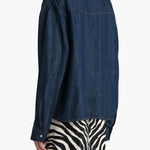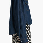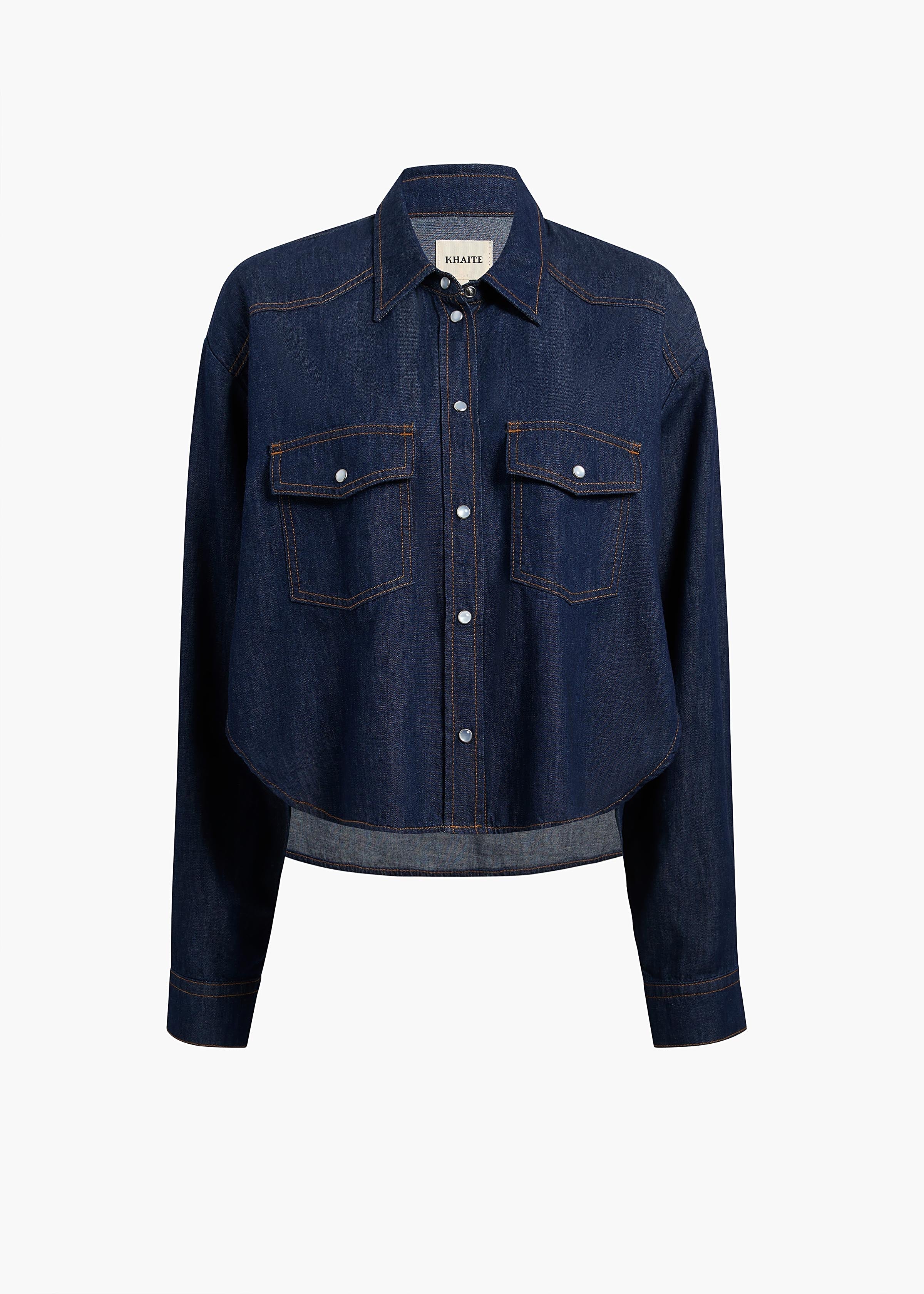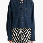 Designed for a slouchy fit, this cropped shirt accentuates the softness, lighter weight, and deep indigo hue of Japanese chambray. Shaped by Western yoke, with pearl snap closures and marigold topstitching. Angle-flap patch pocket at chest. Shirttail hem dips lower in back.