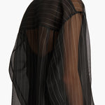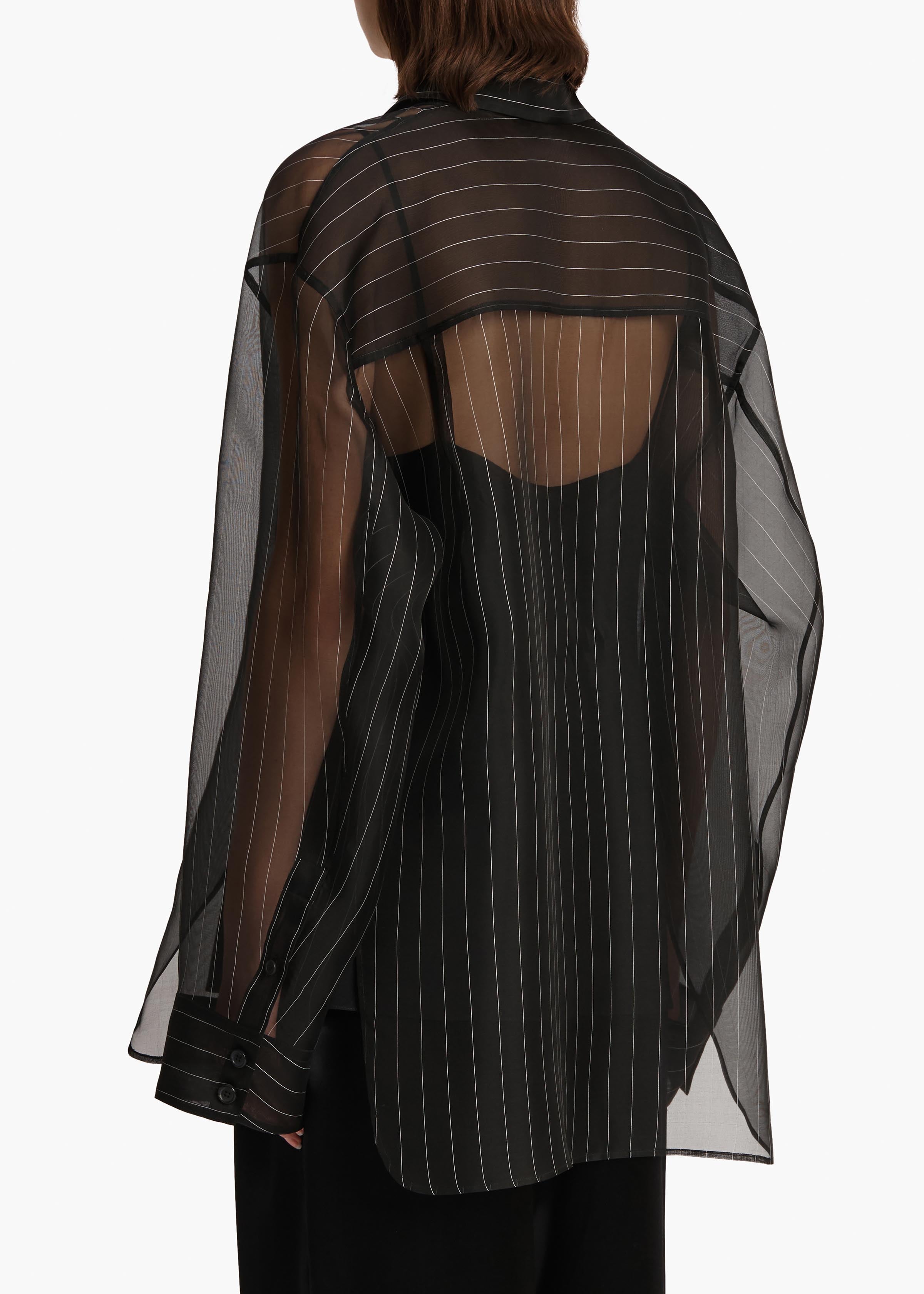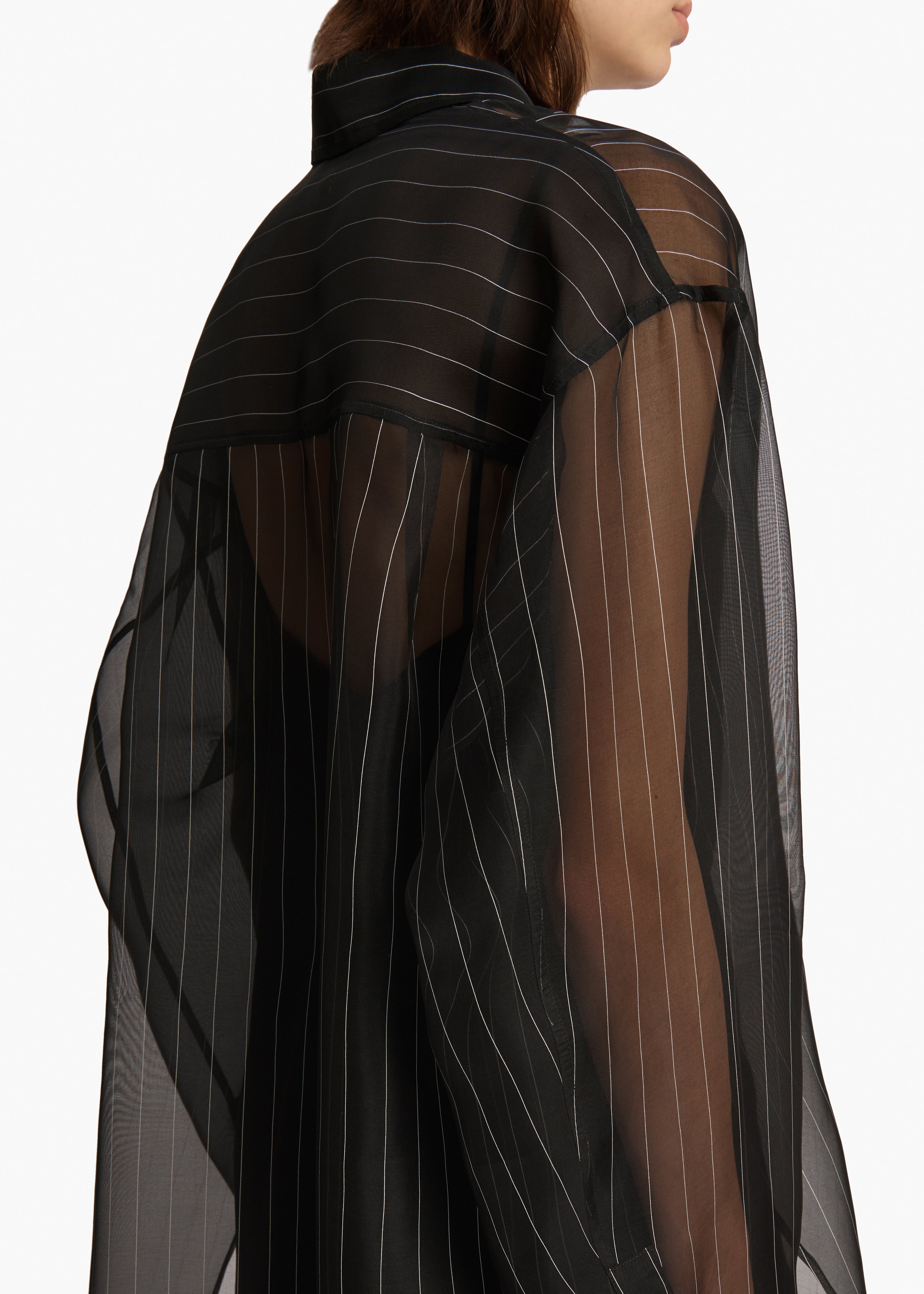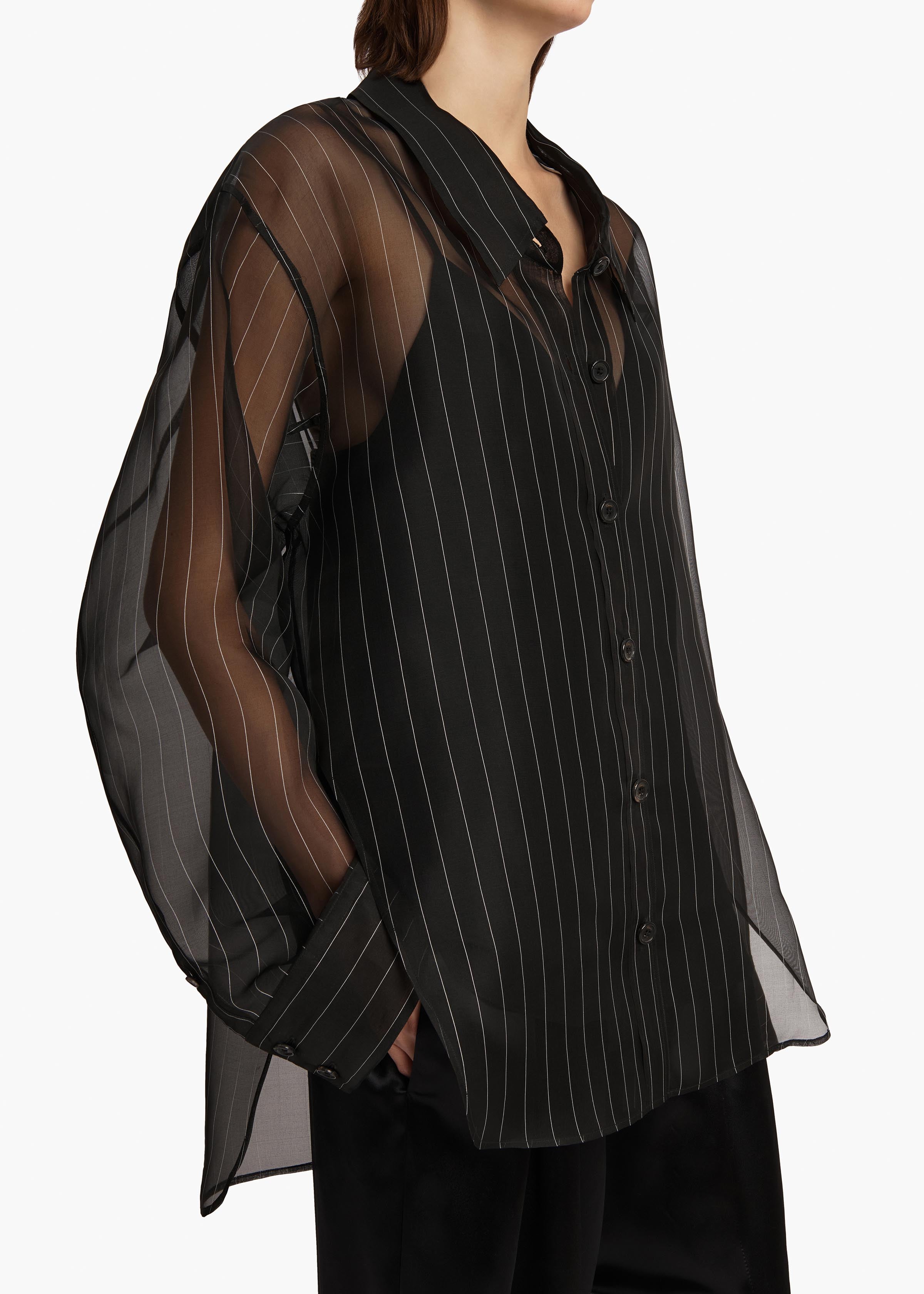 A relaxed button-up in pinstriped organza—crisp and lightweight. With dropped shoulder seams, back yoke, notched shirttail hem, and extended sleeves.
