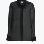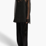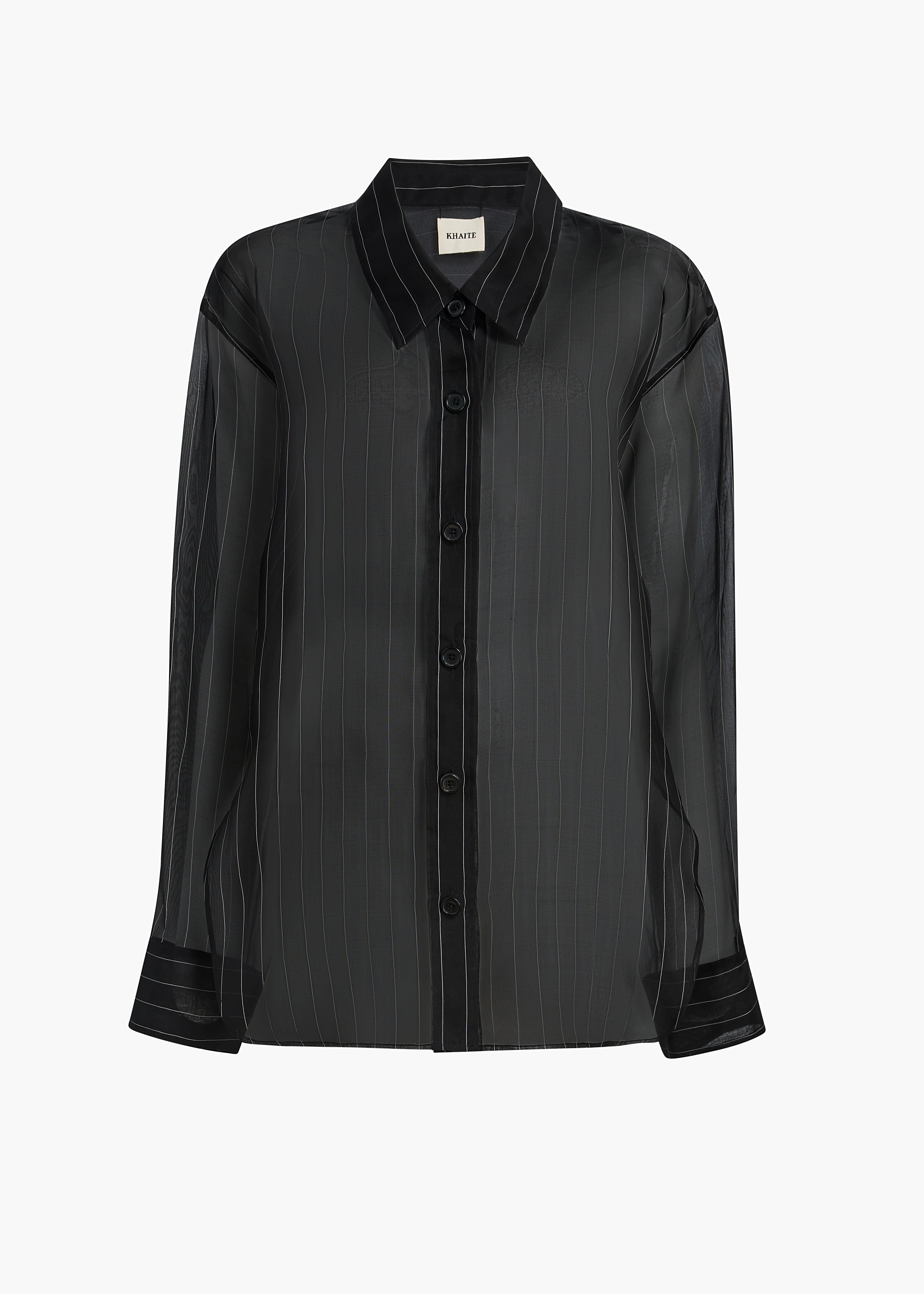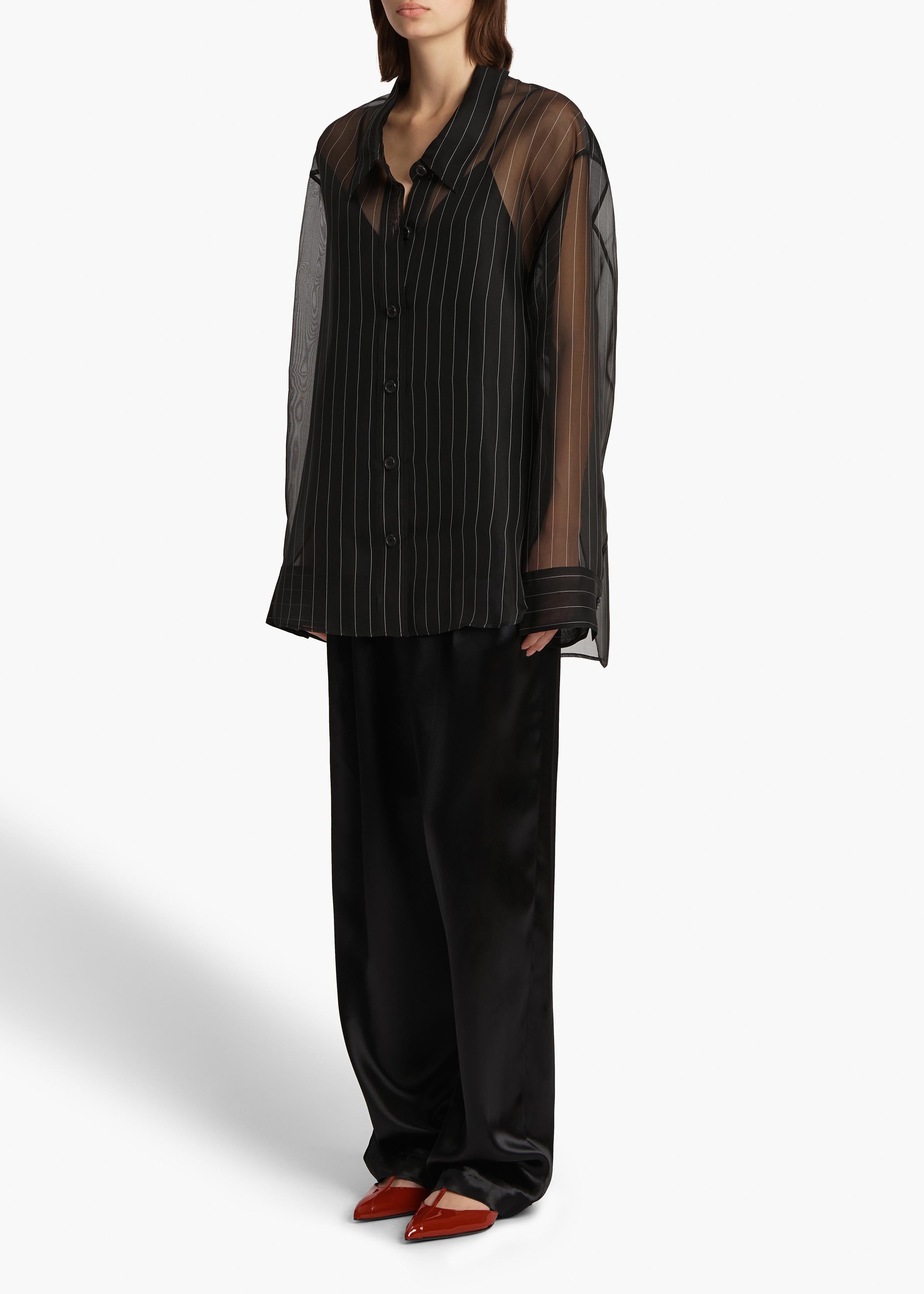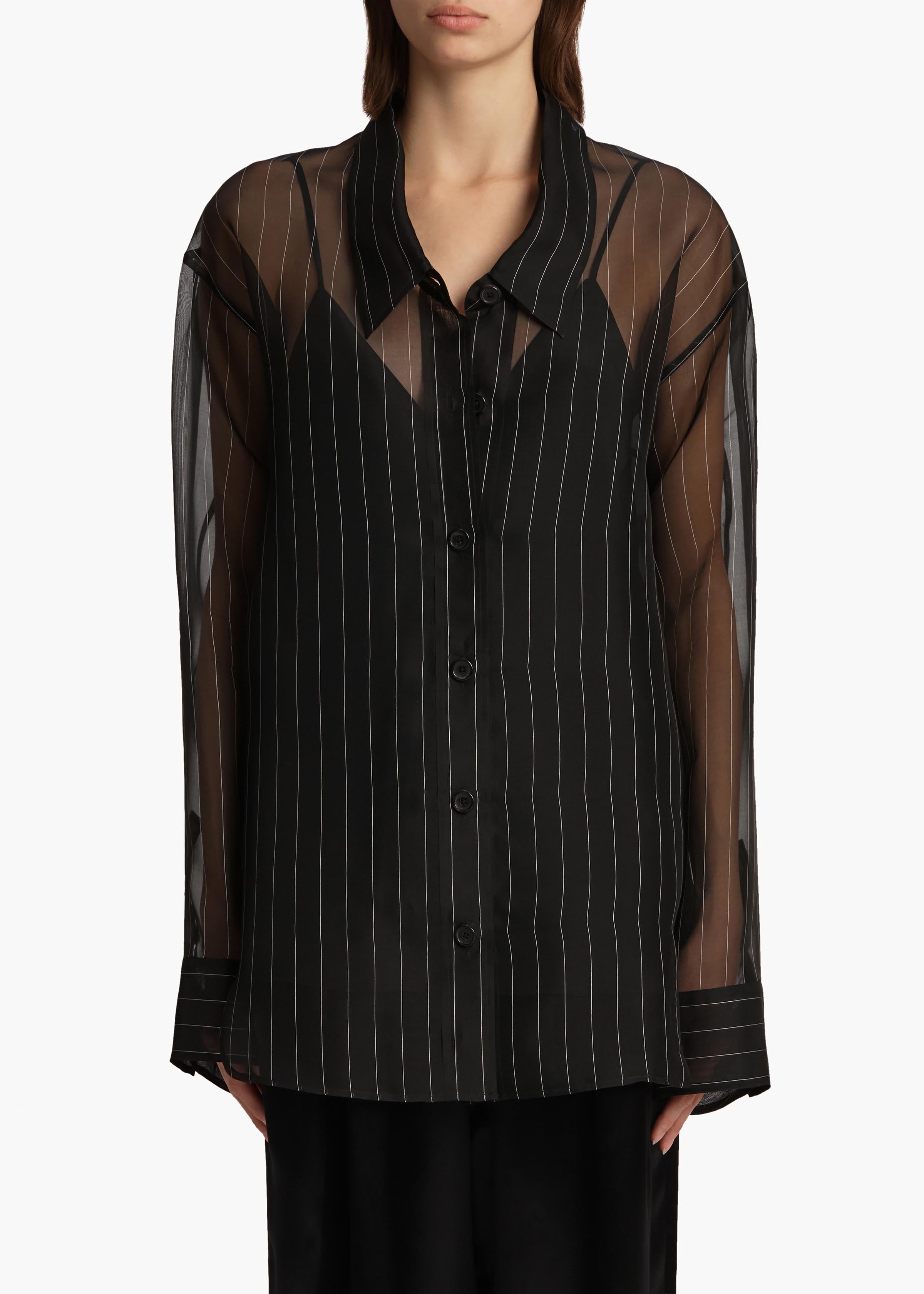A relaxed button-up in pinstriped organza—crisp and lightweight. With dropped shoulder seams, back yoke, notched shirttail hem, and extended sleeves.