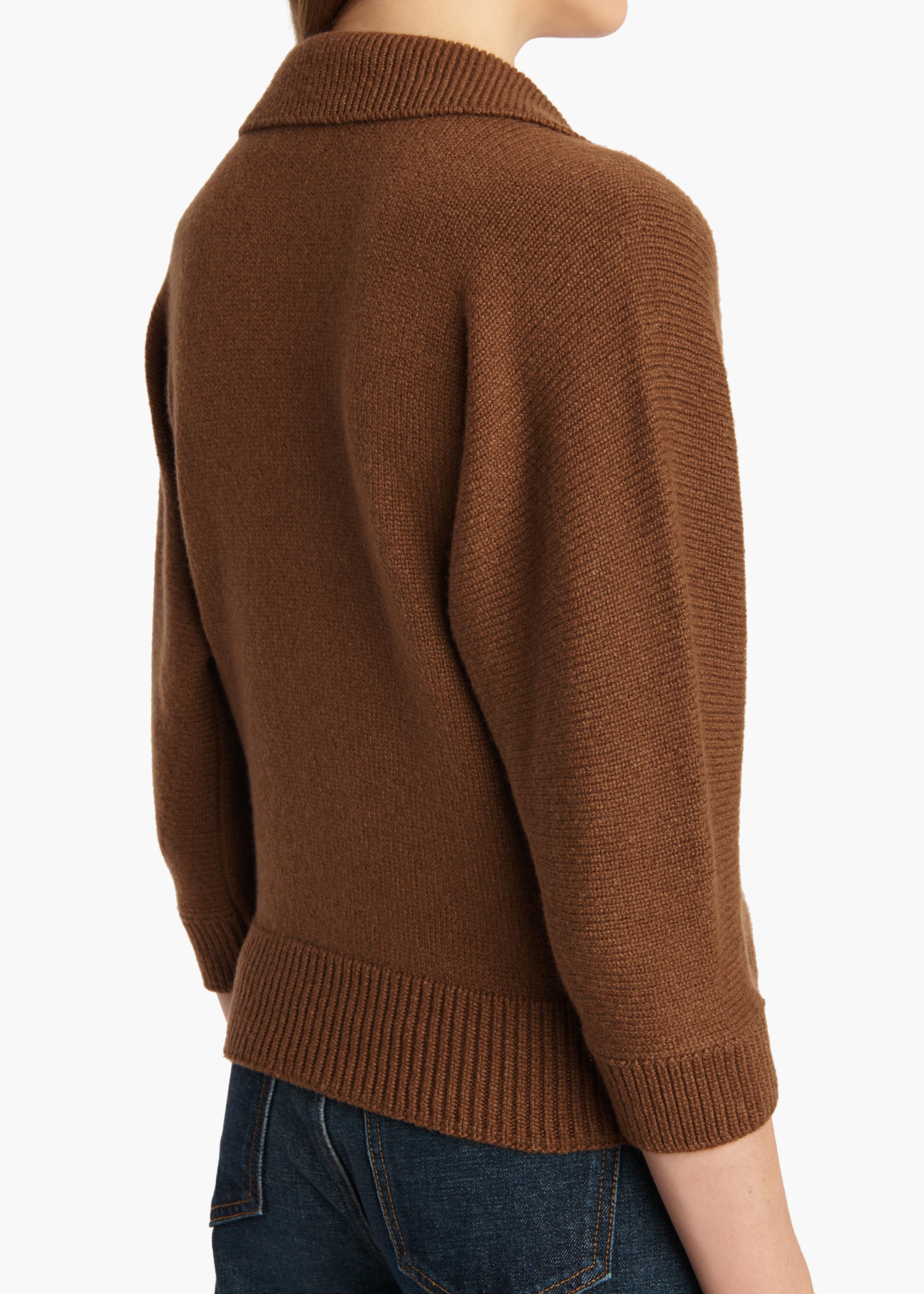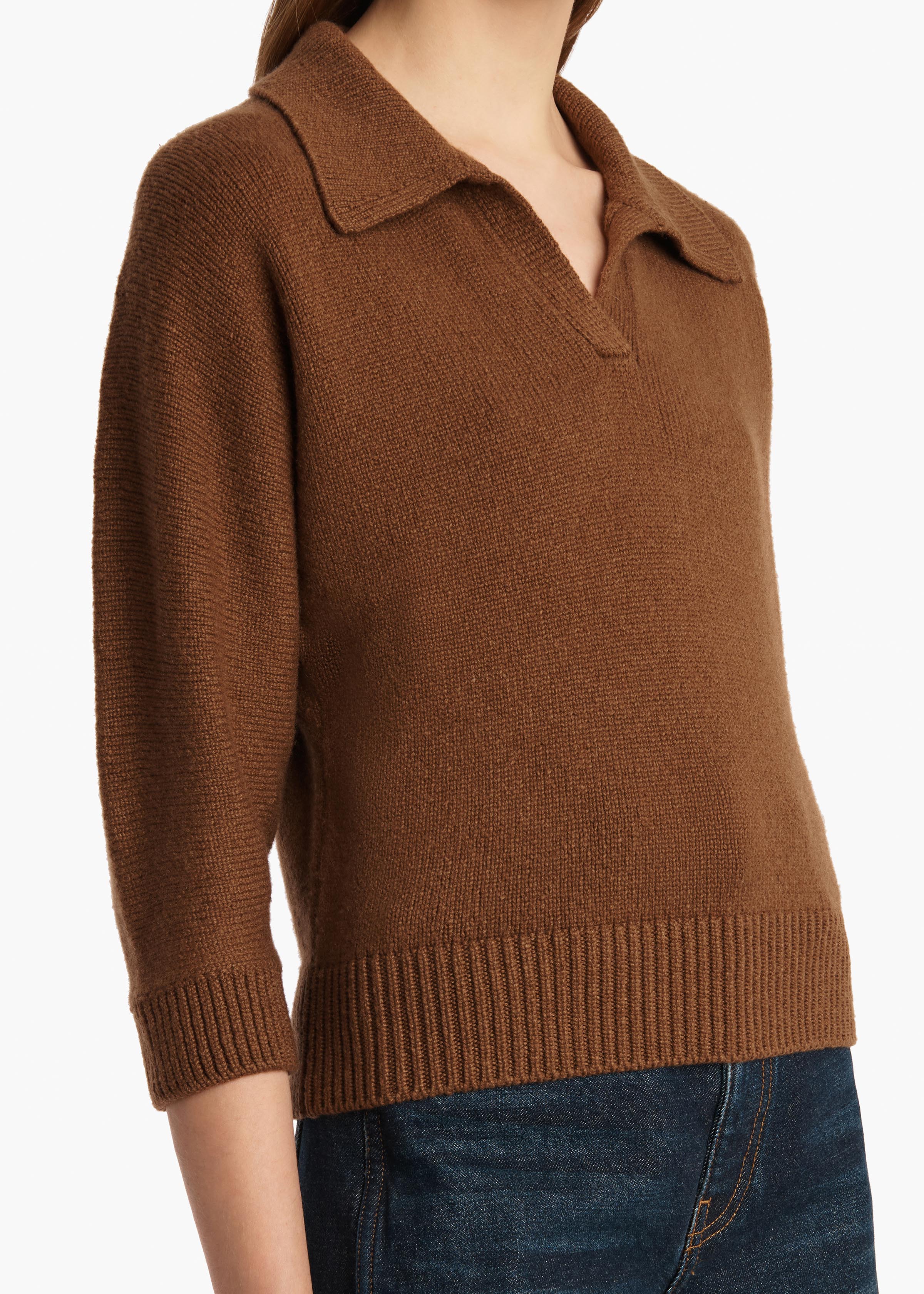 An open-neck polo in dense cashmere selected for its luscious fluidity. Designed for a shrunken yet eased look, free of seaming at armholes. Three-quarter-length sleeves. Refined by ribbing at collar, cuffs, and hem.