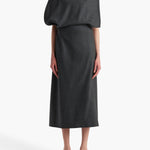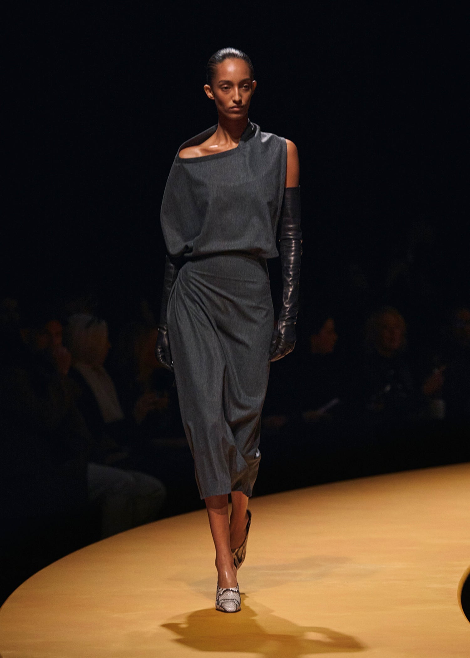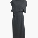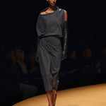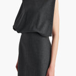 An apron-inspired silhouette in wool and cashmere shirting selected for its exceptional lightness and beautiful drape. Grommeted drawstring closure at back for customized fit. Refined by binding at draped neckline and armholes.