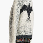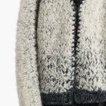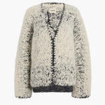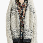 An enveloping hand-knit cardigan that pushes the boundaries of craft in a marled gradient made possible by four yarns of varying weights and textures and the skill of New York artisans. Intarsia-knit sparrow at back. Refined by whipstitched trim at the v-neck, open placket, and cuffs.