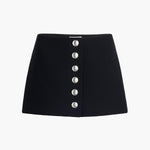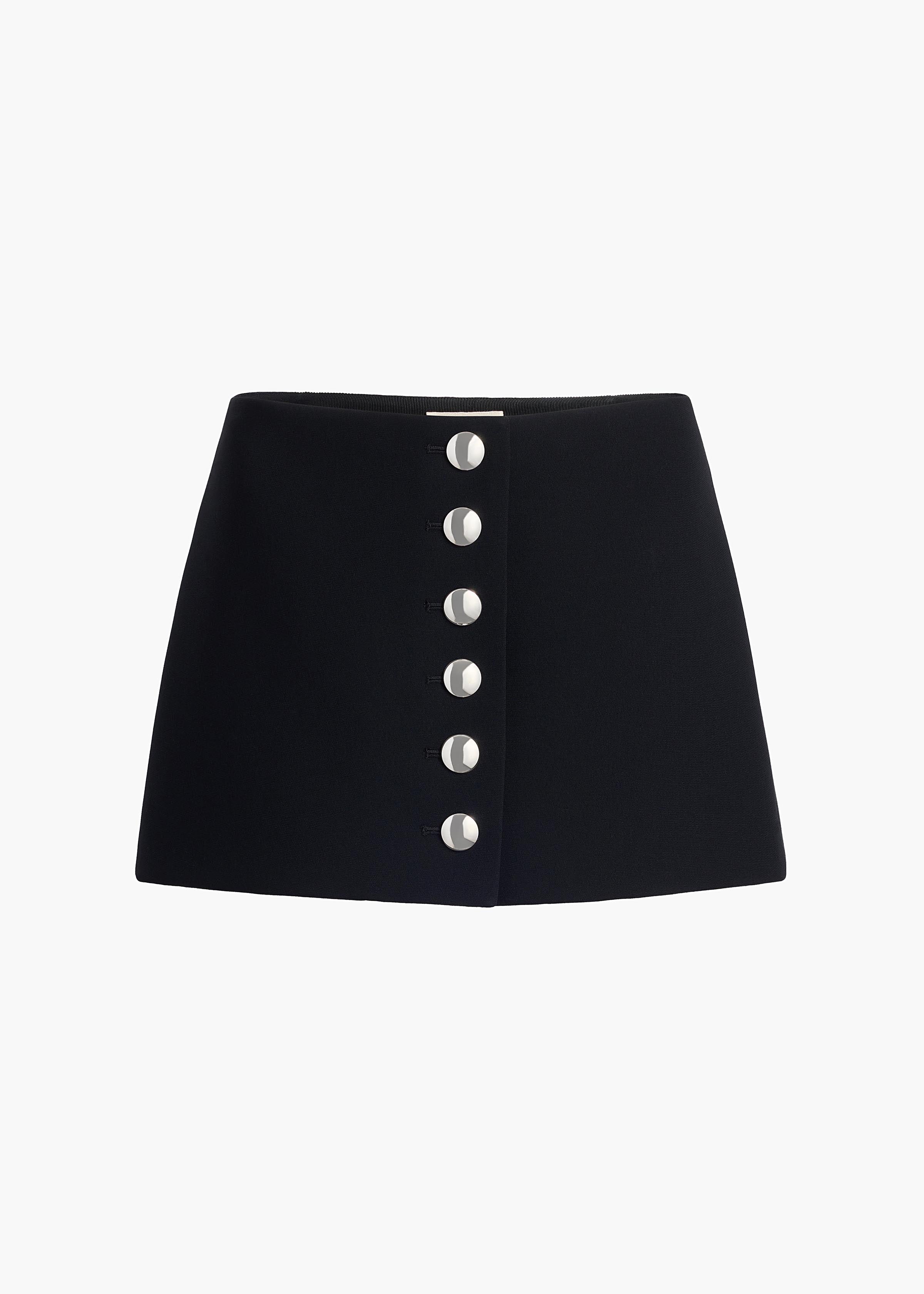 A minimal miniskirt in spongy and substantial double-faced crepe that hugs the body. Six trompe l'oeil silver stud button conceal snaps for ease. Darted back.
