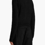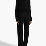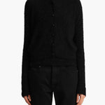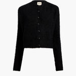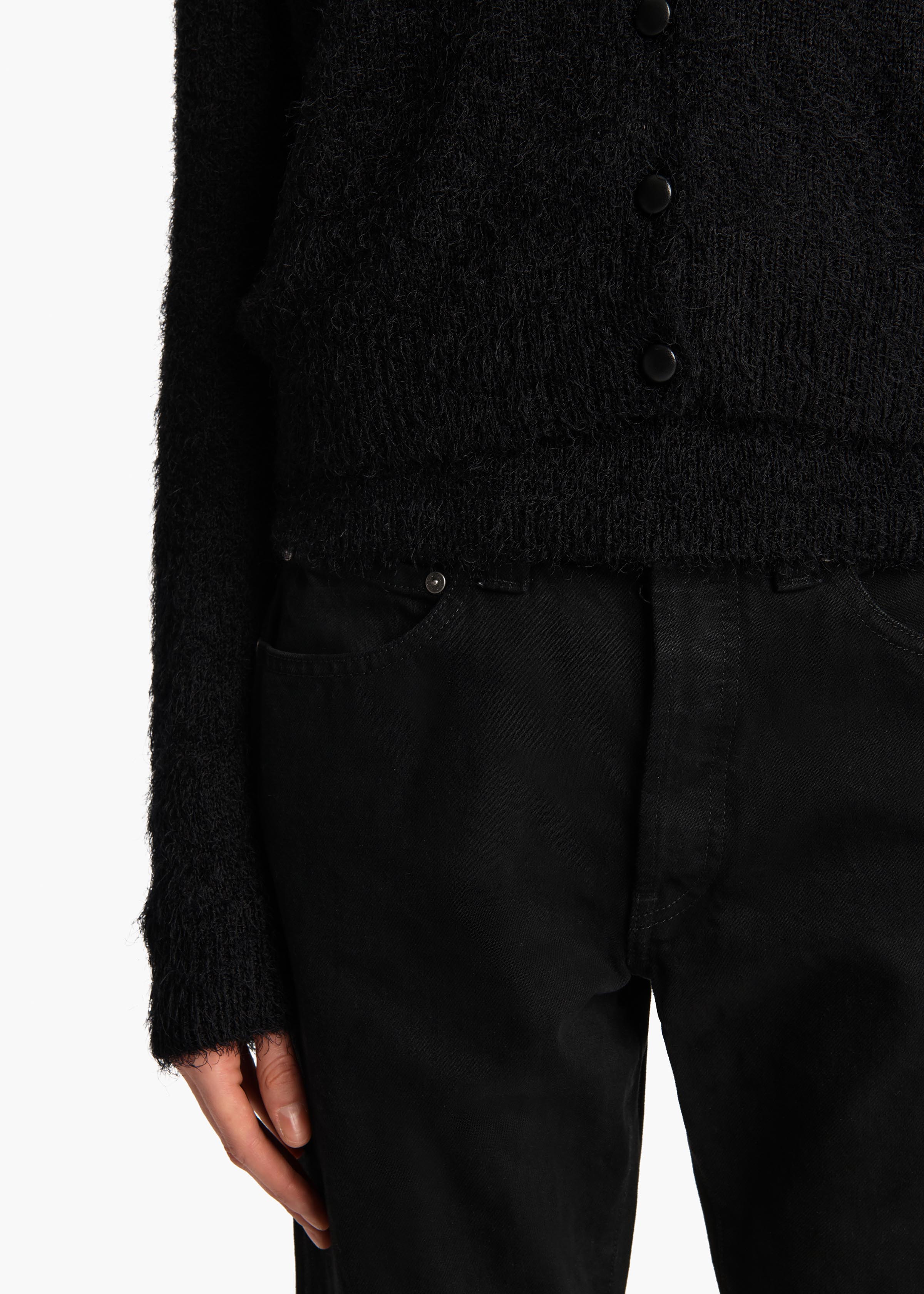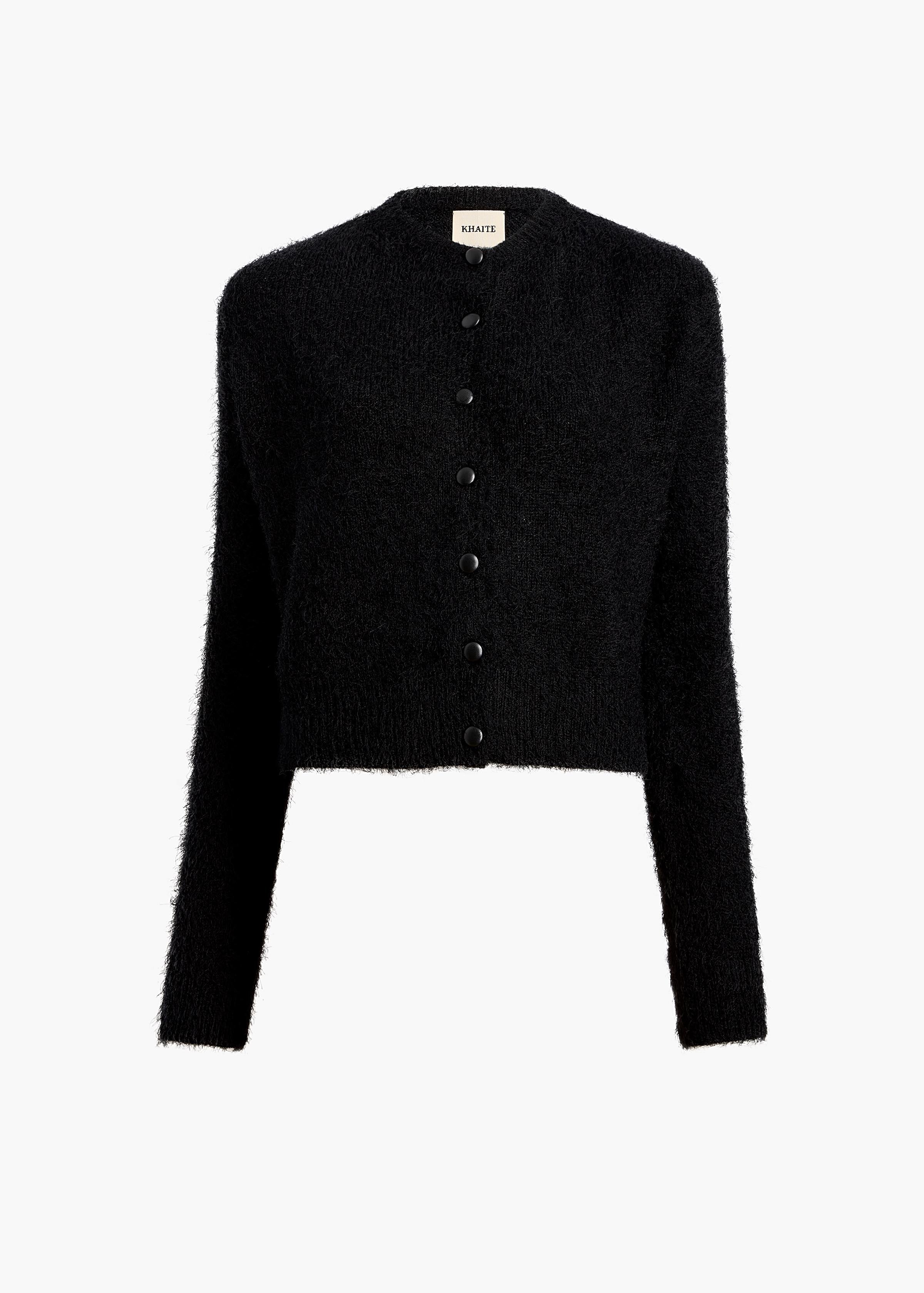 A crewneck cardigan of lustrous "eyelash" yarn selected for its silky, cool feel and breathability. Leather-covered buttons. Ribbing at neckline, cuffs, and hem.