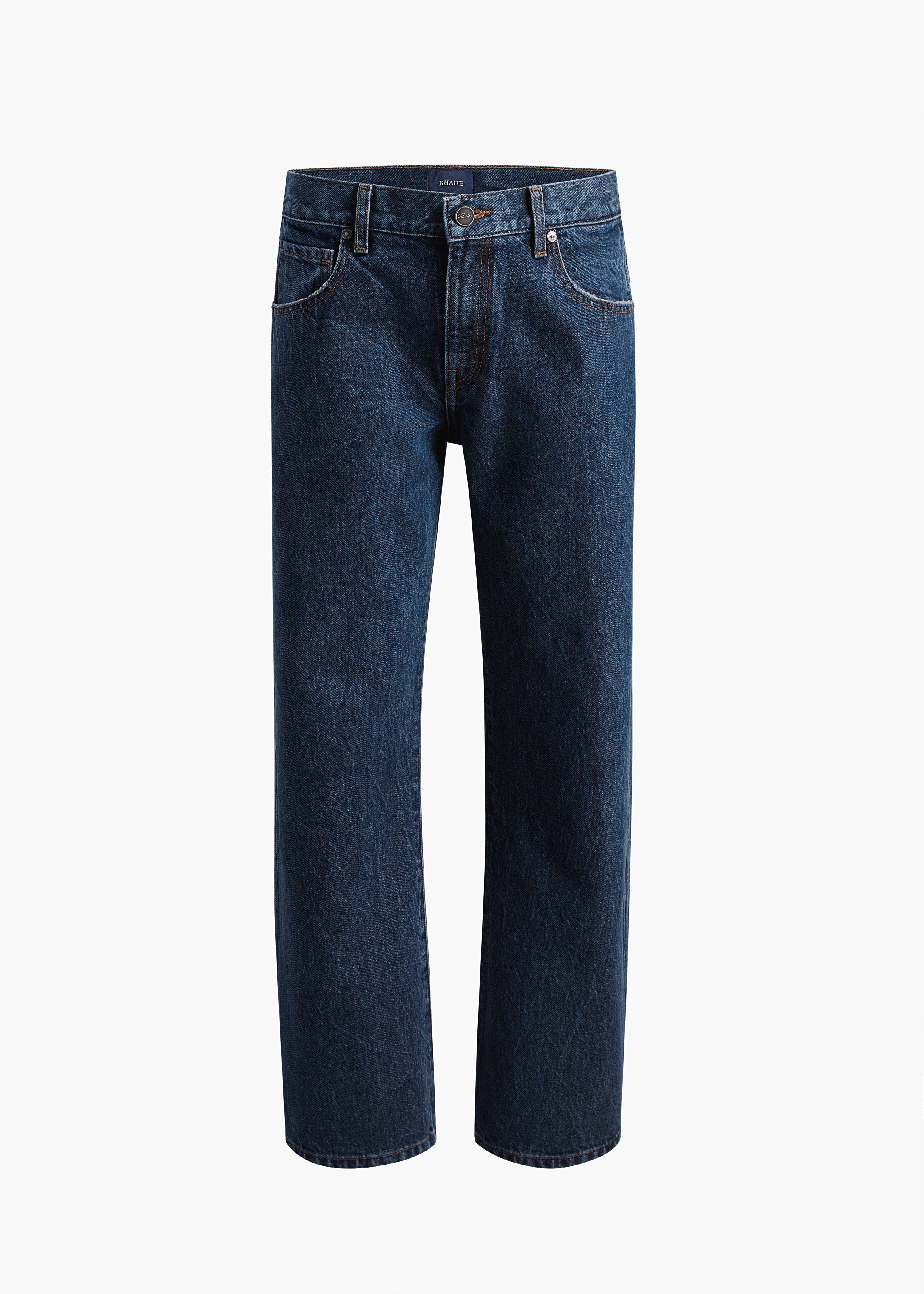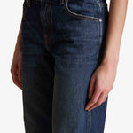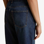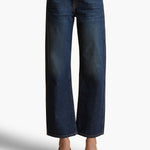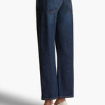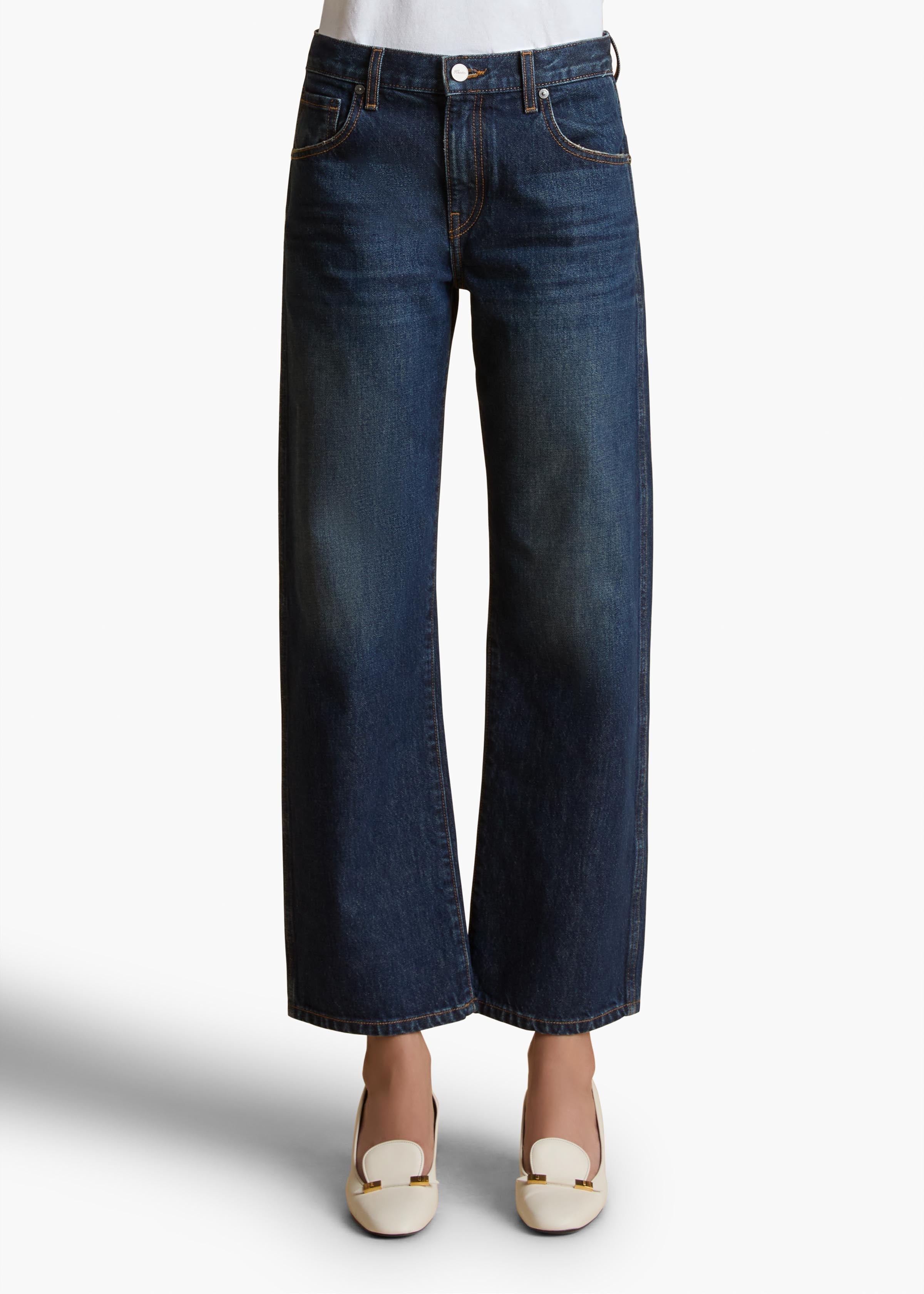 A curved inseam gives this mid-rise, wide-leg jean a flattering and feminine edge. With marigold topstitching and a signature button.