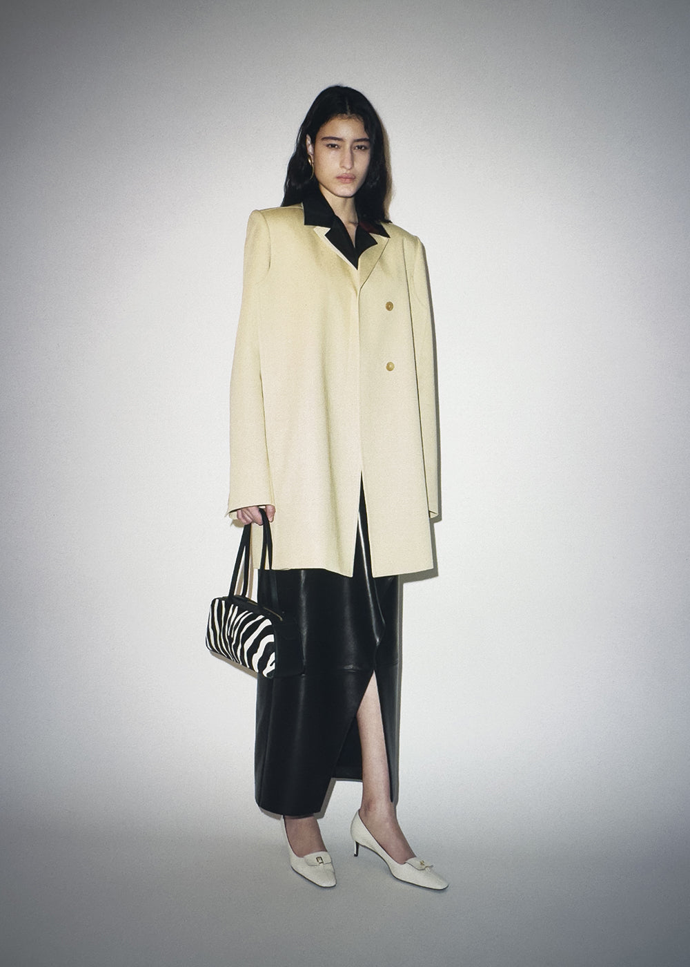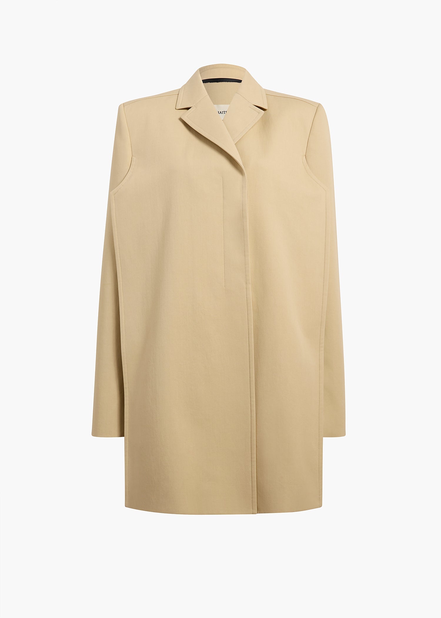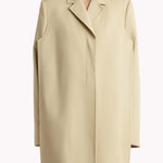 An elongated silhouette designed for a strikingly flattened look, with sharp flanged edges at sides. High neckline with notched lapels. Buttons at placket and cuffs. Includes button-in cashmere underlayer refined by contrast leather binding and hand-sewn topstitching; wear as liner or a standalone coat.