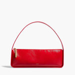 An elegantly elongated zip-top bag softened by the curves of its integrated strap. Art Deco-inspired zipper pull, internal card pocket, and tonal nappa lining.