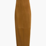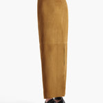 A high-waisted suede pencil skirt designed for a corset-like fit and shaped by darts. With a high slit and a concealed zipper closure at the back.