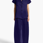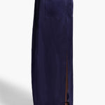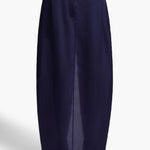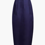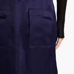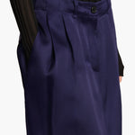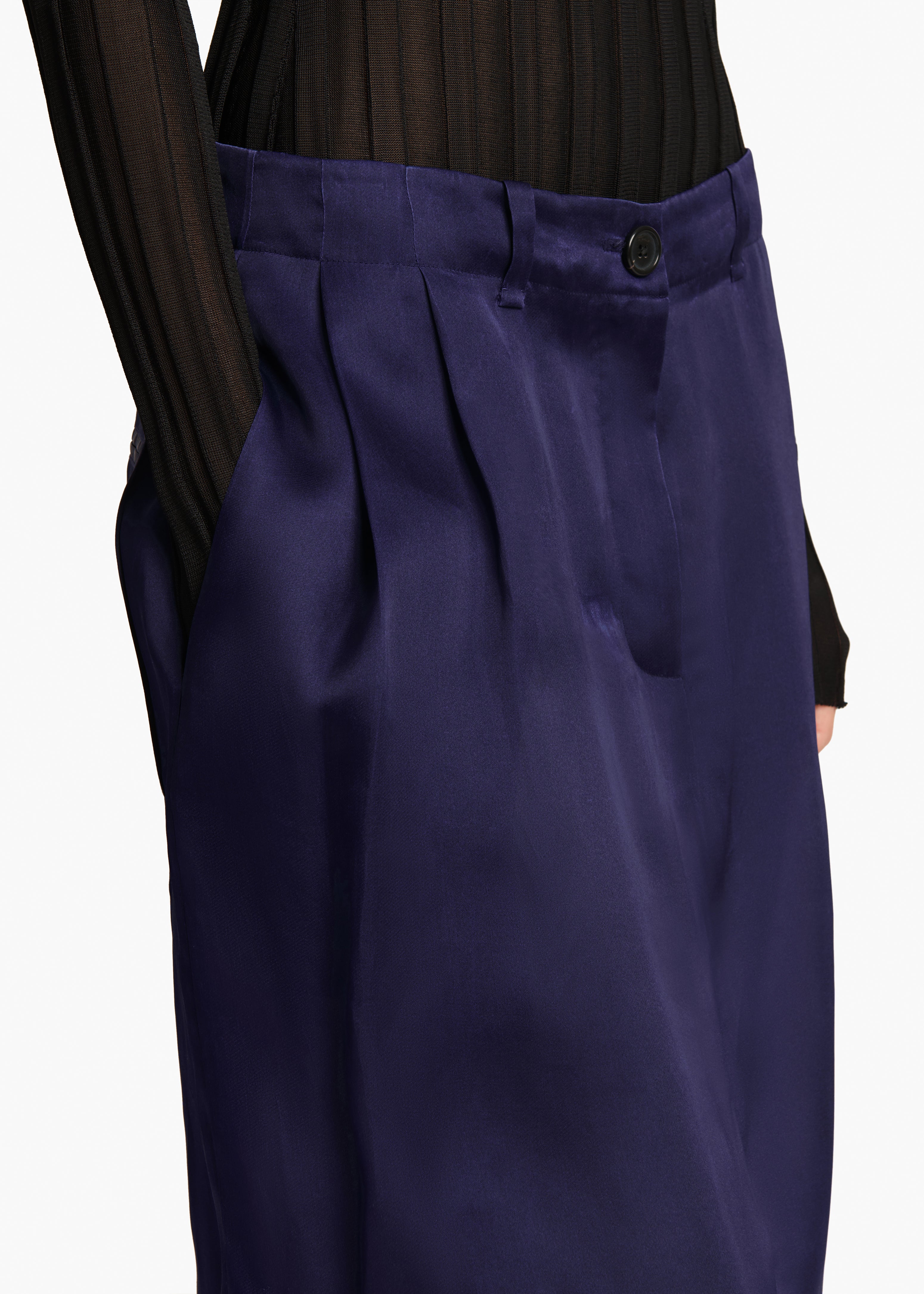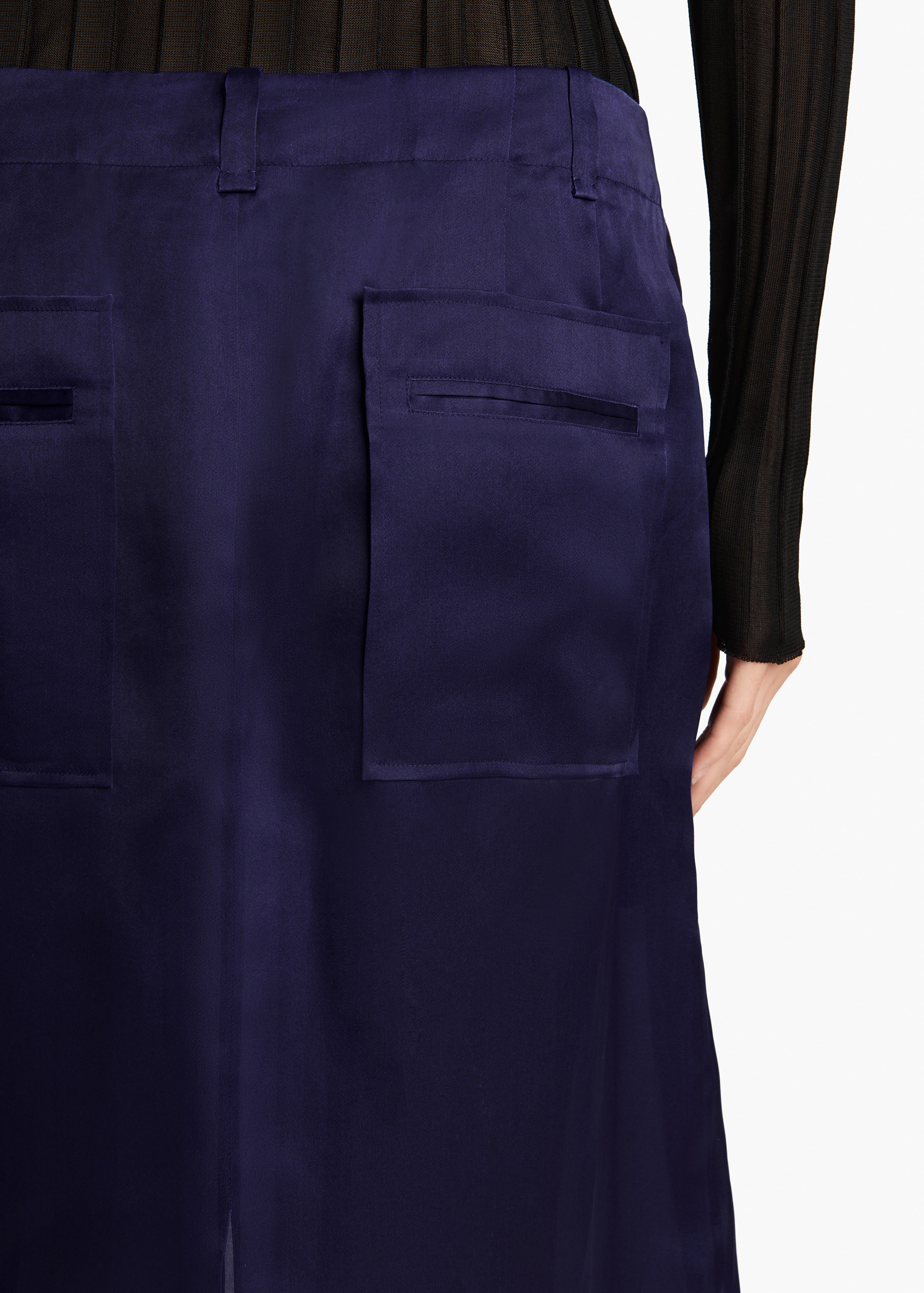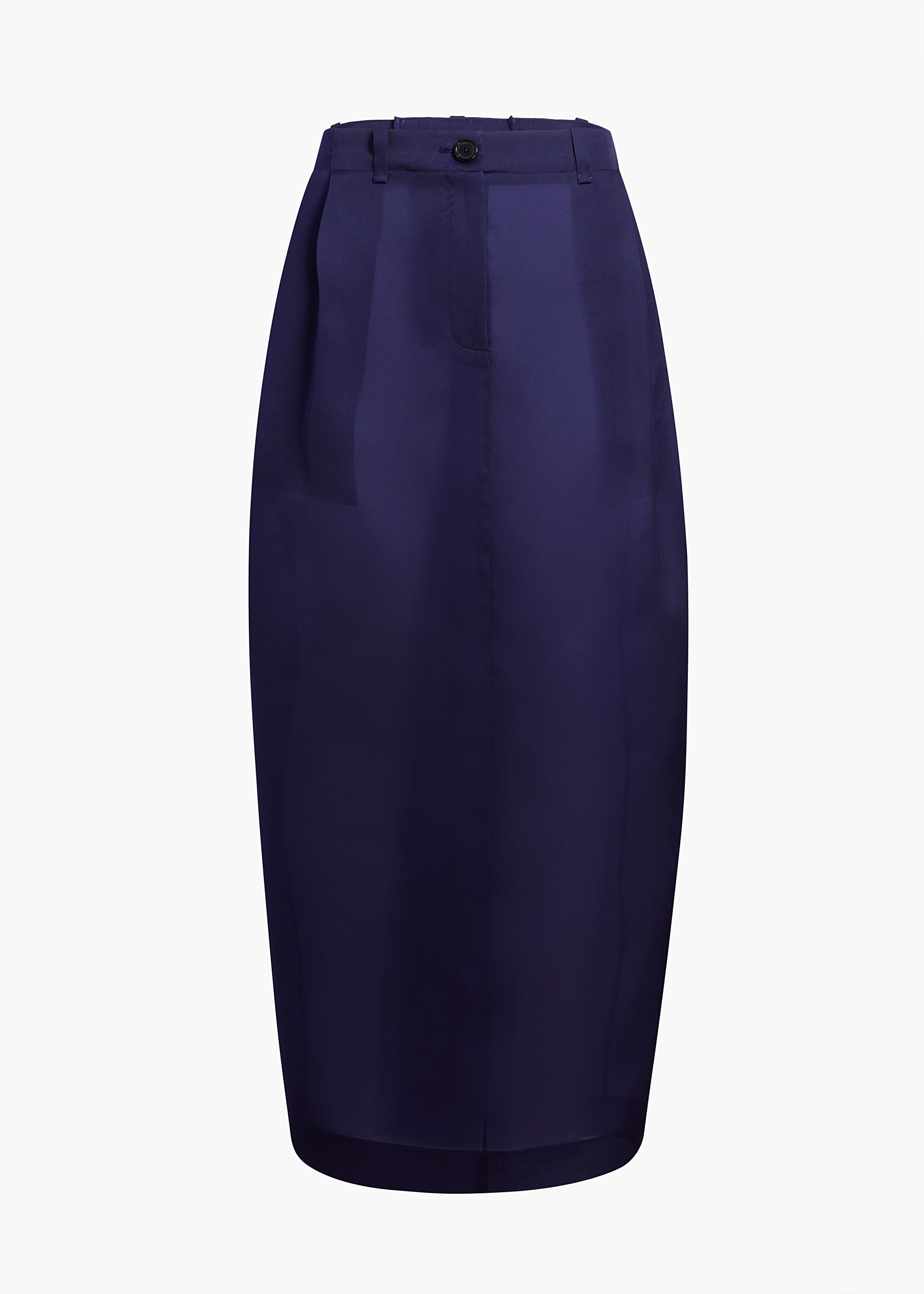 An elongated, pleat-front skirt in crisp silk organza. Trouser-style waistband with zip fly and button. In-seam side pockets. Welted patch pockets and back slit.