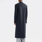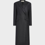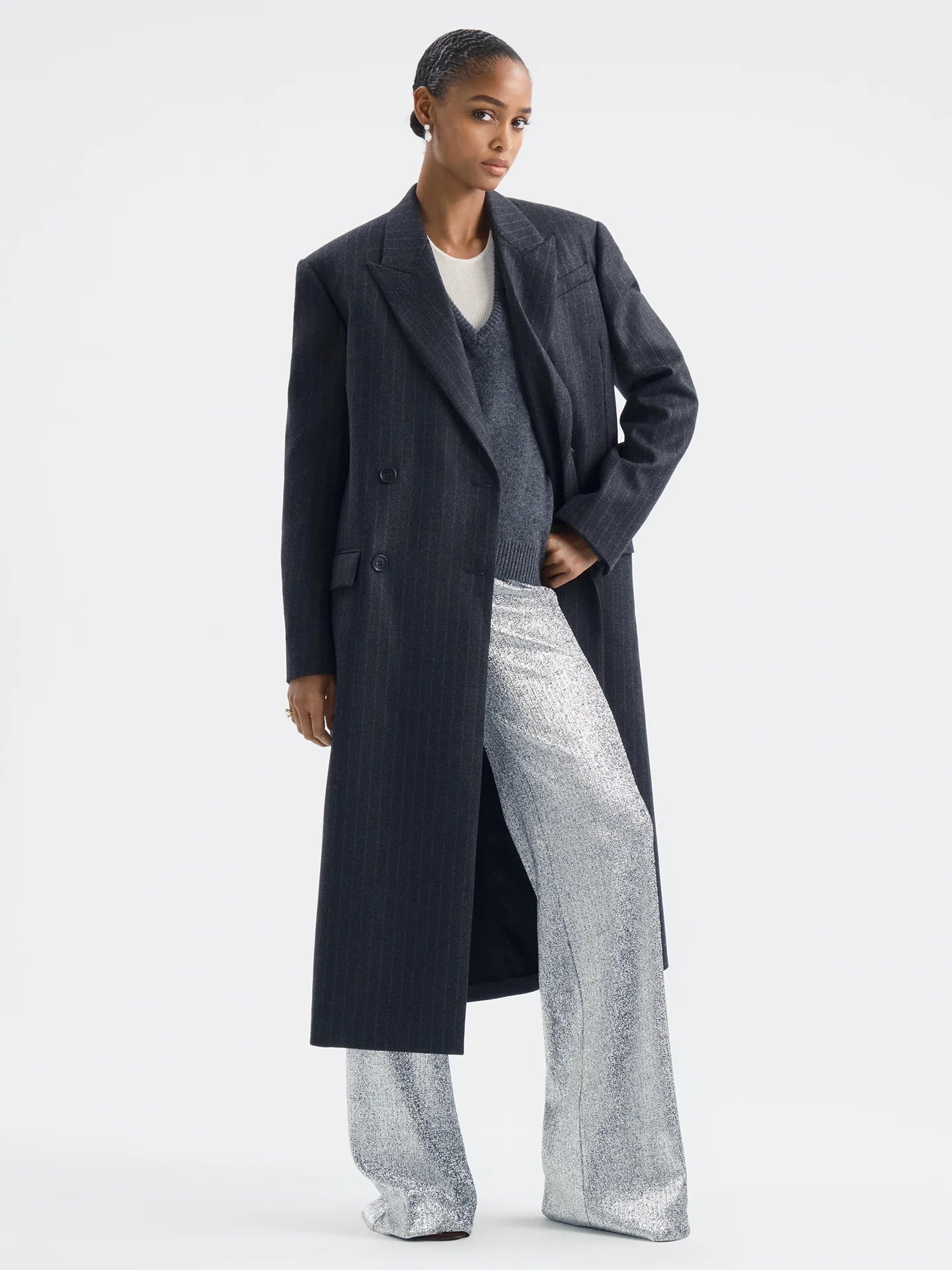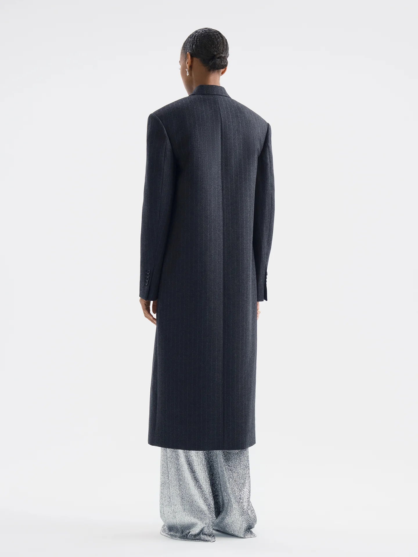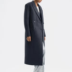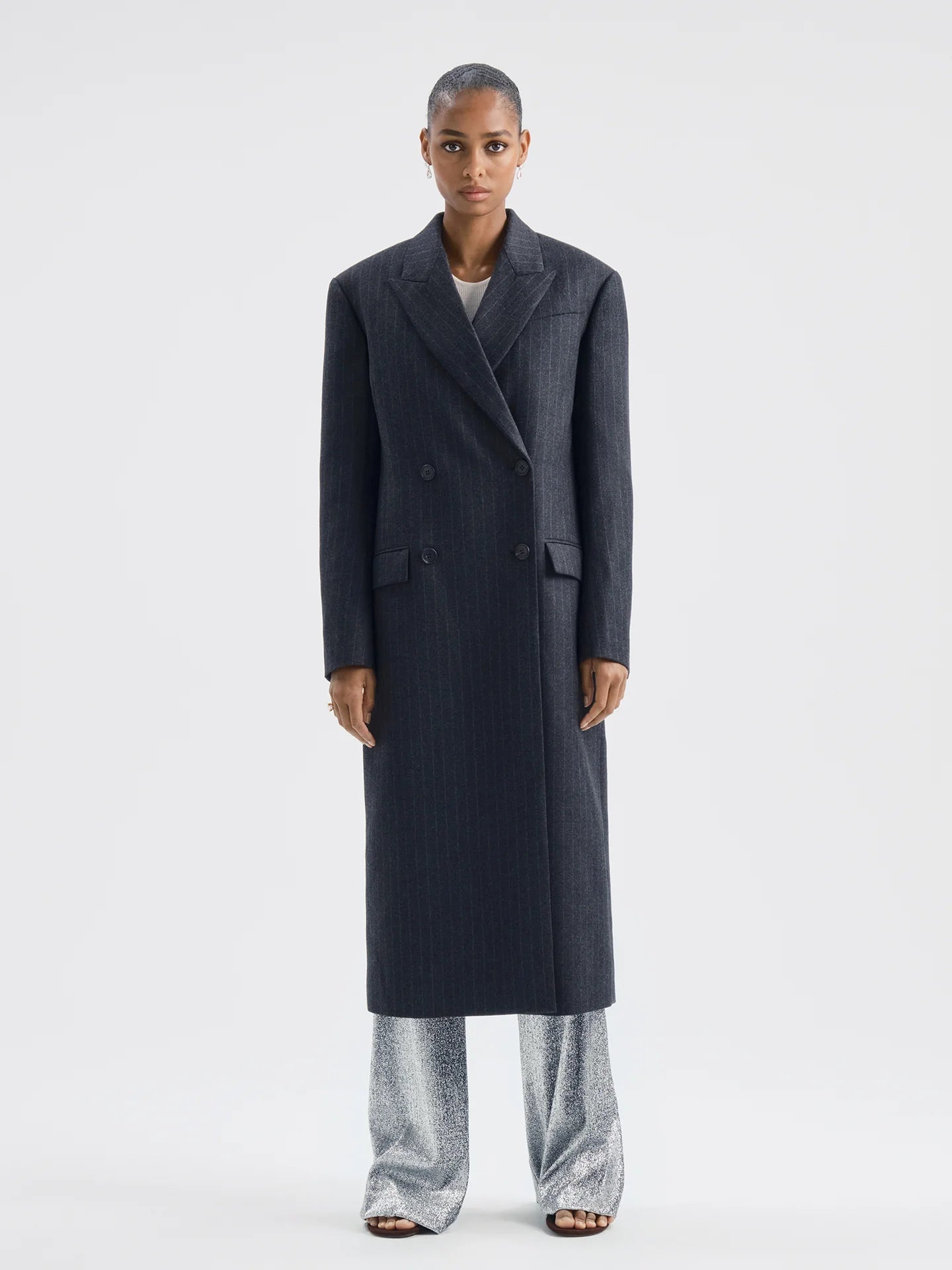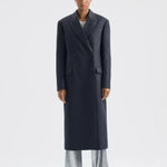 A double breasted coat with bold structured shoulders and front flap pockets. Crafted in a brushed Italian cashmere, fully lined, and adorned with horn buttons.