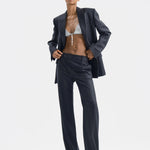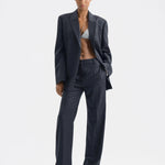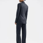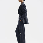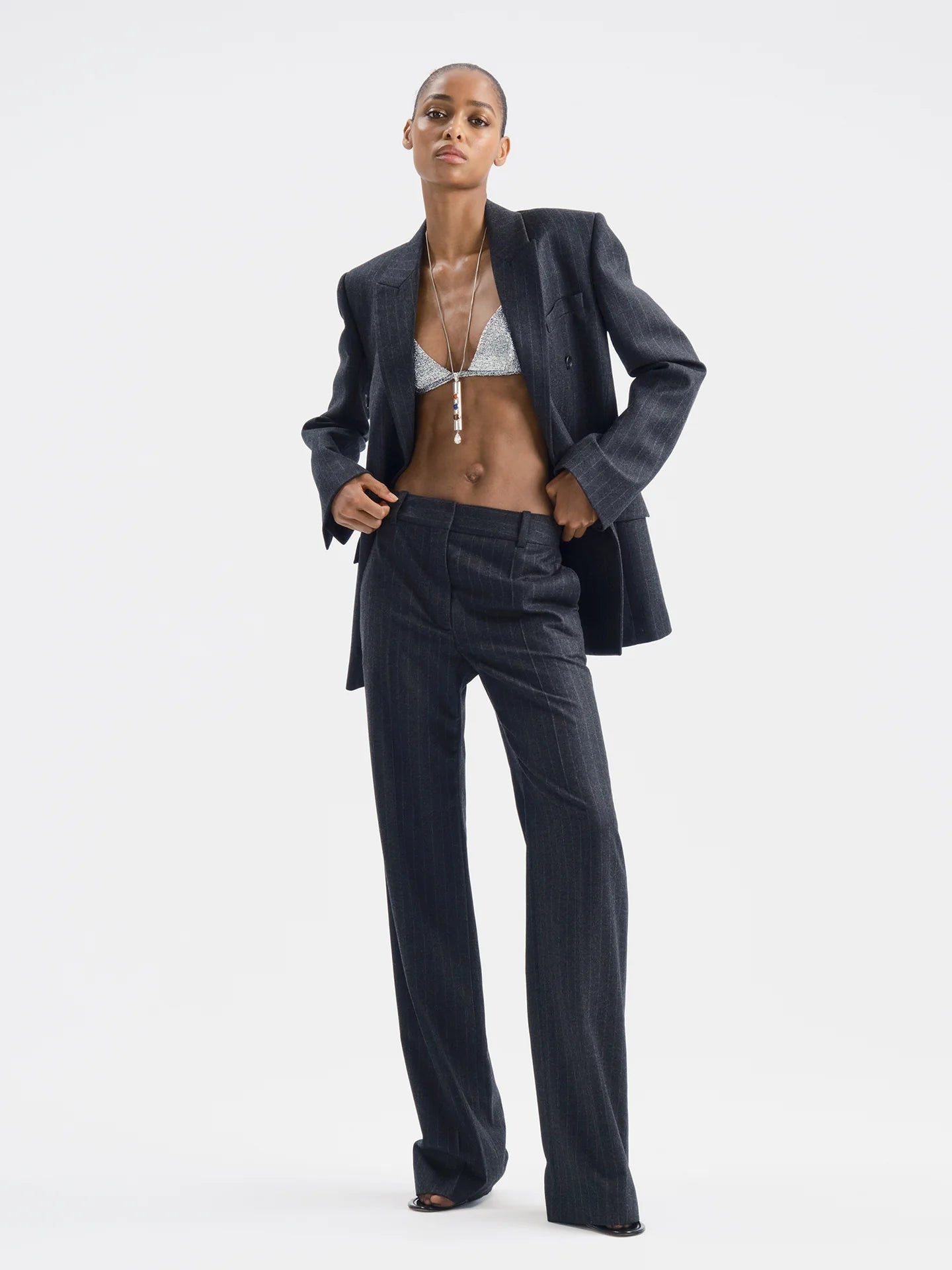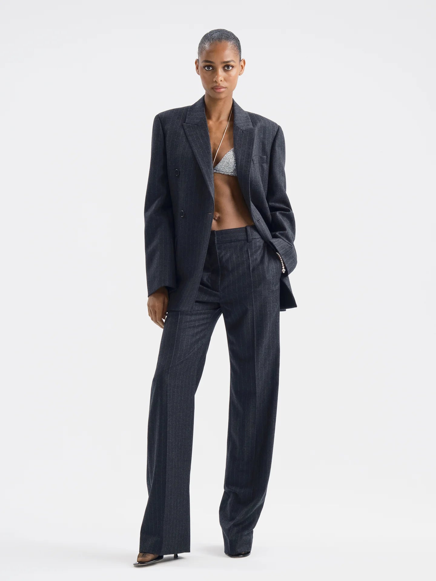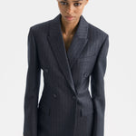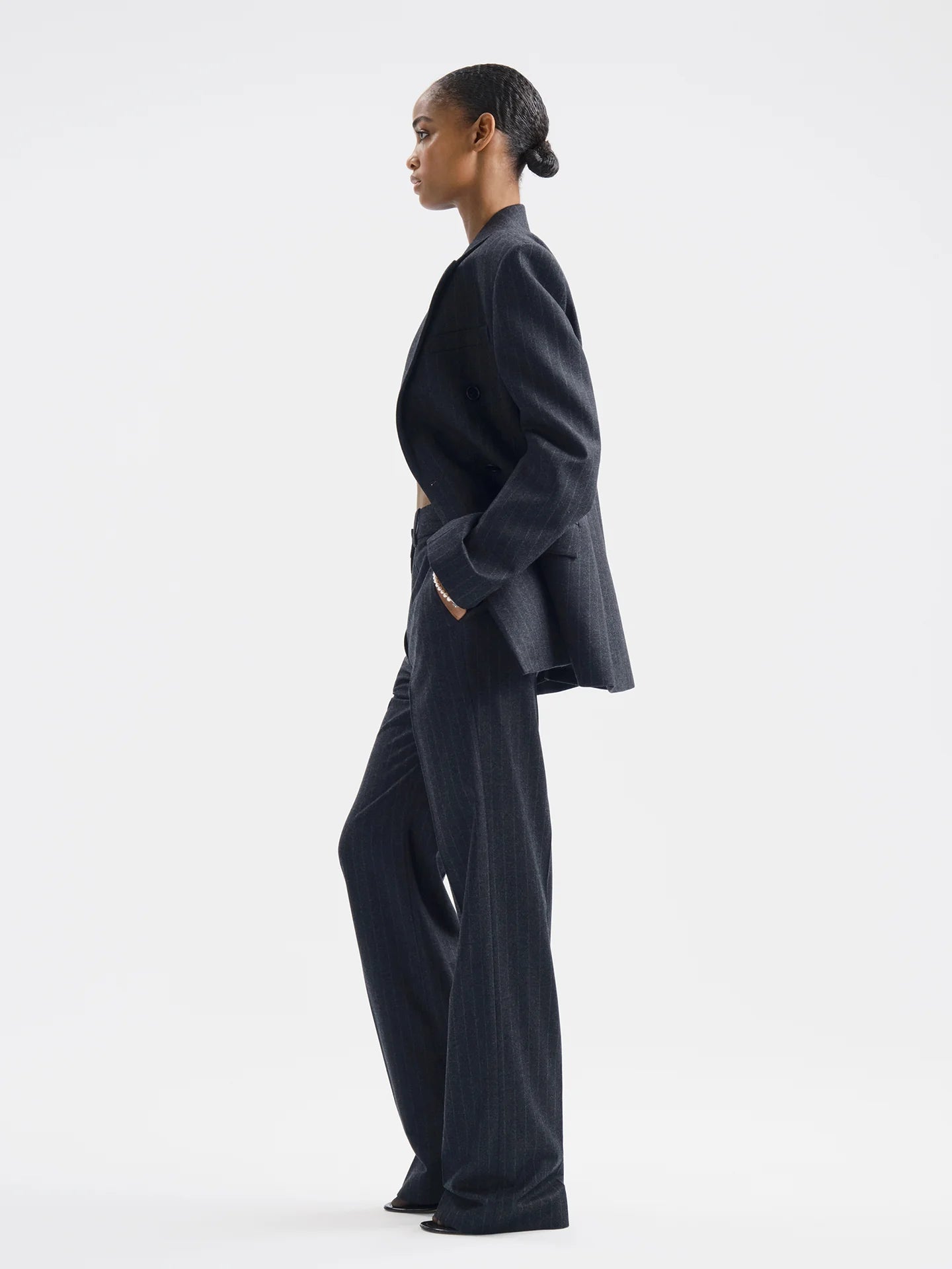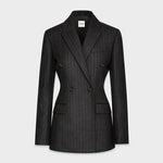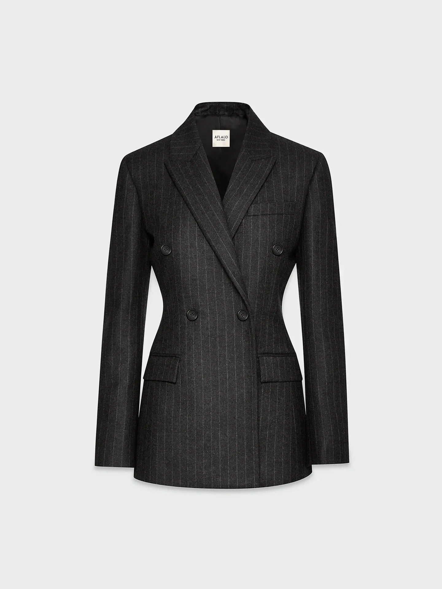 This is a fitted, double breasted blazer with a nipped waist, structured shoulders, and front flap pockets. Tailored from smooth Italian wool & cashmere flannel pinstripe, and adorned with horn buttons at the front and cuffs.