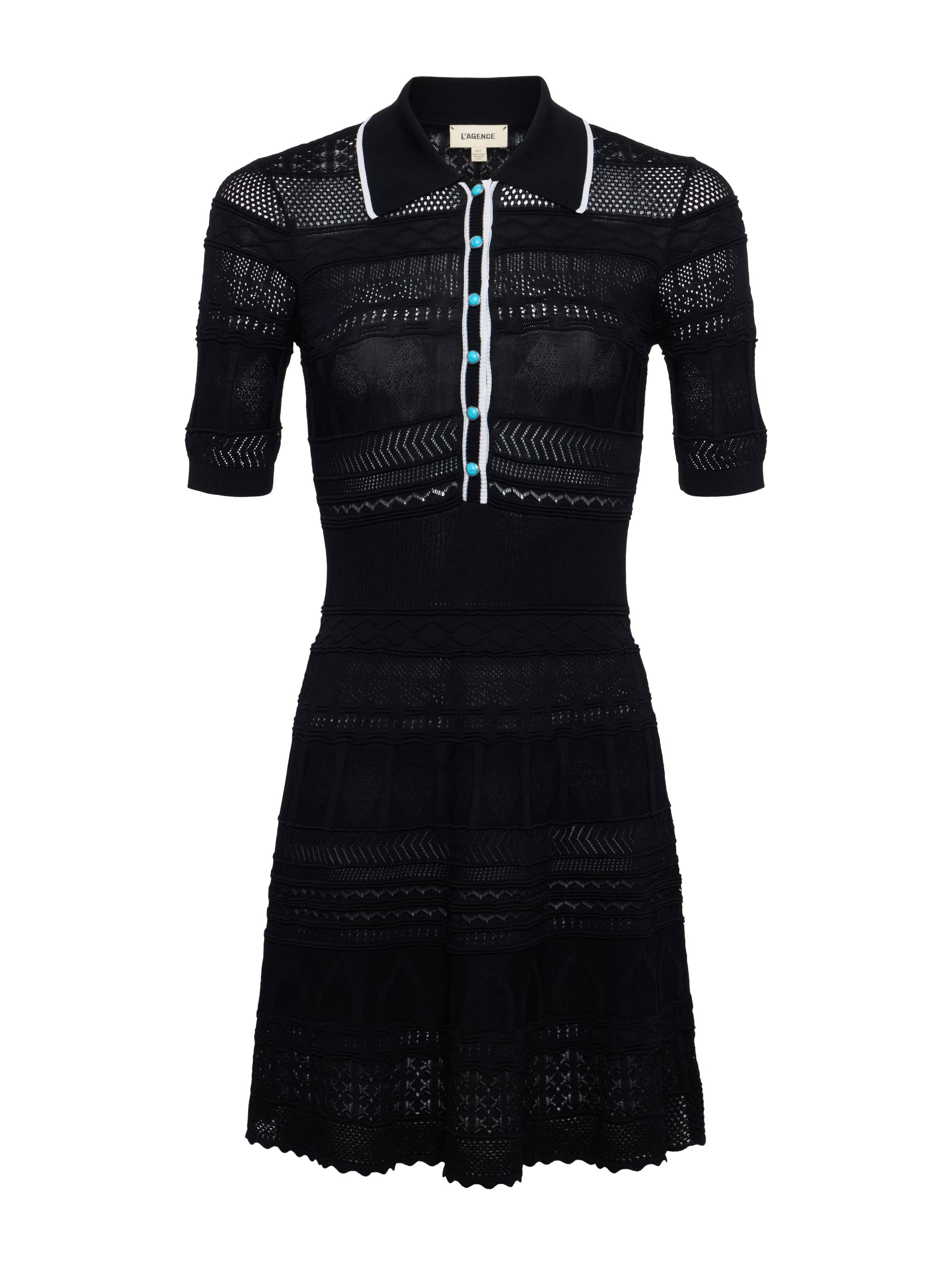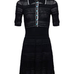 Feminine and refined, the Dakoa is a fit-and-flare dress, featuring a mix of knit patterns for texture and dimension. A waist-defining ribbed panel creates a flattering silhouette, while contrast turquoise buttons add visual interest.
