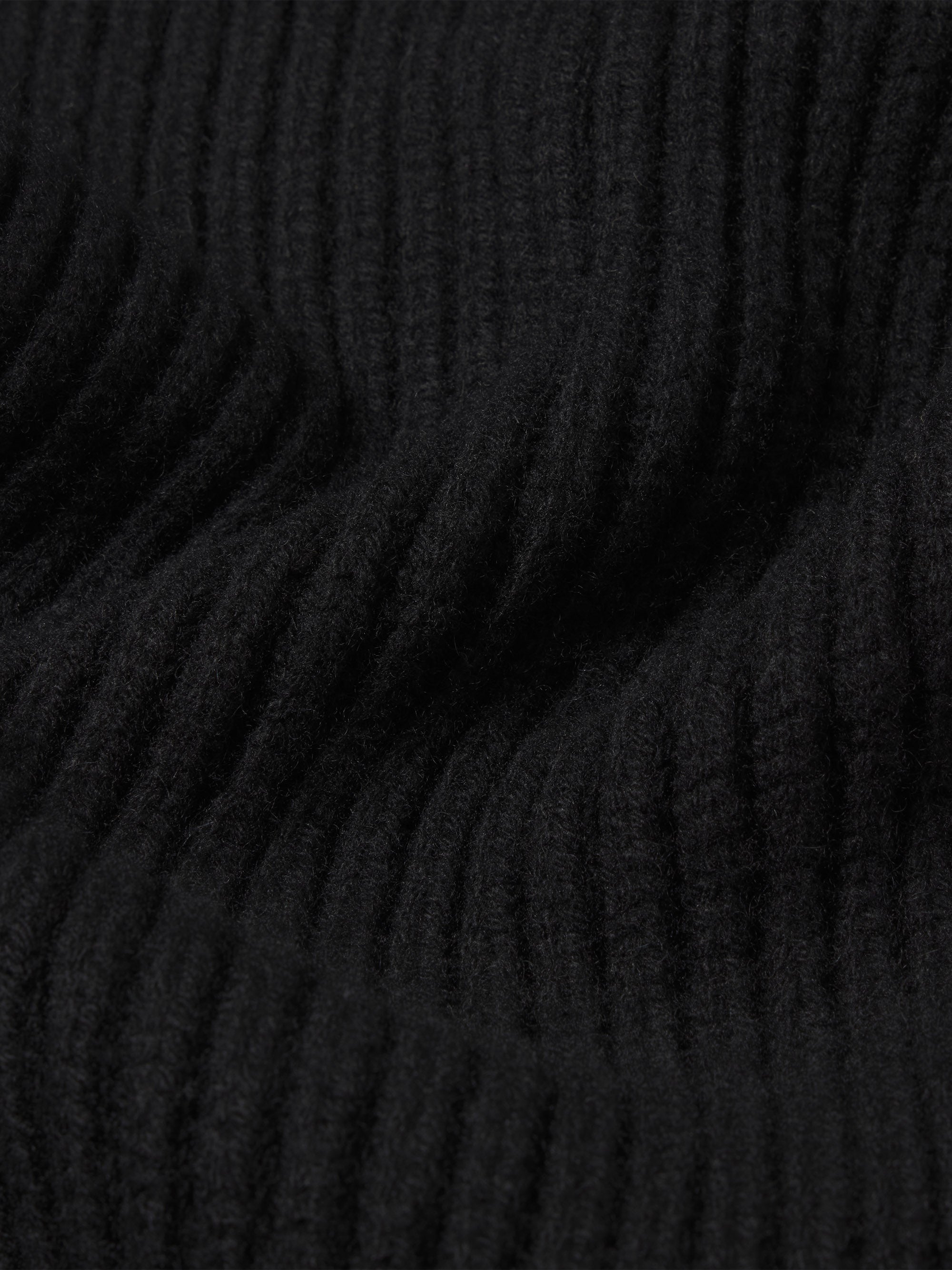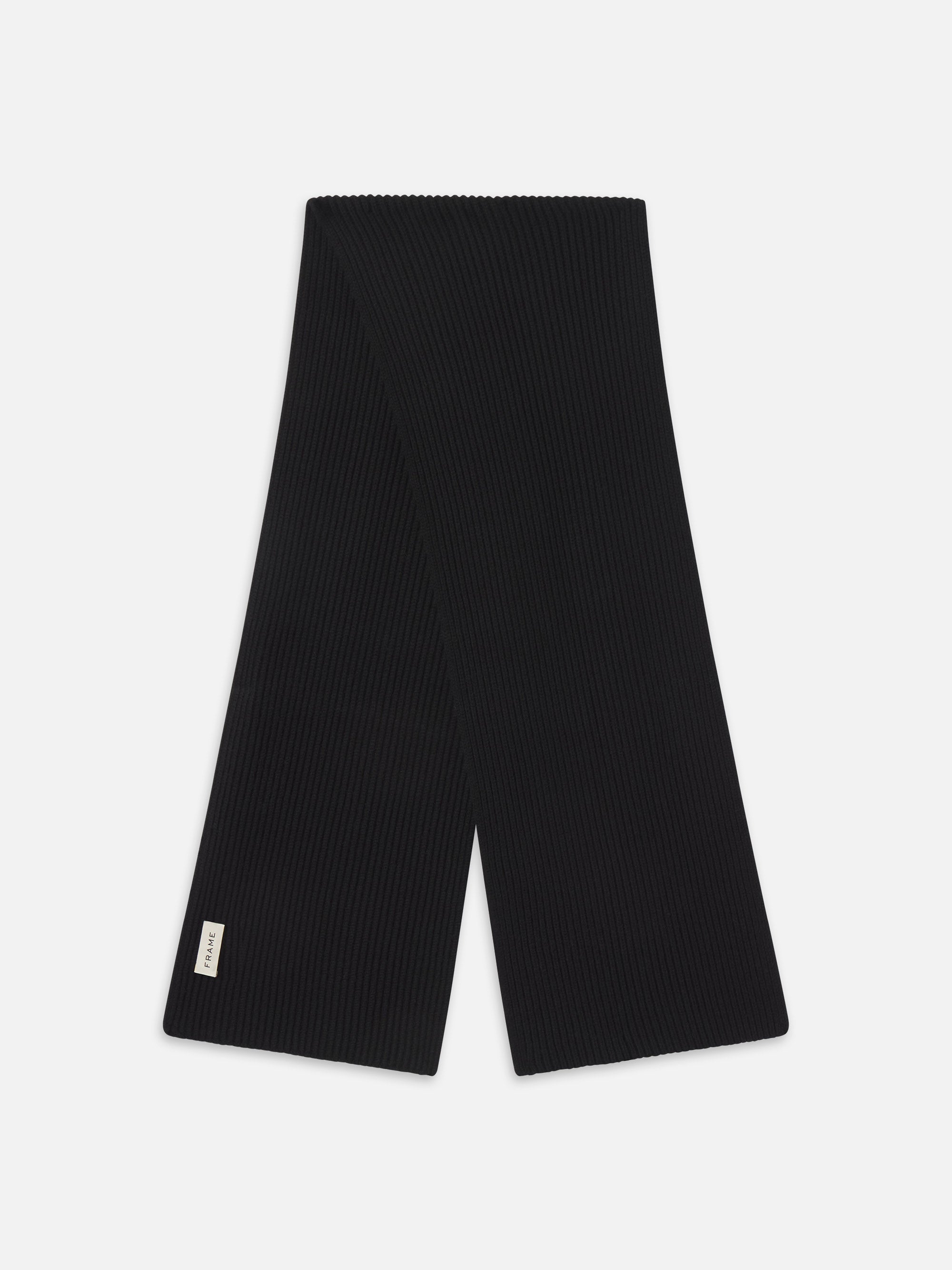This clean and simple ribbed black scarf is a seasonal must — and makes a great gift. Knit in warm, soft, wool/cashmere yarn. Pair with the matching Knit Beanie.