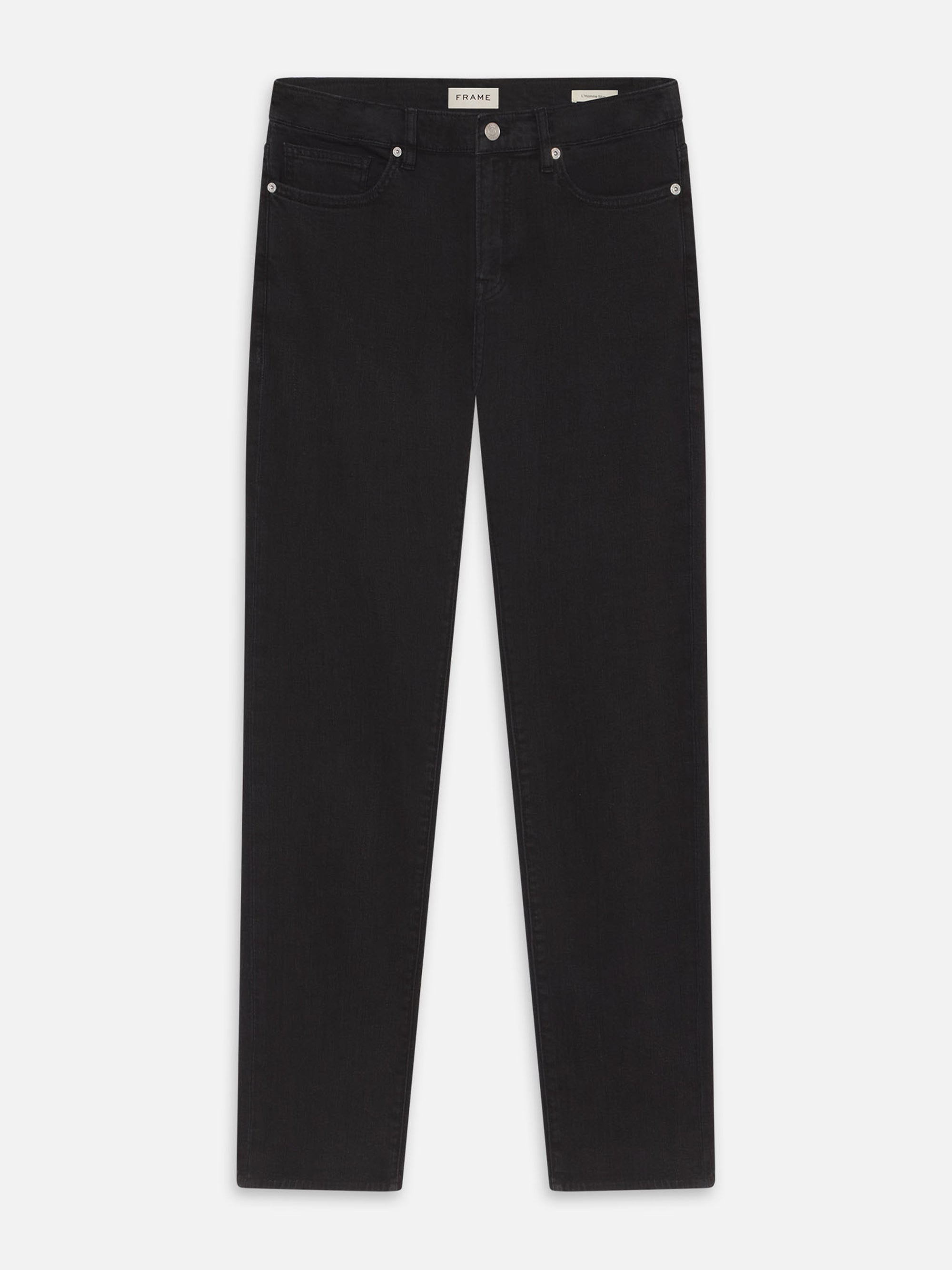A FRAME signature jean, this style is designed with a classic 5-pocket construction, comfortable mid rise, flattering straight leg, and tapered slim fit at the leg opening. Crafted from smooth Structured Stretch denim in a black wash.