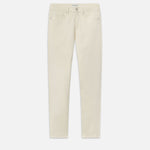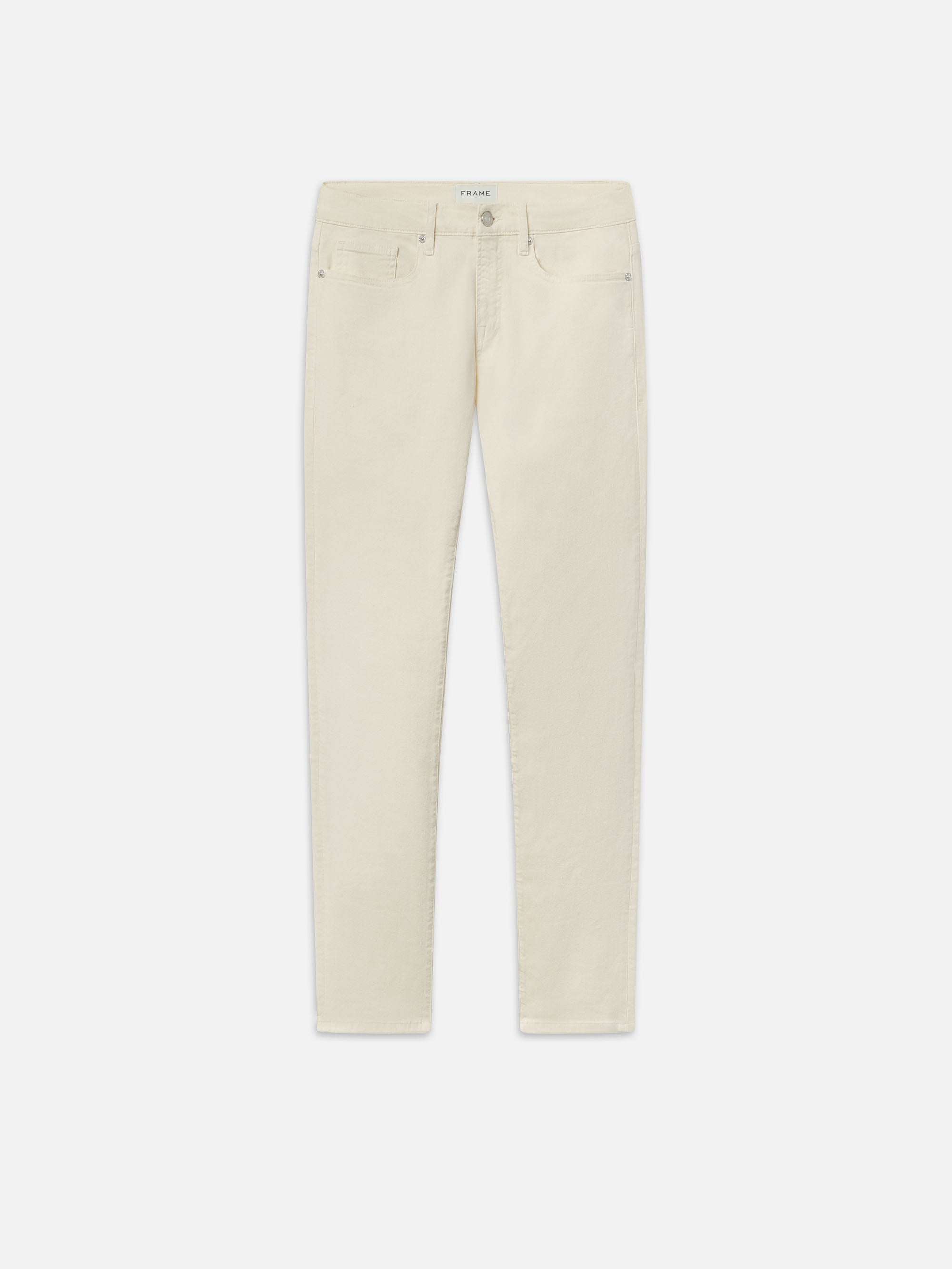 A FRAME signature jean, this style is designed with a classic 5-pocket construction, comfortable mid rise, flattering straight leg, and tapered slim fit at the leg opening. Crafted from smooth comfort stretch twill in neutral cream.