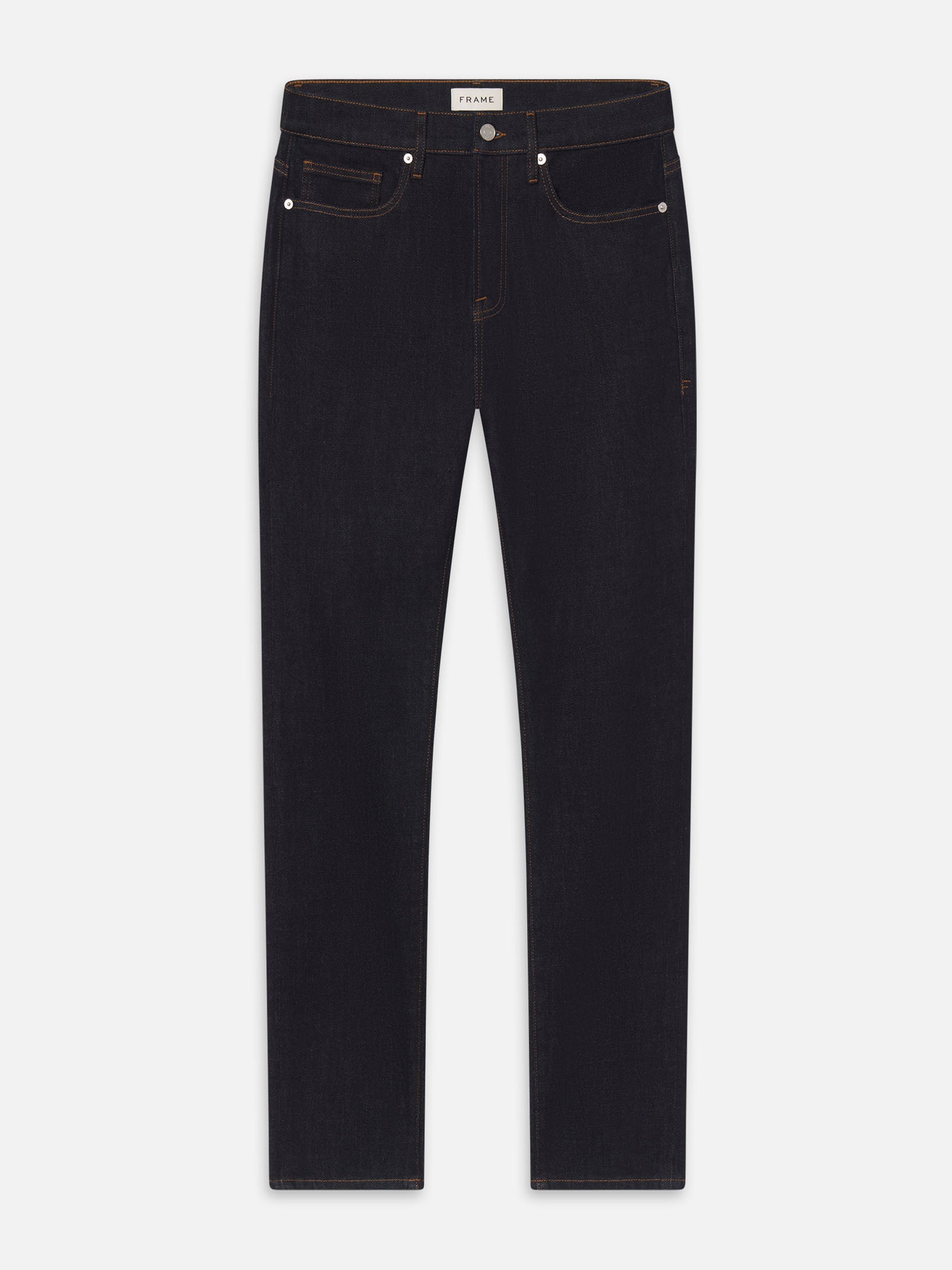 The FRAME signature slim straight leg fit, cut from responsibly washed premium denim. Featuring classic 5-pocket construction, substantial weight with a little stretch, a comfortable mid-rise waist, and a slim straight leg with slight tapering to the cuff.