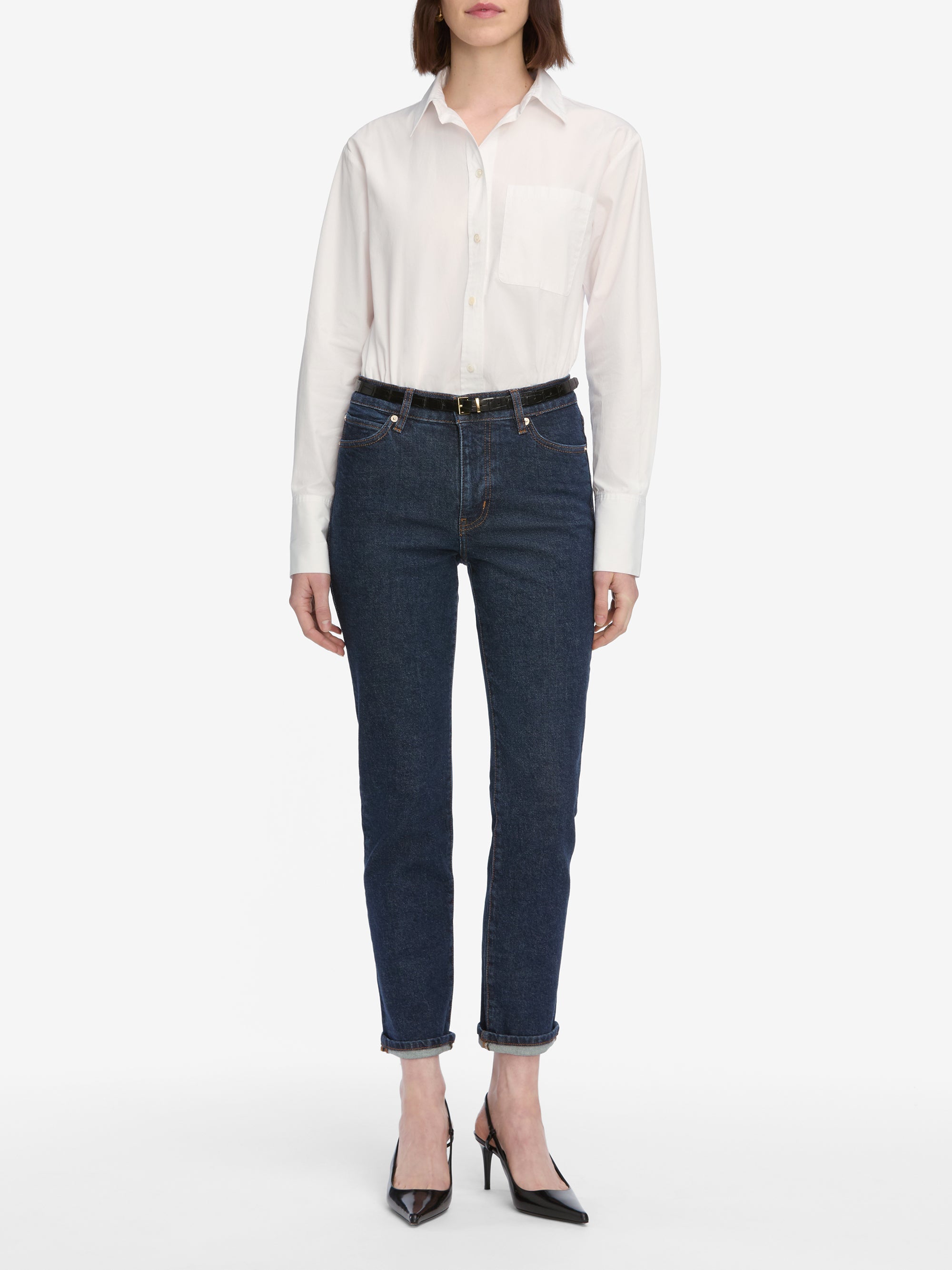 A boyfriend jean for the new millennium, this mid-rise silhouette hugs the hip and finishes into an ankle-length inseam. We love to style it with a 1” cuff, though you're free to unroll it for a longer look. Cut in our Structured Stretch denim for a vintage look with modern comfort.