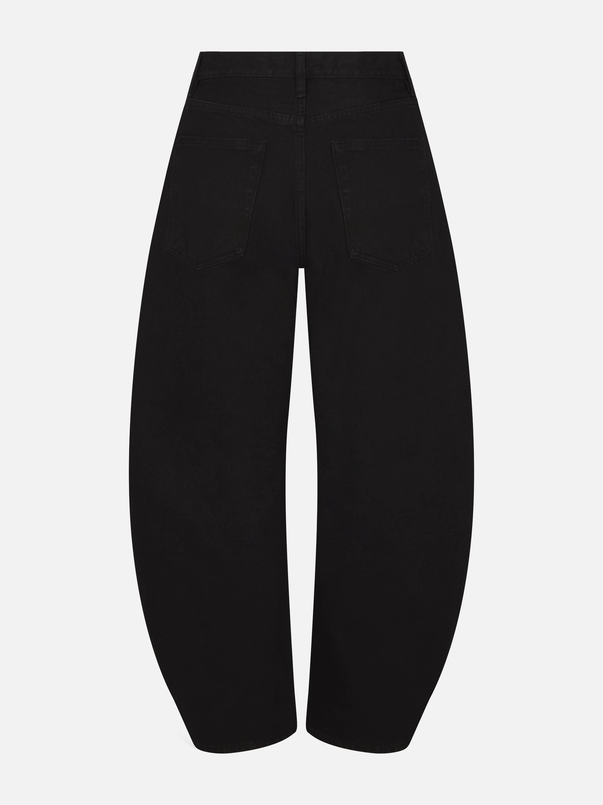 An exaggerated take on the trending barrel silhouette, this unique fit is your new closet necessity. With a flattering high rise, these jeans feature a curved outseam for a playful bubble effect. Designed to be worn cuffed and hit at the ankle, the 2.5" twice-rolled cuff can be unrolled for a longer, more dramatic inseam.