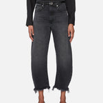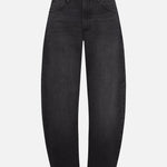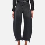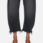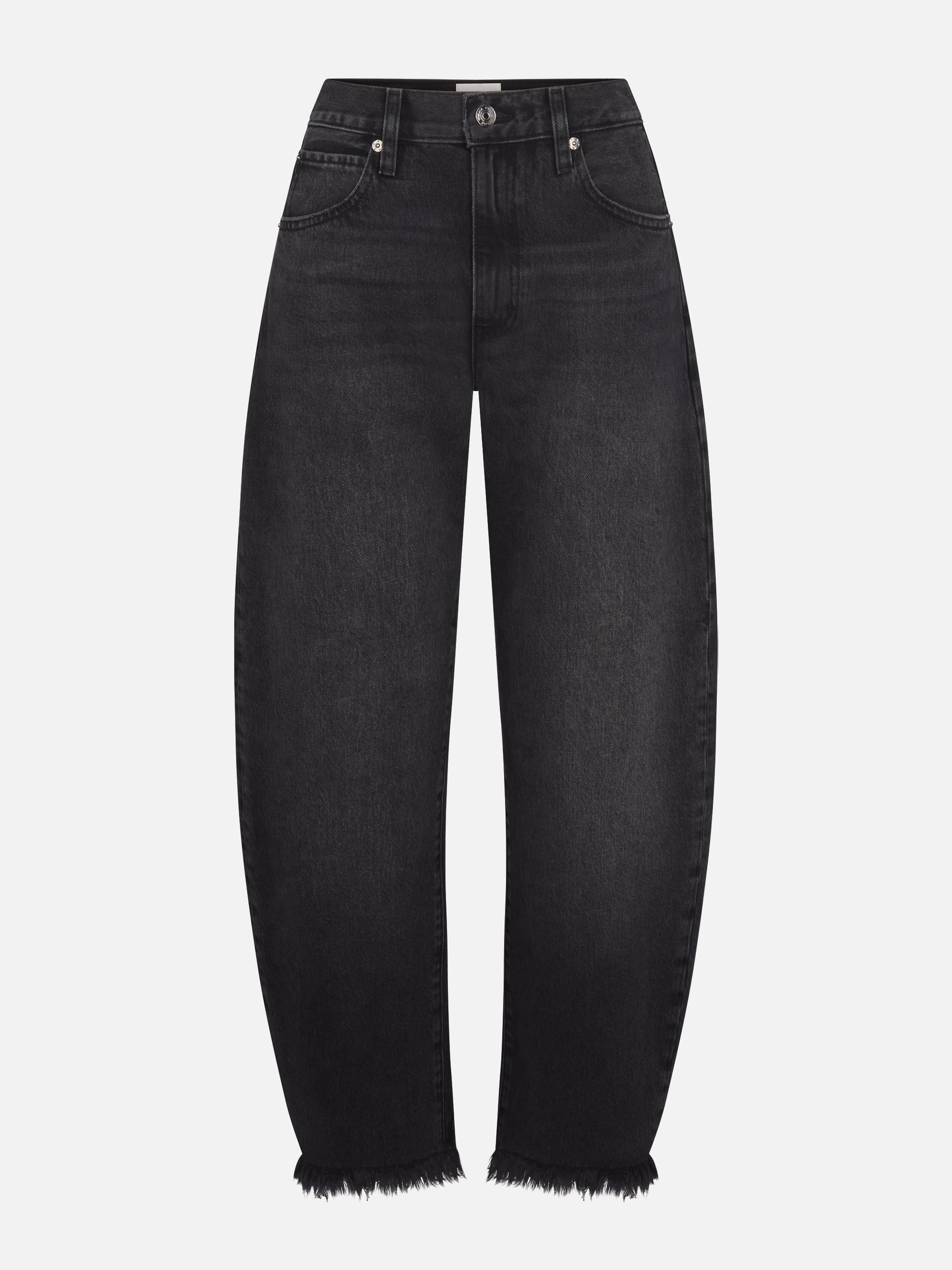 The best-selling Bubble, now with a shorter 27" inseam. The exaggerated take on the trending barrel silhouette is a unique fit and instant closet necessity. With a flattering high rise, these jeans have a curved outseam for a playful bubble effect. Note the dark wash and raw, fringed hem for a pre-loved look.